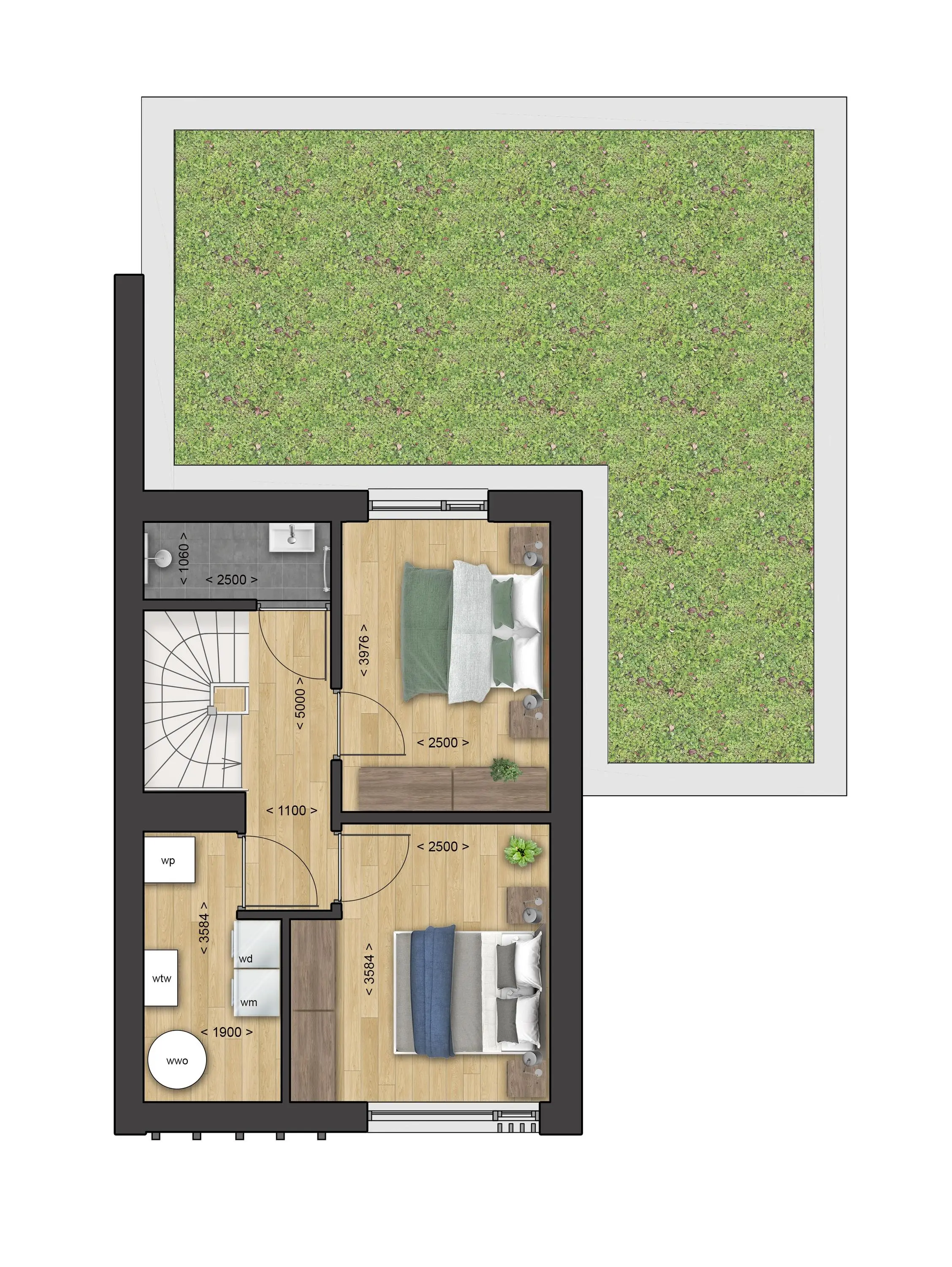Op de verdieping zijn een tweetal mooie, ruime slaapkamers van ca. 18m² en 19m². De badkamer ligt daartussen en beschikt over een douche, wastafel en toilet. Tegelwerk en sanitair behoort tot de koopsom en is uitgewerkt in een brochure met een visualisatie daarvan. Deze afwerking is ook voor het toilet beneden.