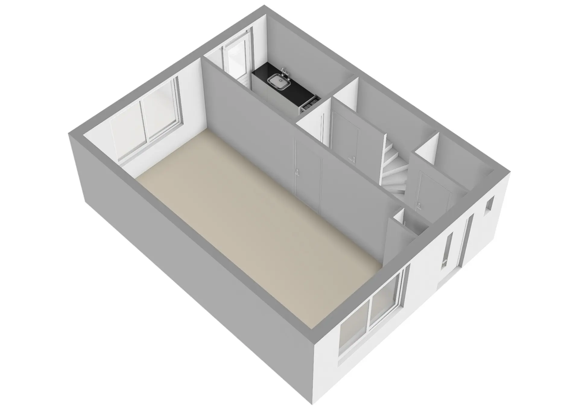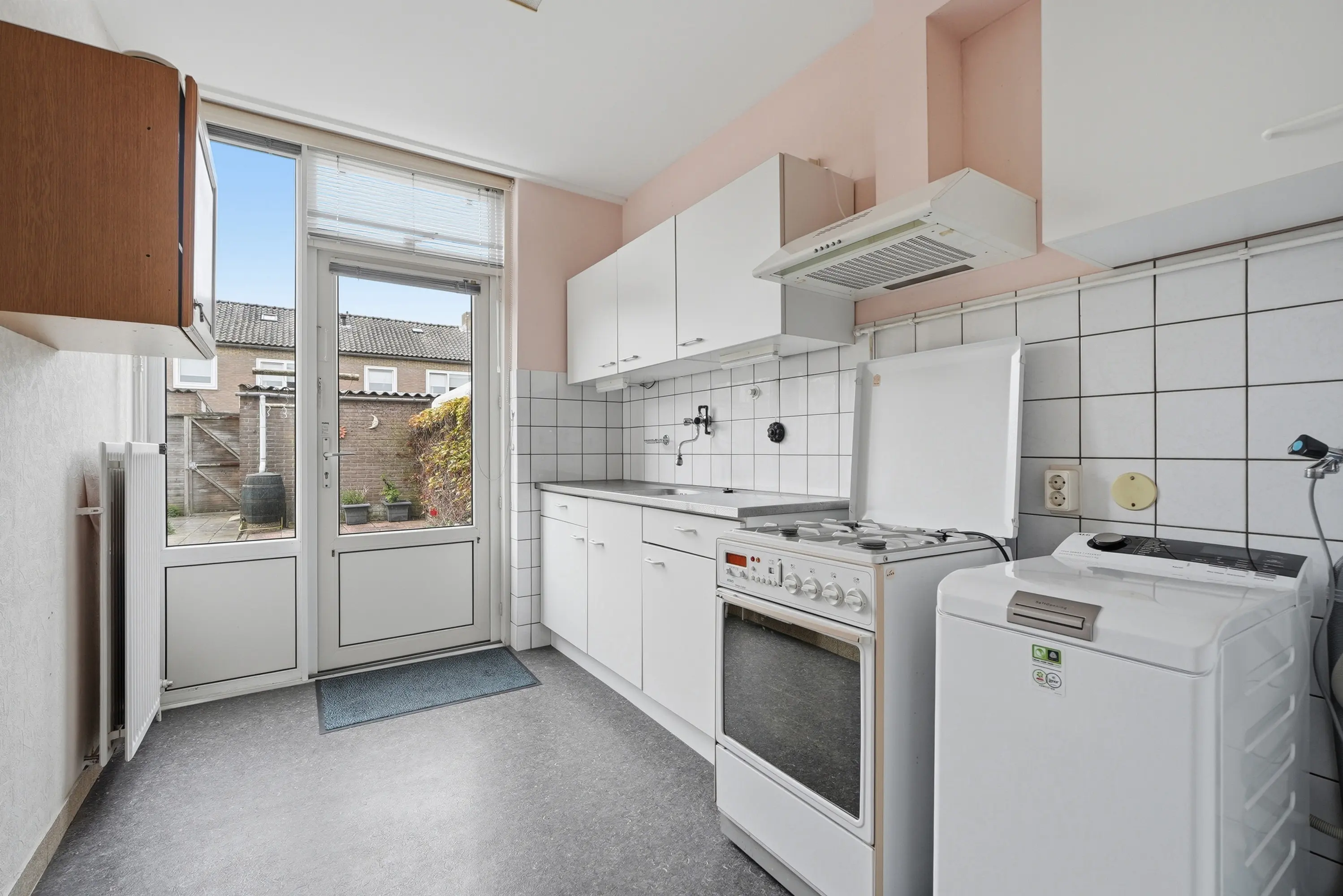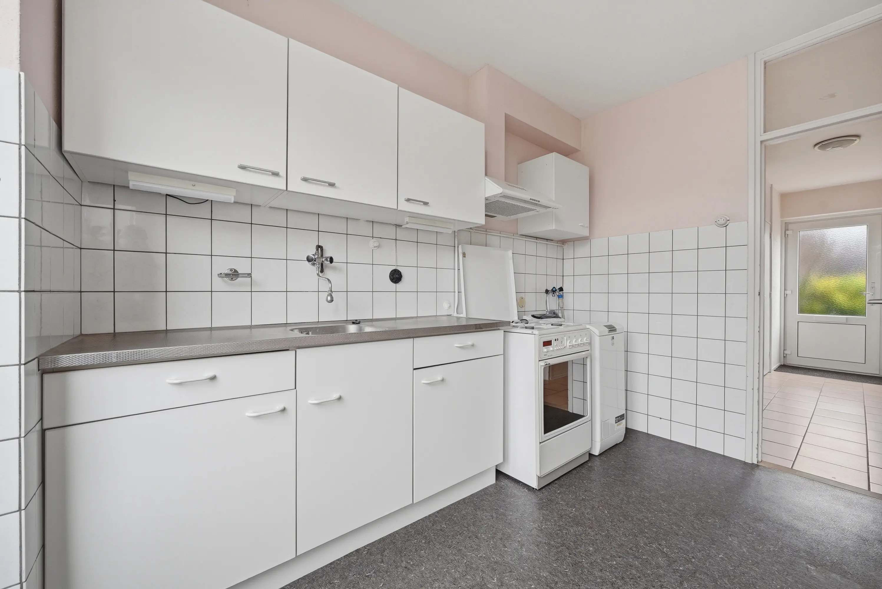 Entree in hal met meterkast, toilet, trapkast, trapopgang naar de 1e verdieping en doorgang naar de woonkamer en keuken. De woonkamer is heerlijk licht en ruim van opzet, daarmee meer dan genoeg ruimte voor een mooie zit- en eethoek. De grote raampartijen zijn voorzien van elektrisch bedienbare screens. De gesloten keuken, die u via de hal aantreft is eveneens ruim van opzet en is ingericht met een nette maar eenvoudige keukenopstelling. Indien gewenst kunt u de wand tussen de woonkamer en keuken, met behulp van een stalen balk openmaken zodat er één ruim woonvertrek ontstaat. Vanuit de keuken is de zonnige tuin te bereiken.