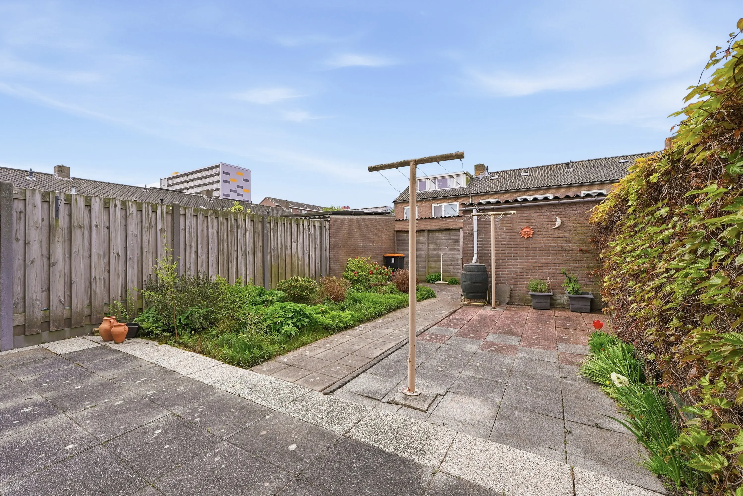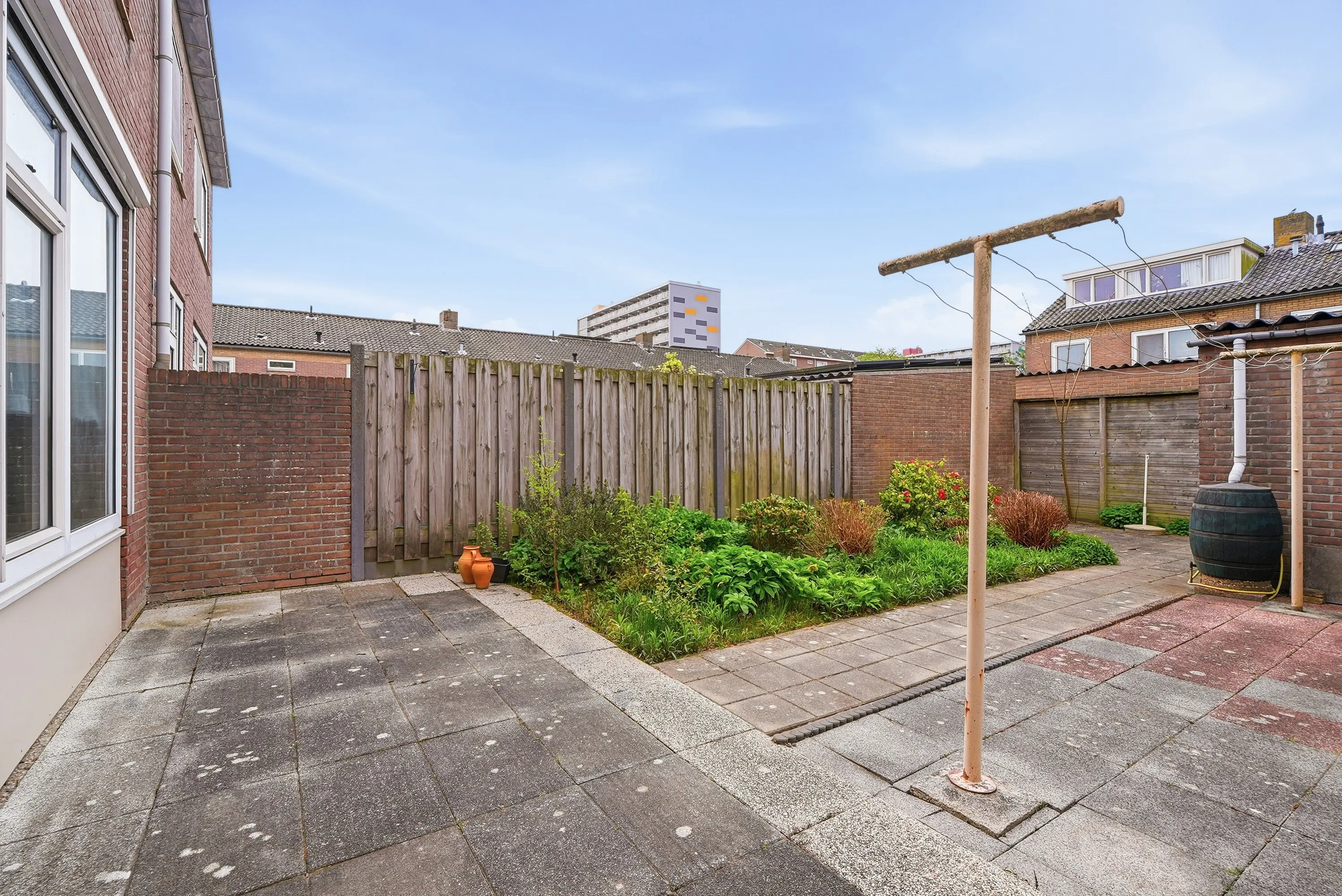 De zonnige tuin is echt keurig aangelegd met sierbestrating en een grote groenborder aan de linkerzijde van de tuin. Tegen de woning heeft u ruimte voor een gezellig terras. Achter in de tuin treft u een stenen berging voor bijvoorbeeld het stallen van de fietsen of het opbergen van het tuingereedschap. Naast de berging bevindt zich de vrije achterom.