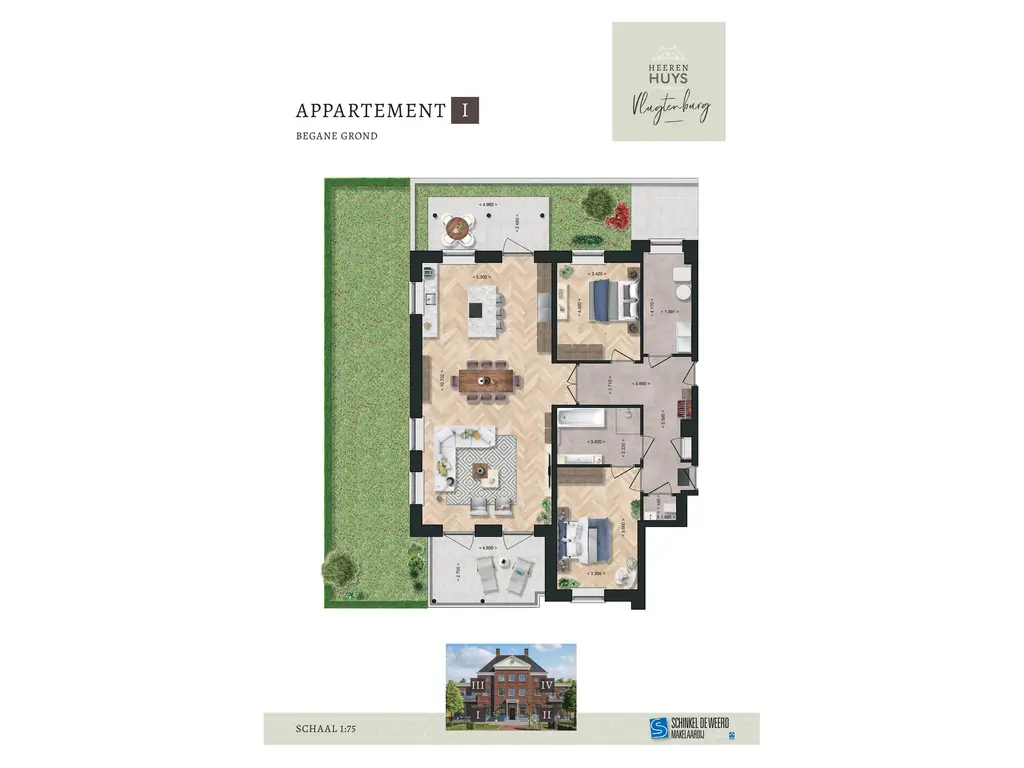 Via de statige, centrale entree van Heerenhuys Vlugtenburg betreedt u Appartement 1. De hal van dit appartement brengt u rechtstreeks naar de enorme living van totaal ruim 56 vierkante meter. Wie graag goed gezelschap ontvangt zet een flinke eetkamertafel in het hart van dit appartement, voor heerlijke, gezellige avonden tussen de open woonkamer en keuken. De living heeft aan beide zijden een balkon om desgewenst van de zon of de koelte te genieten. Het appartement wordt geflankeerd door twee grote slaapkamers, waarvan er één direct met de badkamer verbonden is. Appartement 1 heeft een praktische, grote bijkeuken/wasruimte waar zelfs nog bergruimte is. In de hal zijn bovendien nog een gastentoilet en garderobe gesitueerd.