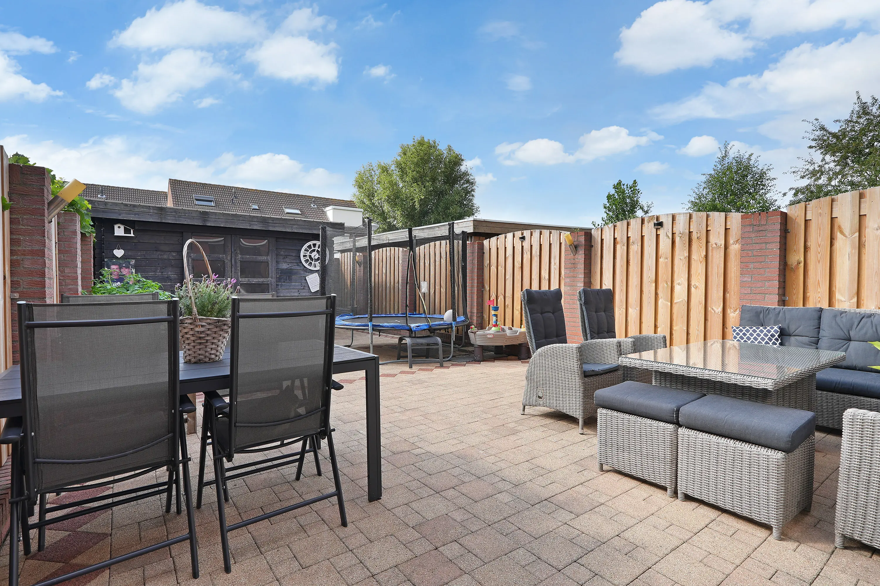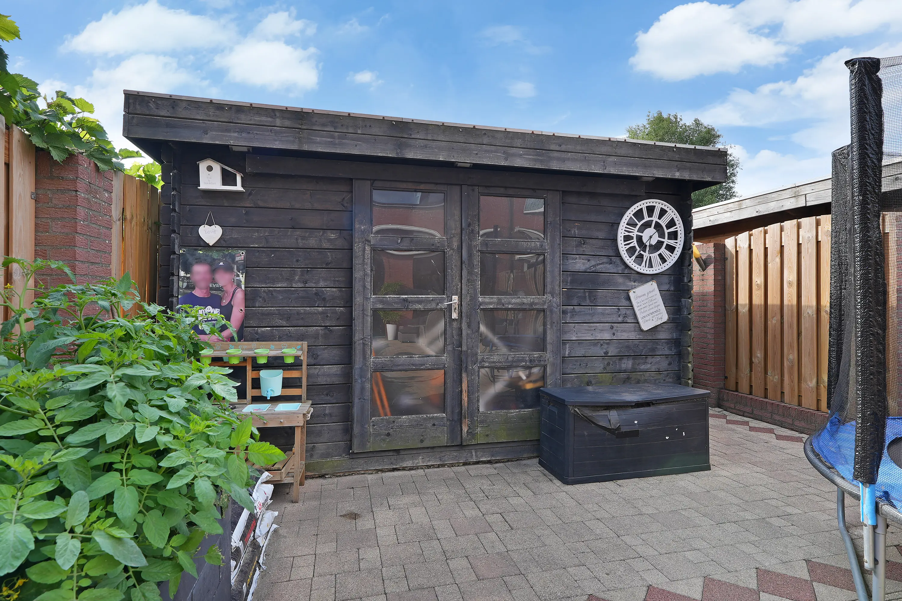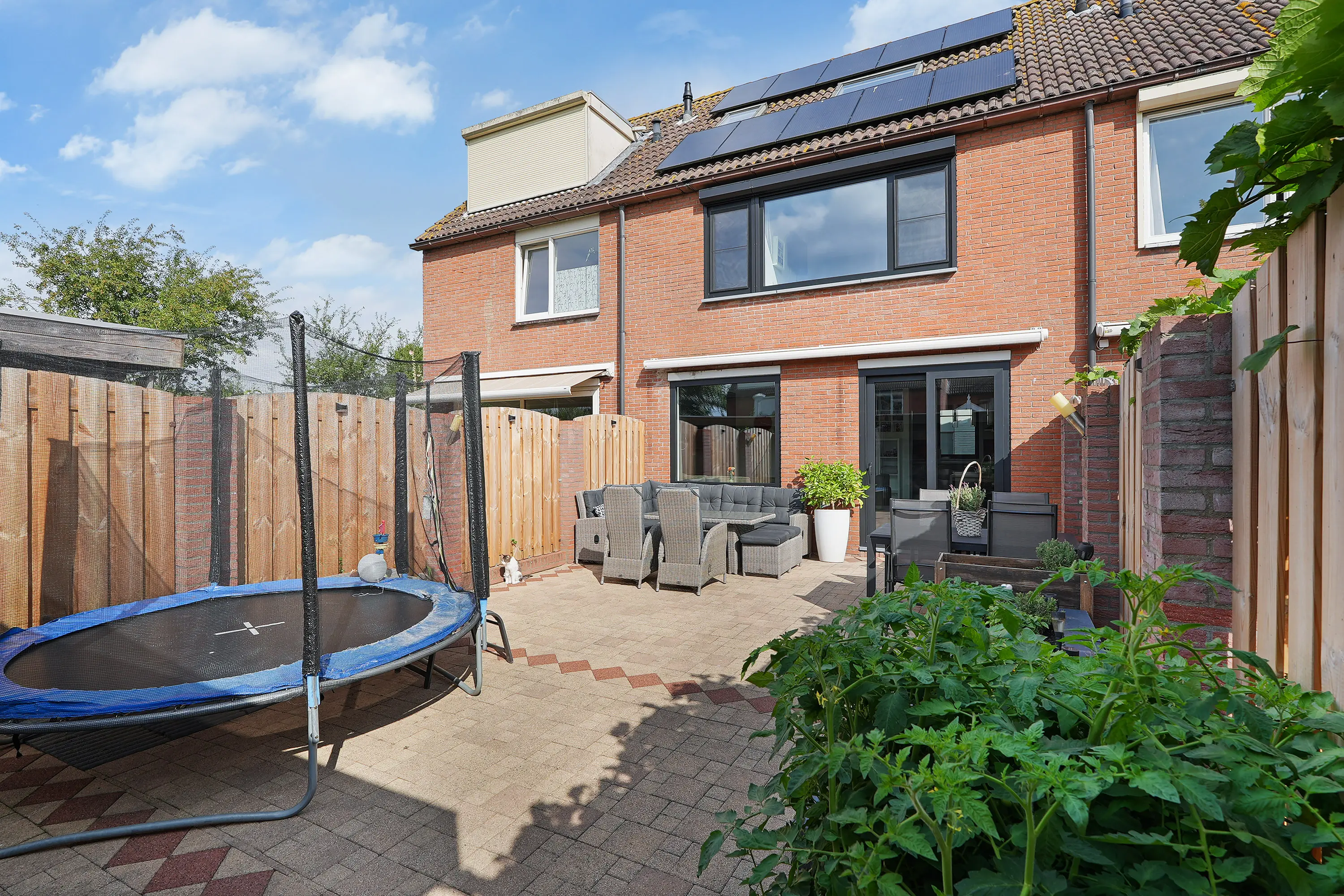 De zonnige tuin is keurig aangelegd met sierbestrating, groenborder en een fraaie schutting in de vorm van houtenpanelen en gemetselde penanten. Een heerlijke plek waar u kunt genieten van zowel de zon als de schaduw door middel van het zonnescherm. Achter in de tuin treft u een houten tuinhuis met daarnaast de vrije achterom naar het parkeerpleintje.