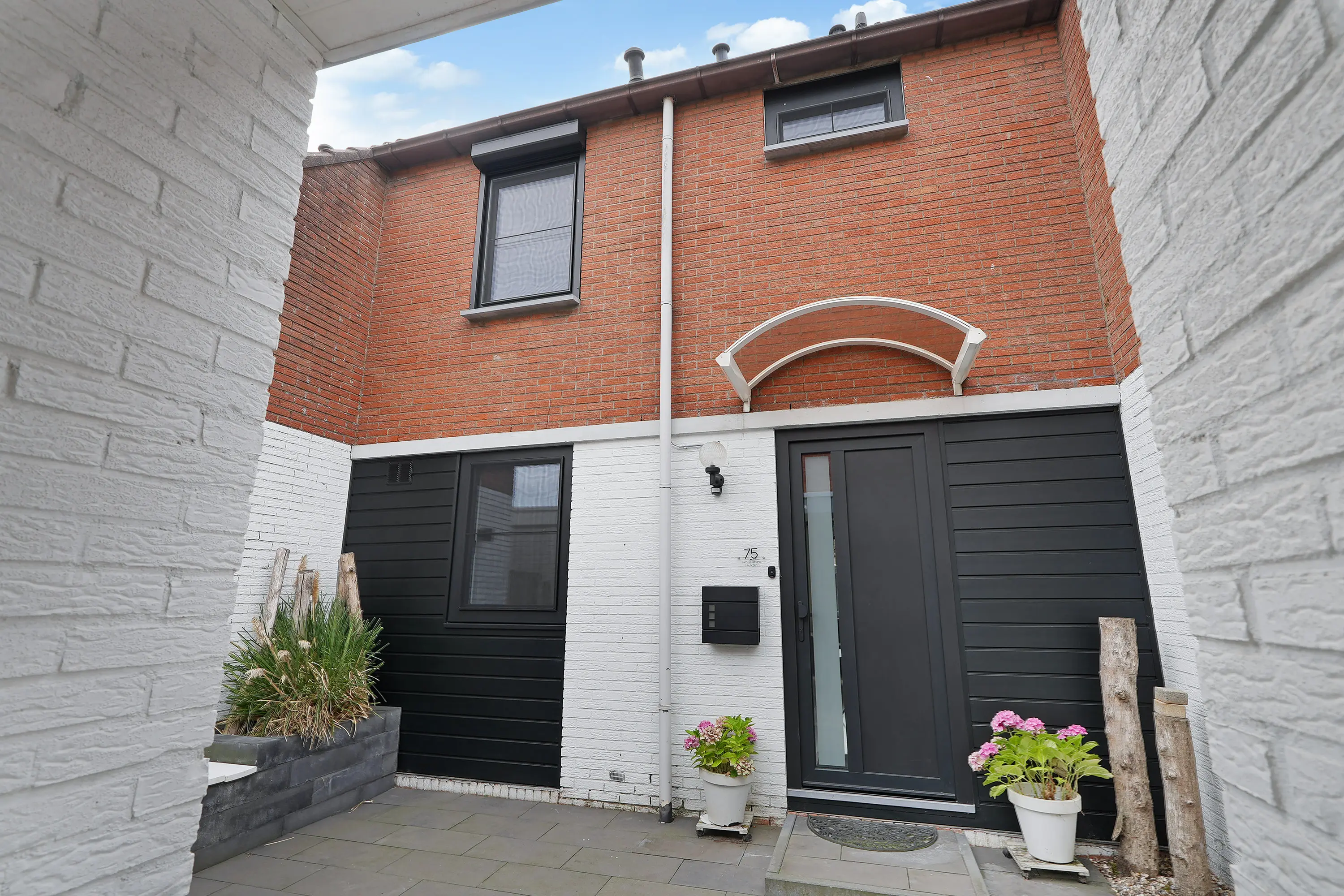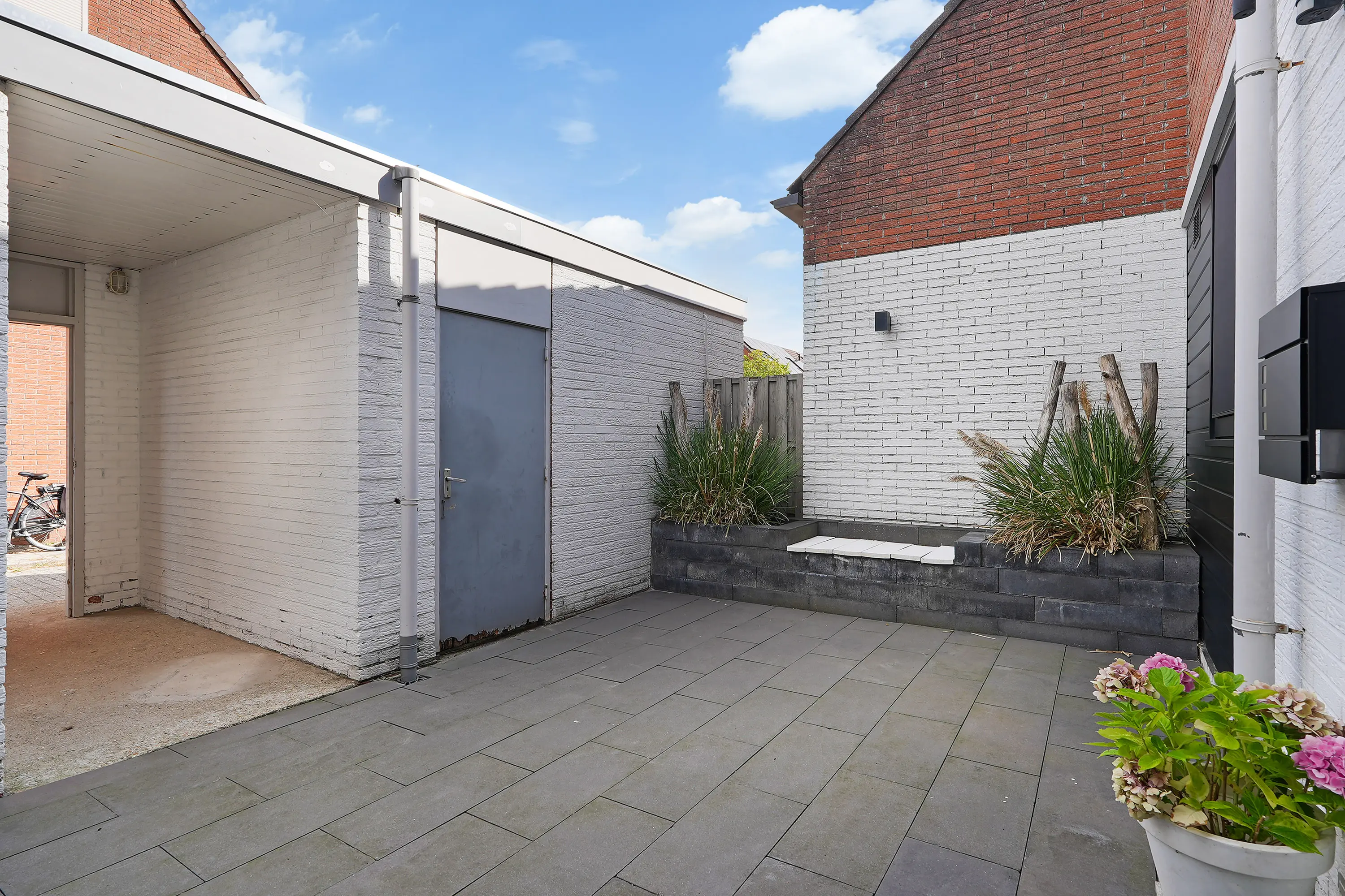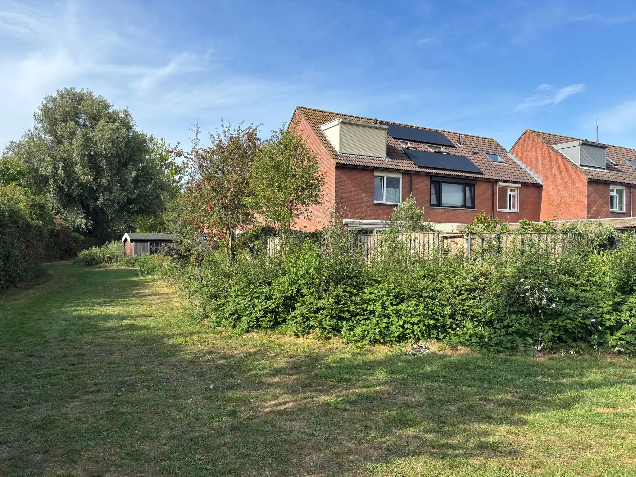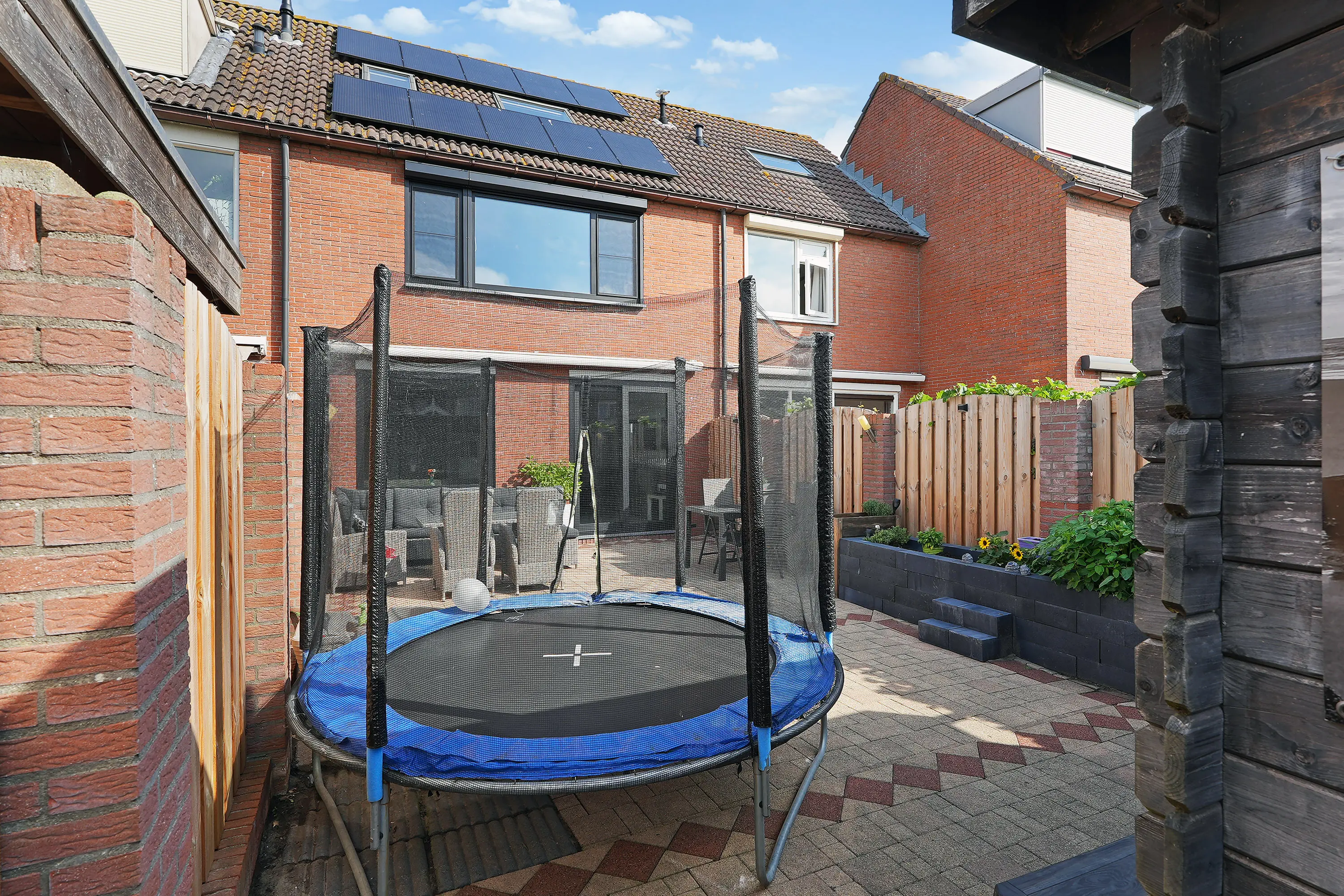 De zonnige tuin is keurig aangelegd met sierbestrating, groenborder en een fraaie schutting in de vorm van houtenpanelen en gemetselde penanten. Een heerlijke plek waar u kunt genieten van zowel de zon als de schaduw door middel van het zonnescherm. Achter in de tuin treft u een houten tuinhuis met daarnaast de vrije achterom naar het parkeerpleintje.