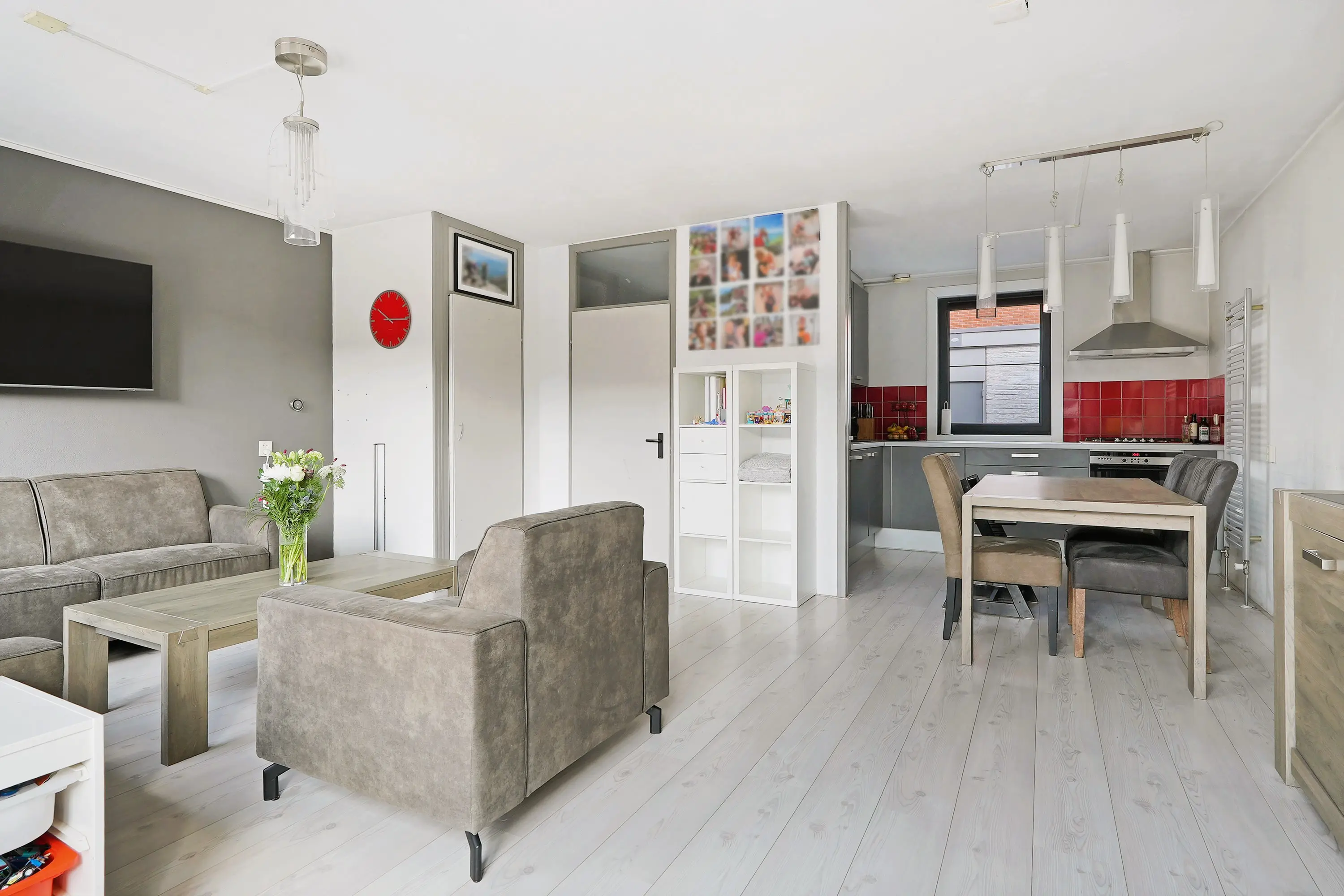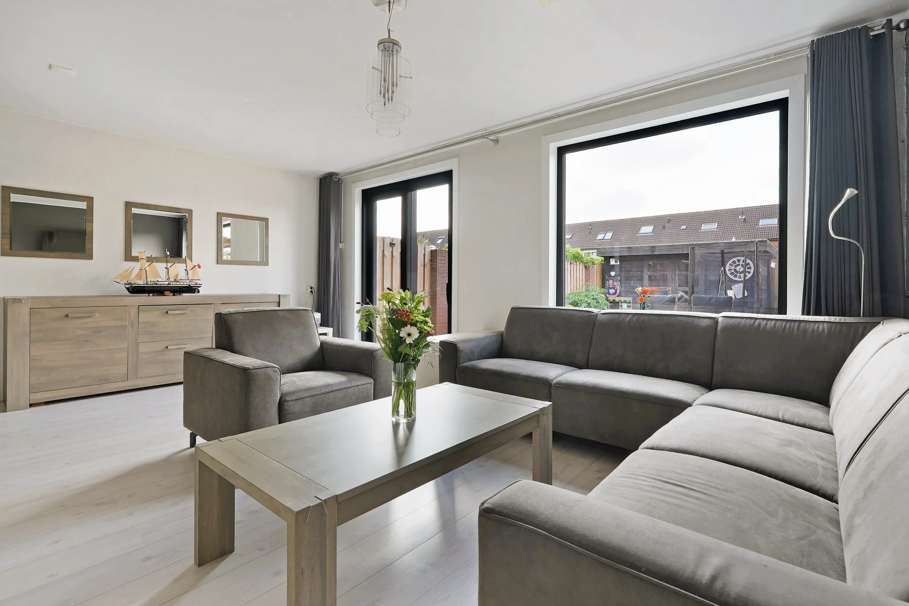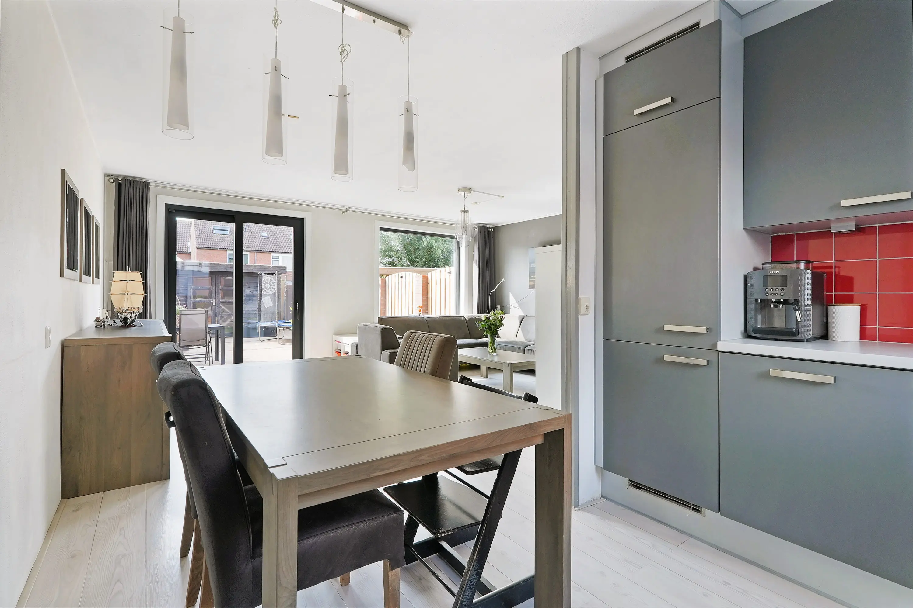 Entree in hal met meterkast, toilet, trapopgang en doorgang naar de woonkamer. De tuingerichte woonkamer is riant van opzet door de breedte verhouding van de woning. De nieuwe kozijnen donkere kozijnen zorgen voor een modern contrast in dit geheel. De zithoek treft u aan de tuinzijde en de eethoek samen met de open keuken treft u aan de voorzijde van de woonkamer. De keuken is uitgevoerd in een hoekopstelling grijze kastfronten en een licht werkblad. Verder is de keuen uiteraard voorzien van de gewenste inbouwapparatuur. Verder een trapkast voor het opbergen van bijvoorbeeld uw boodschappen of stofzuiger. Via de schuifpui bereikt u de tuin.