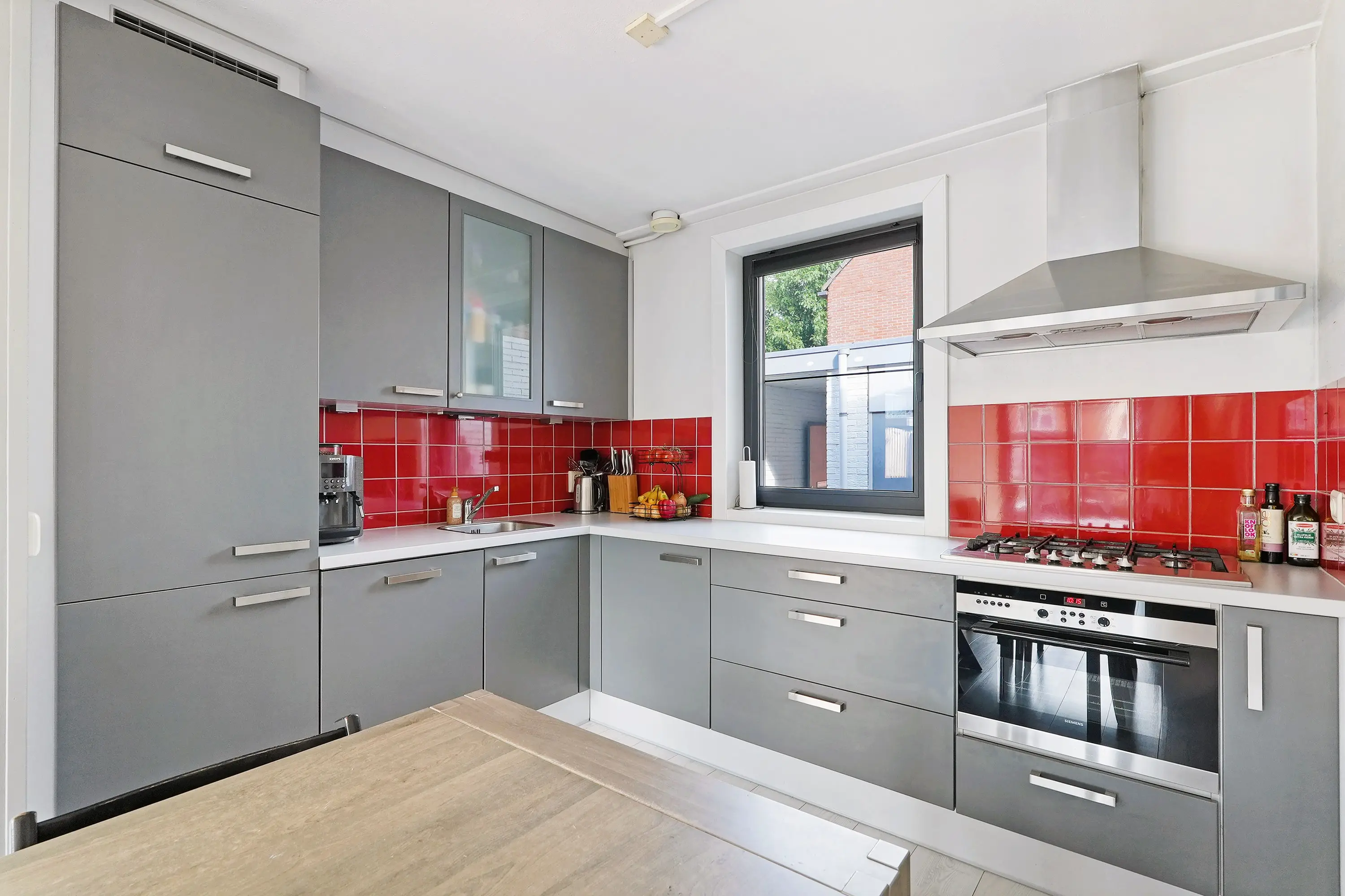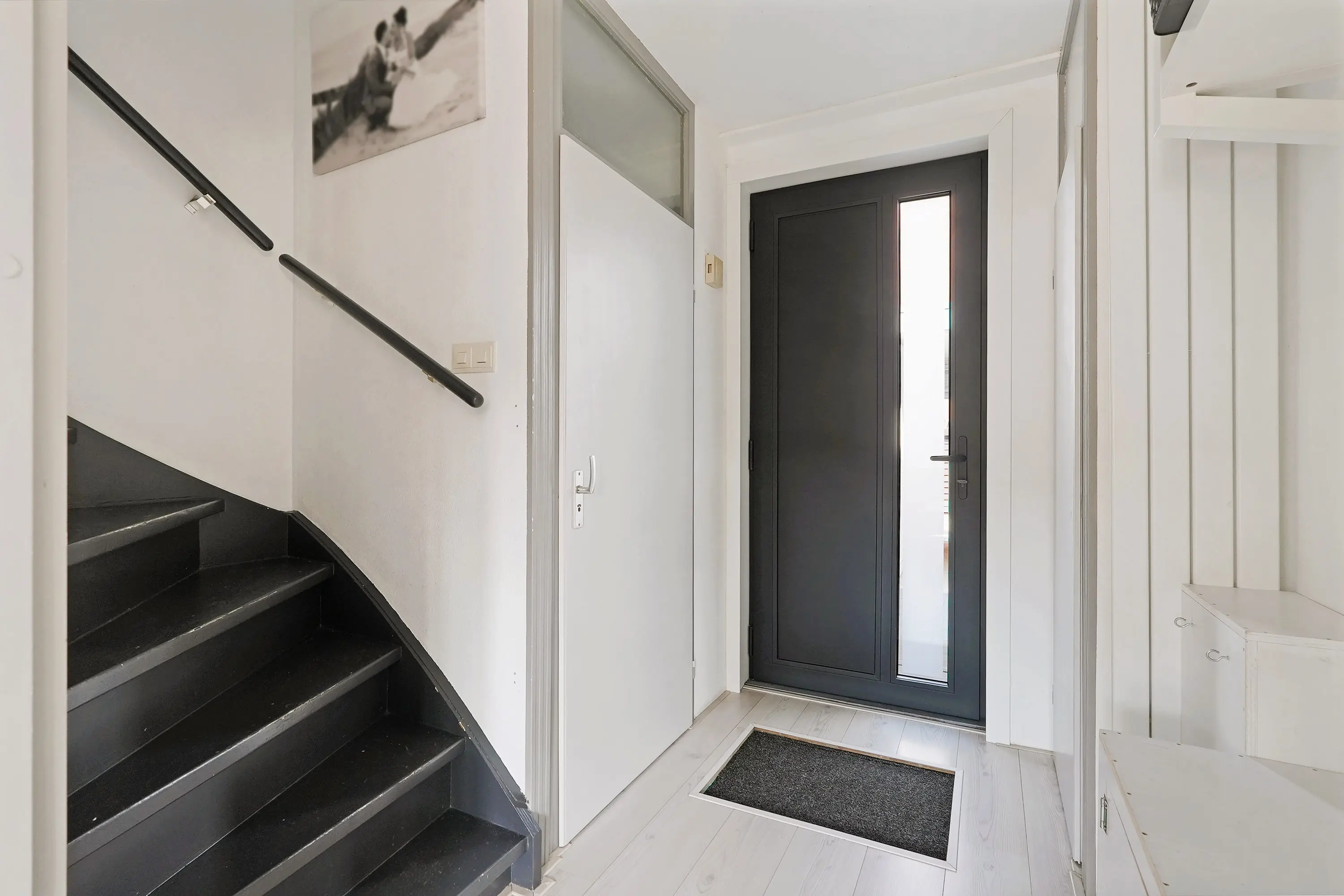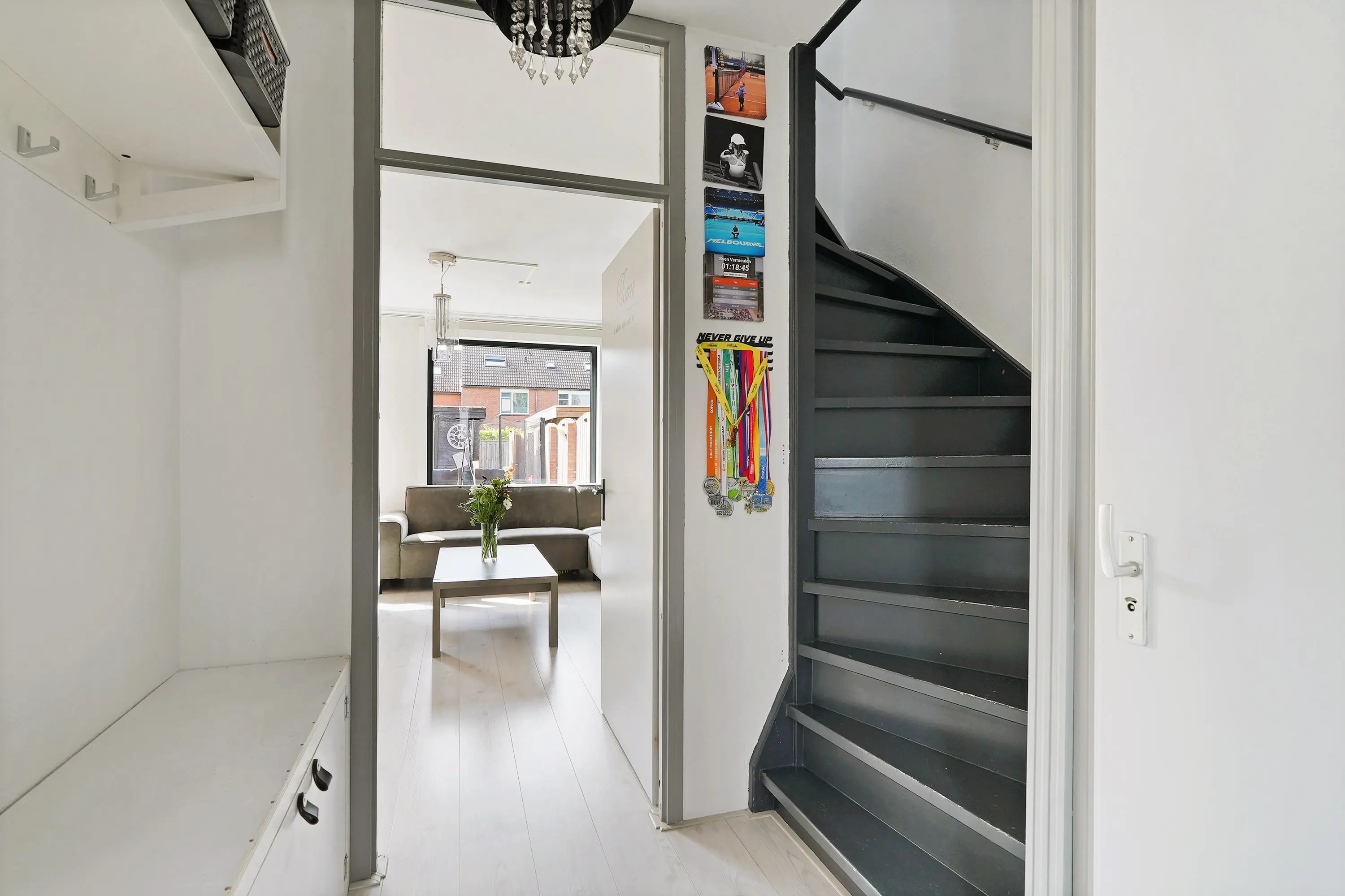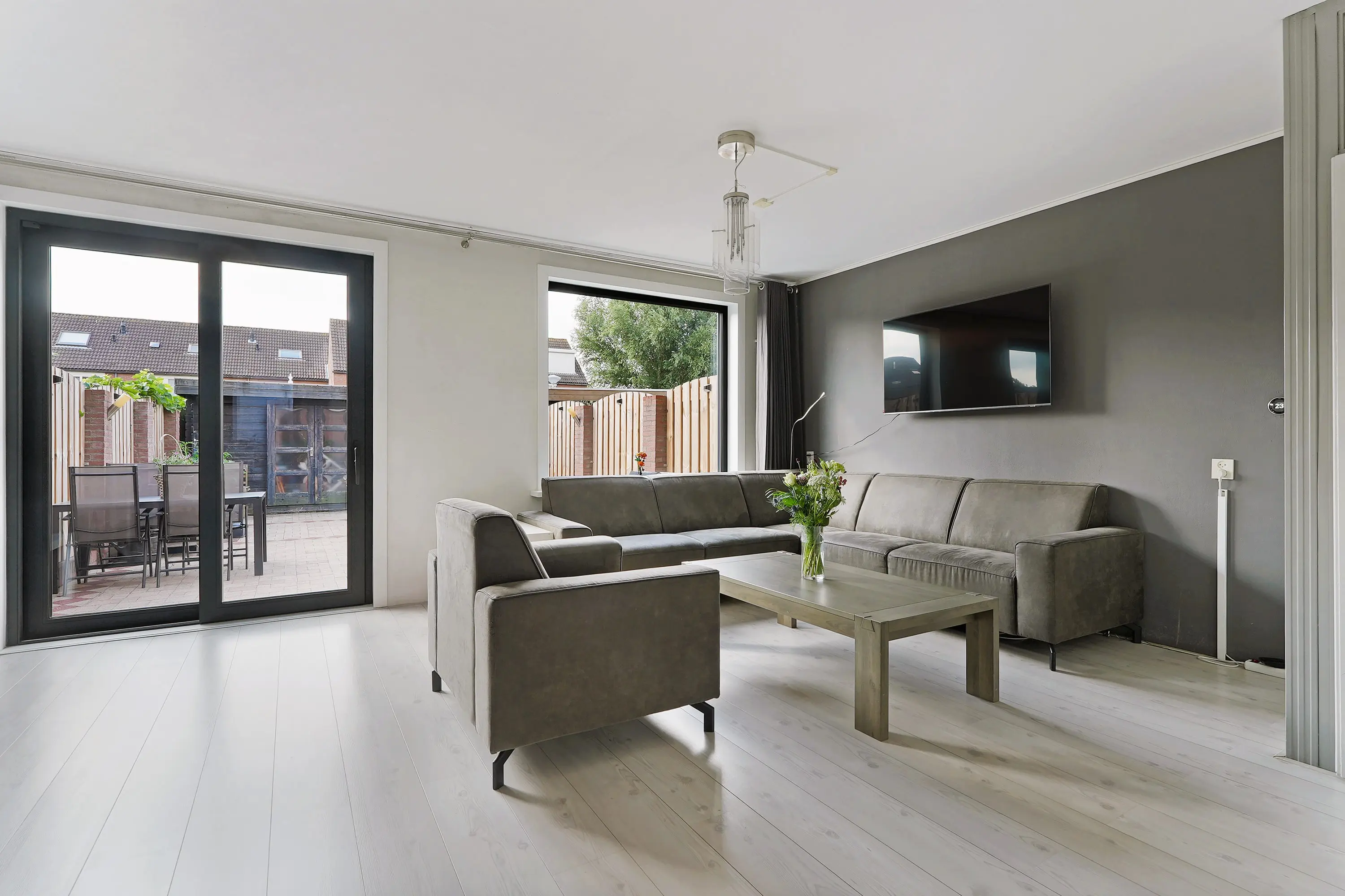 Entree in hal met meterkast, toilet, trapopgang en doorgang naar de woonkamer. De tuingerichte woonkamer is riant van opzet door de breedte verhouding van de woning. De nieuwe kozijnen donkere kozijnen zorgen voor een modern contrast in dit geheel. De zithoek treft u aan de tuinzijde en de eethoek samen met de open keuken treft u aan de voorzijde van de woonkamer. De keuken is uitgevoerd in een hoekopstelling grijze kastfronten en een licht werkblad. Verder is de keuen uiteraard voorzien van de gewenste inbouwapparatuur. Verder een trapkast voor het opbergen van bijvoorbeeld uw boodschappen of stofzuiger. Via de schuifpui bereikt u de tuin.