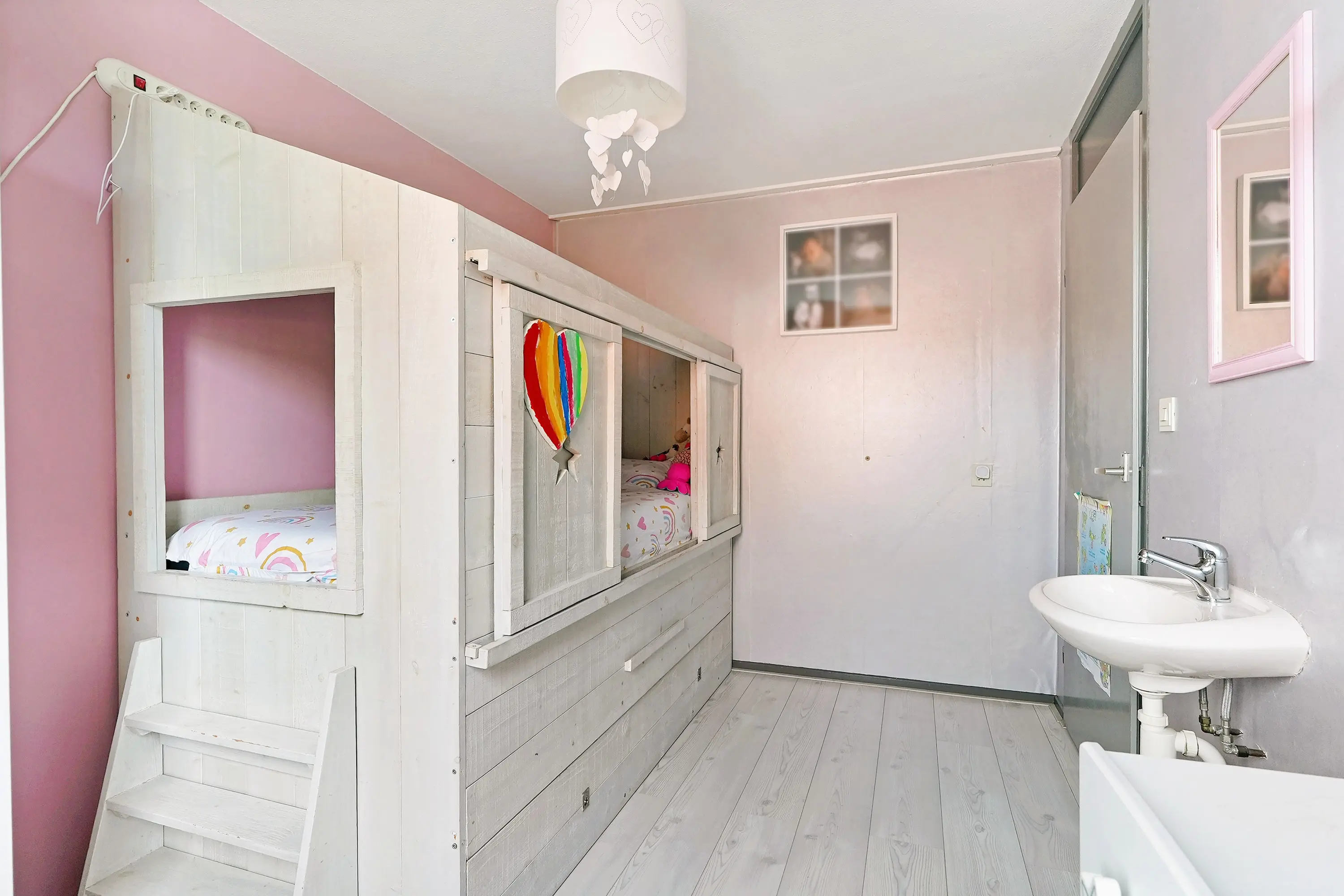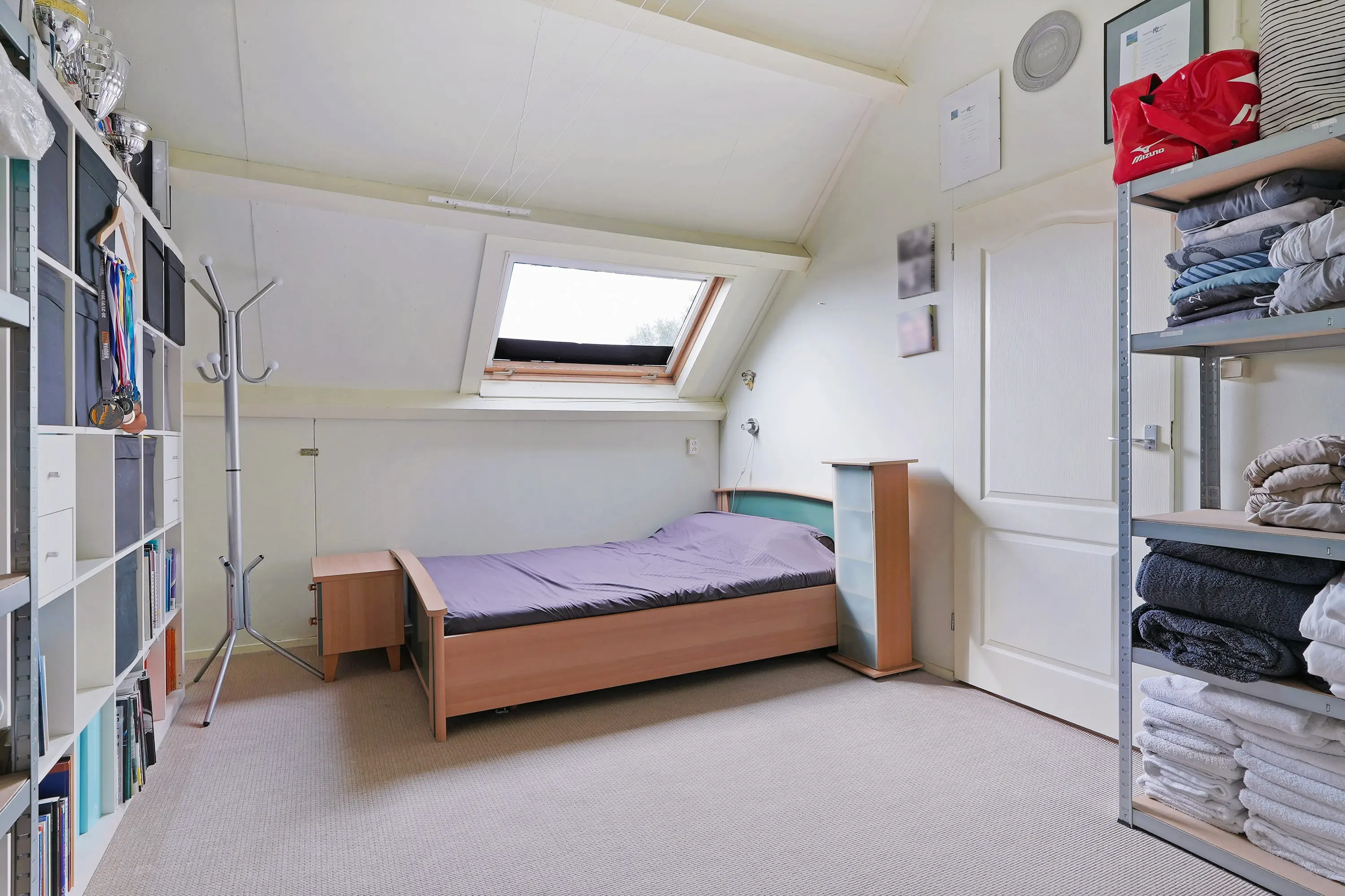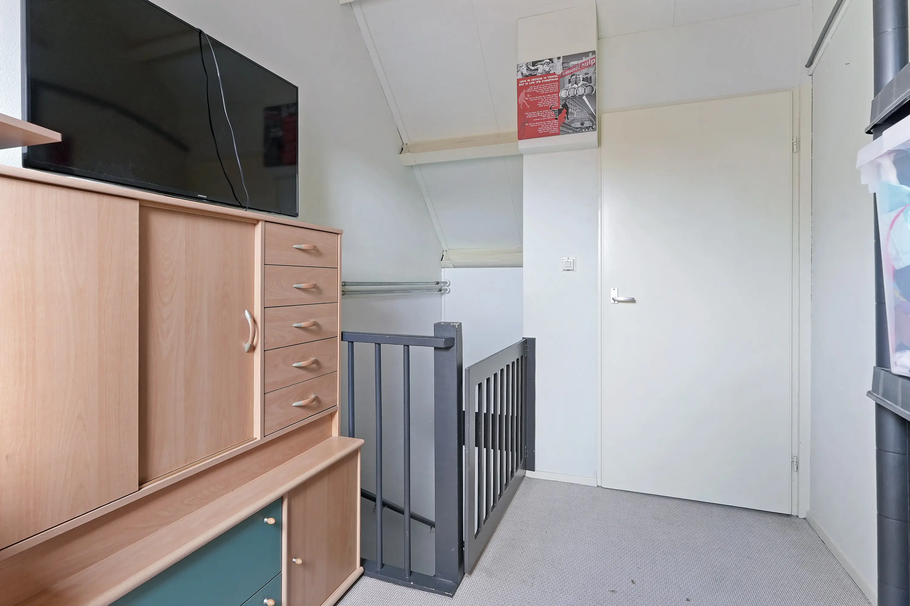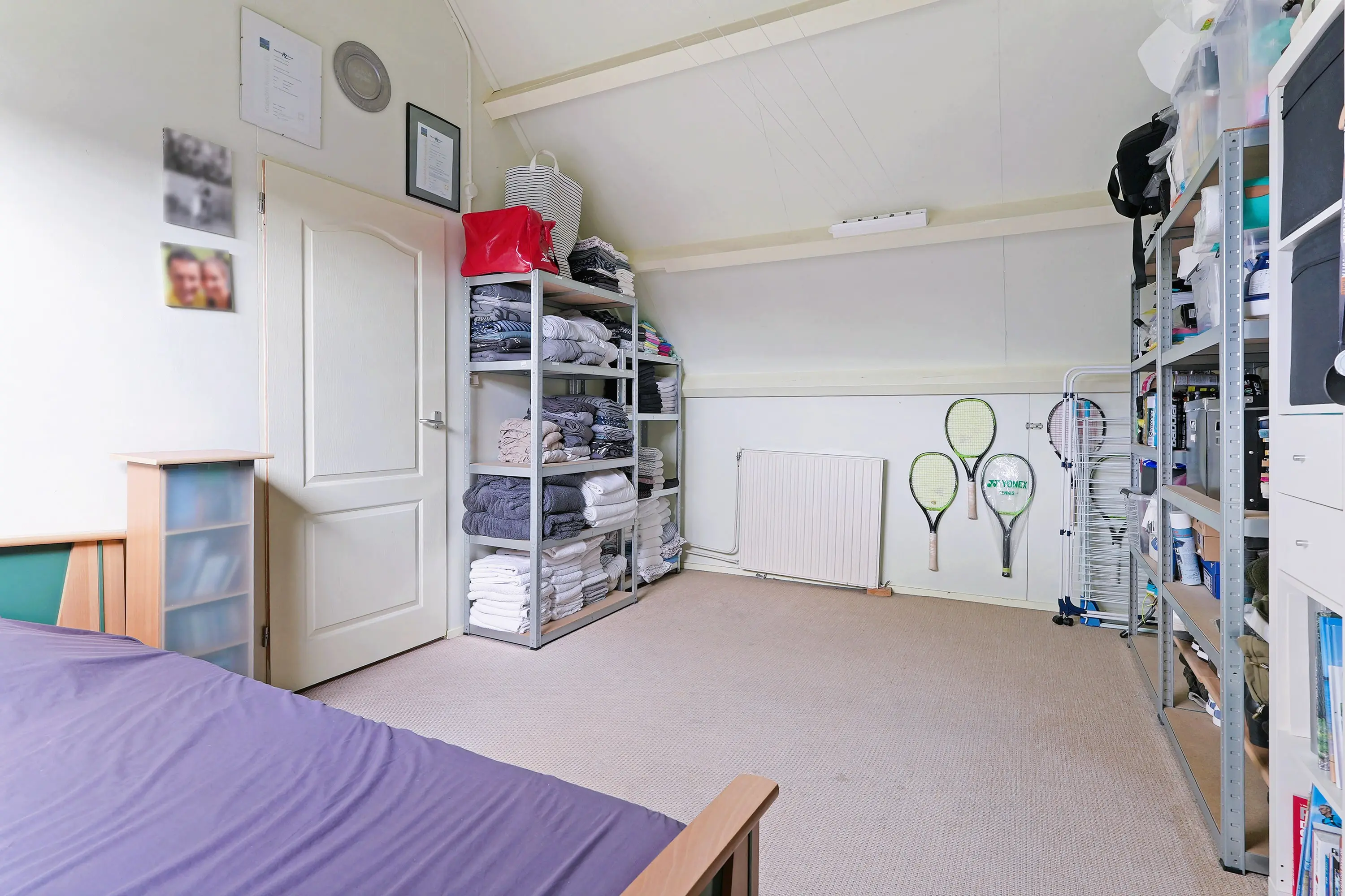 Via vaste trap bereikt u de overloop die toegang biedt tot de 4e slaapkamer. Eveneens een ruime slaapkamer met een hoge nok en bergruimte achter het knieschot. Op de overloop treft u in een kastruimte de CV ketel (2018) en de aansluitingen voor witgoed.