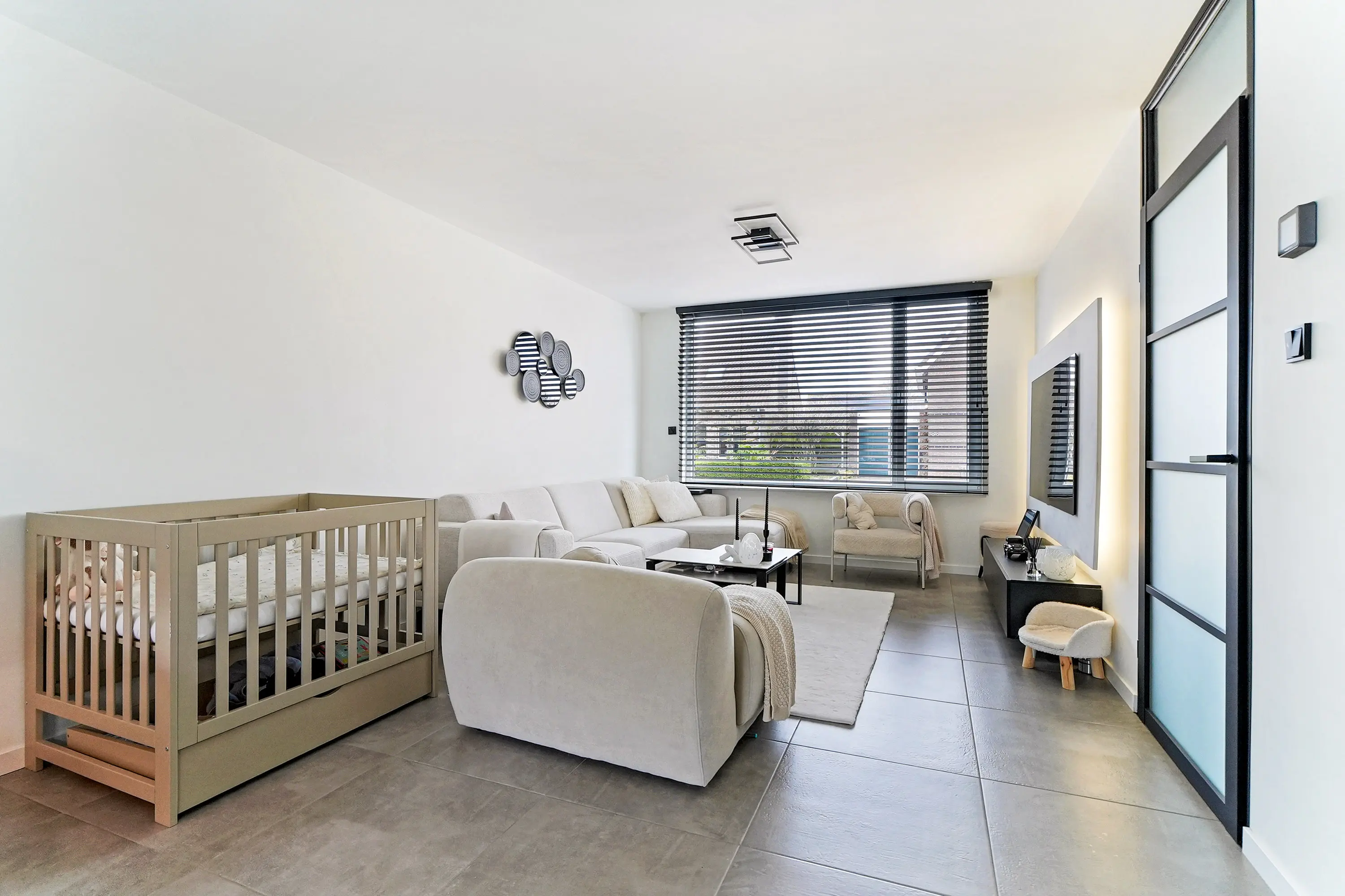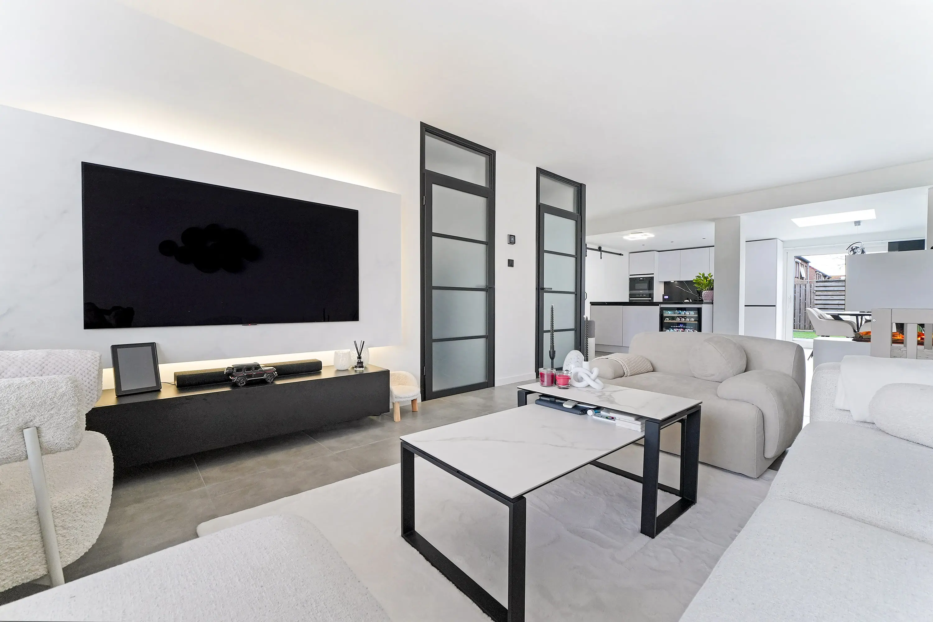 De woonkamer is aan de voorzijde van de woning gelegen. Dankzij de grote raampartij profiteert de woonkamer van veel natuurlijk licht. Door een aanbouw en het doorbreken van de achtergevel zijn er aanzienlijk extra vierkante meters gerealiseerd. In 2021 is er een royale keuken geplaatst met kookeiland. De keuken is ruim opgezet en voorzien van alle denkbare inbouwapparatuur, waaronder een Bora inductiekookplaat, koelkast, oven, magnetron, 3-in-1 kokendwaterkraan, vaatwasser en wijnkoeler.