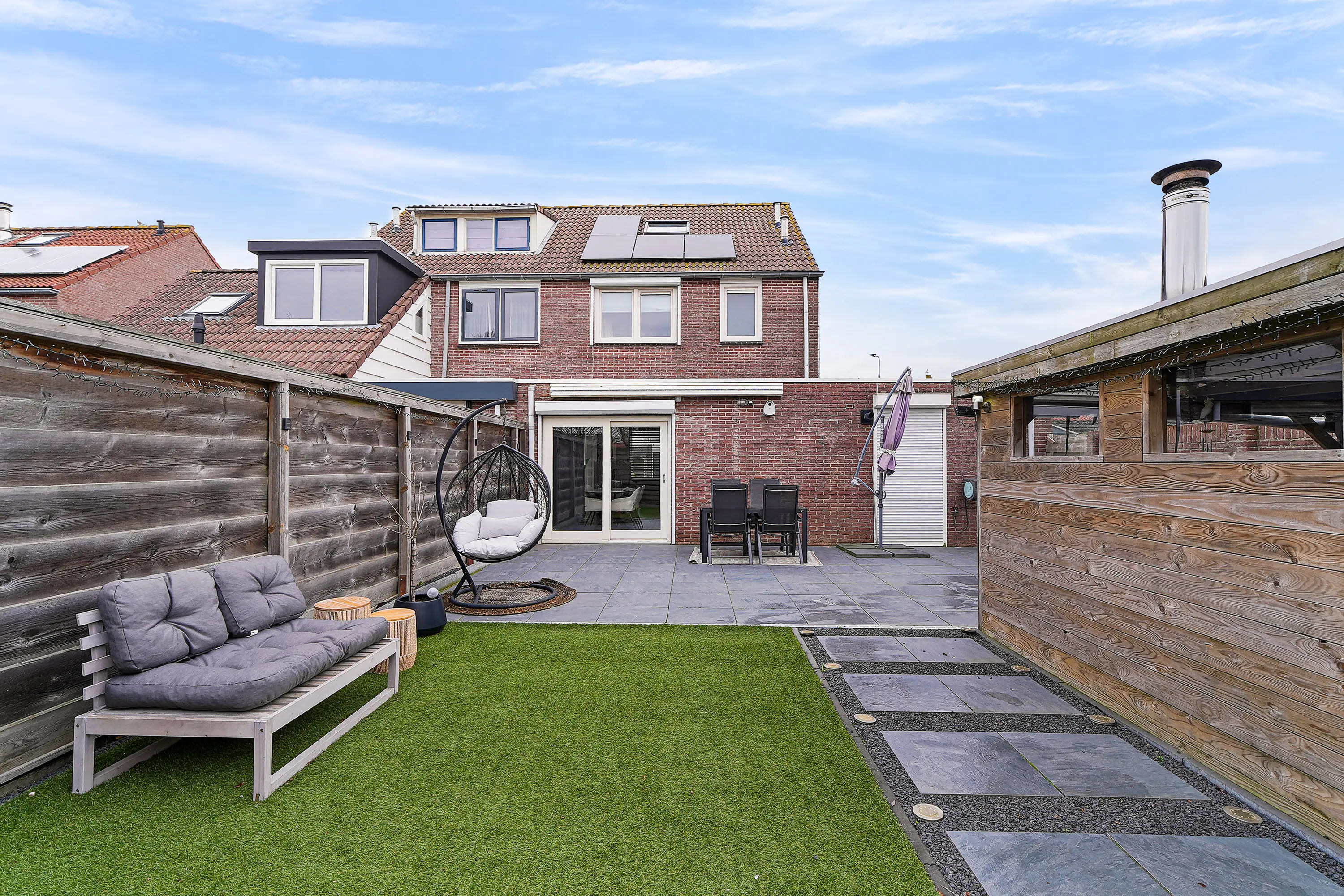 De achtertuin is gelegen op het zuidwesten en is ruim en praktisch ingericht. De tuin is onderhoudsvriendelijk en beschikt over een schuur, een ruime overkapping en een vrije achterom. Direct achter de tuin bevindt zich een speeltuintje, ideaal voor jonge kinderen om veilig te spelen.