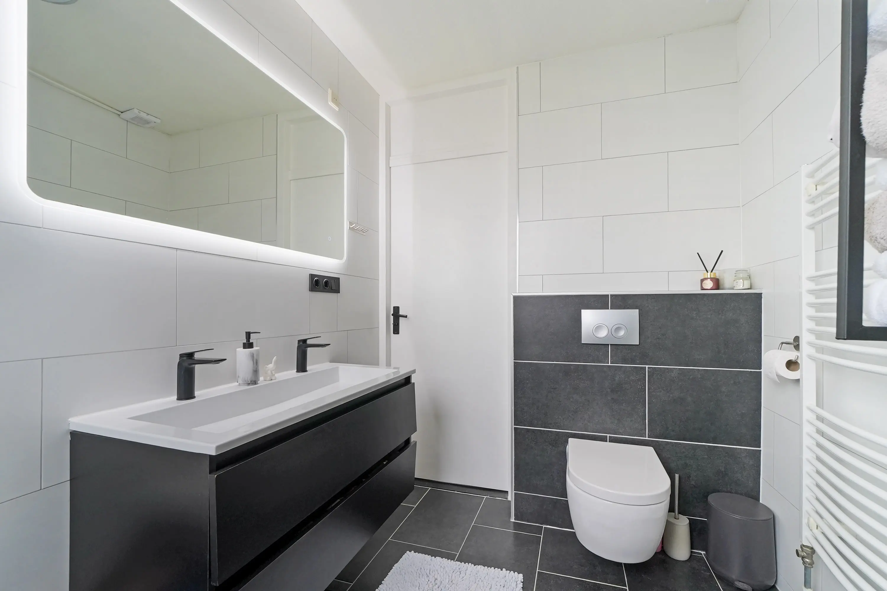 De badkamer op deze verdieping is vernieuwd in 2019 en beschikt over een ligbad met douche, een tweede toilet en een dubbele wastafel met meubel.