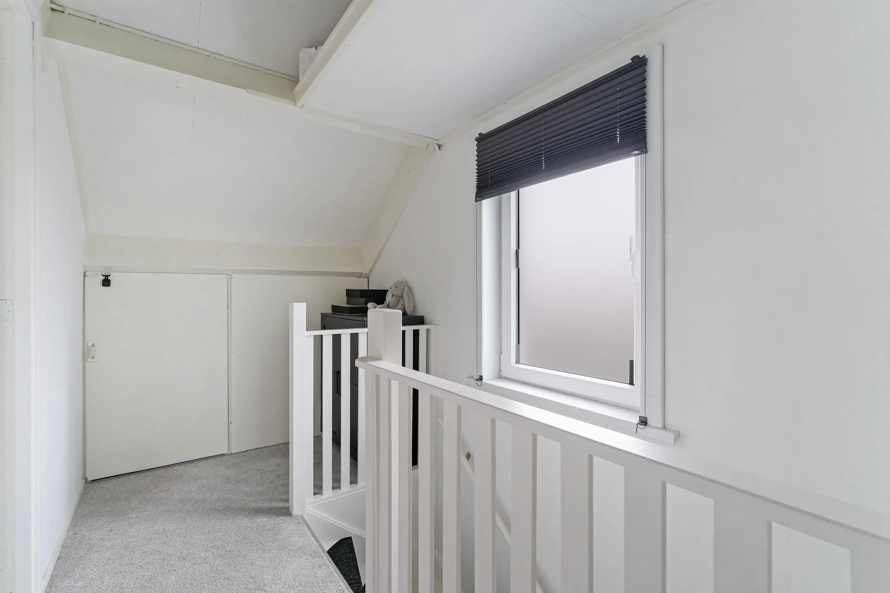 De tweede verdieping is ruim opgezet en beschikt op de overloop over praktische bergruimte. Daarnaast zorgt een raam voor natuurlijke lichtinval en ventilatie. Op deze verdieping bevindt zich de derde slaapkamer, eveneens voorzien van opbergruimte en een dakraam voor extra daglicht.