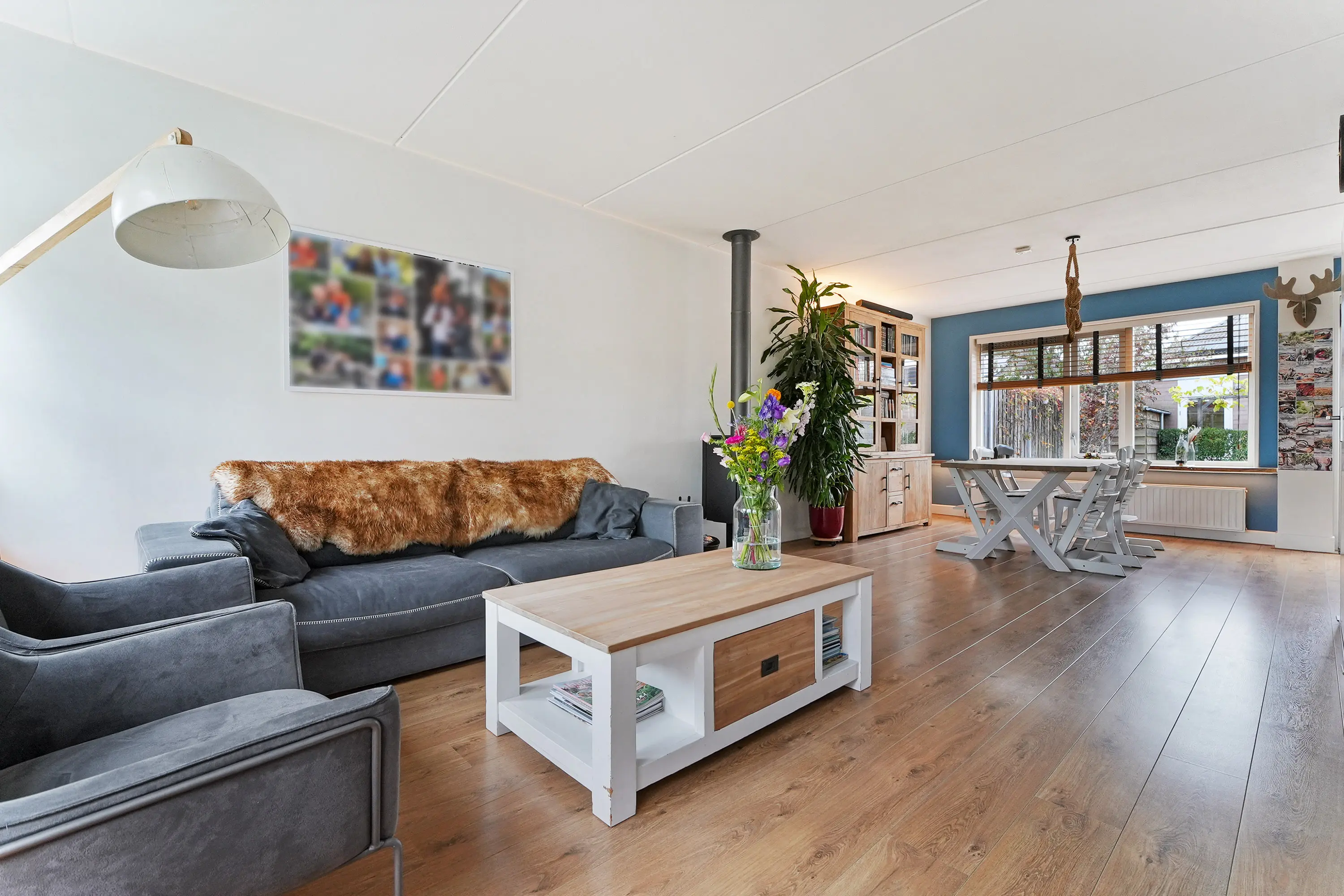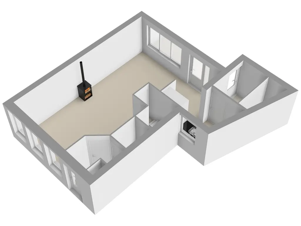 Entree in nette hal met meterkast, keurig toilet met fonteintje en doorgang naar de woonkamer. Bij binnenkomst in de woonkamer ervaart u direct de fijne woonsfeer, nette afwerking én ruimtelijke woonbeleving. De grote raampartijen dragen ook nog eens bij aan een licht geheel. De zithoek treft u aan de voorzijde en de eethoek met de half open keuken aan de tuinzijde. De houtkachel, halverwege de woonkamer maakt het plaatje van de woonkamer compleet. Aansluitend aan de woonkamer treft u in de zijuitbouw een moderne keuken, uitgevoerd in een ruime hoekopstelling met lichte kastfronten en een donker werkblad. Verder is de keuken uiteraard voorzien van de gewenste inbouwapparatuur. Voorts een praktische bijkeuken met daar de aansluitingen voor witgoed. Vanuit de bijkeuken bereikt u gemakkelijk de tuin.