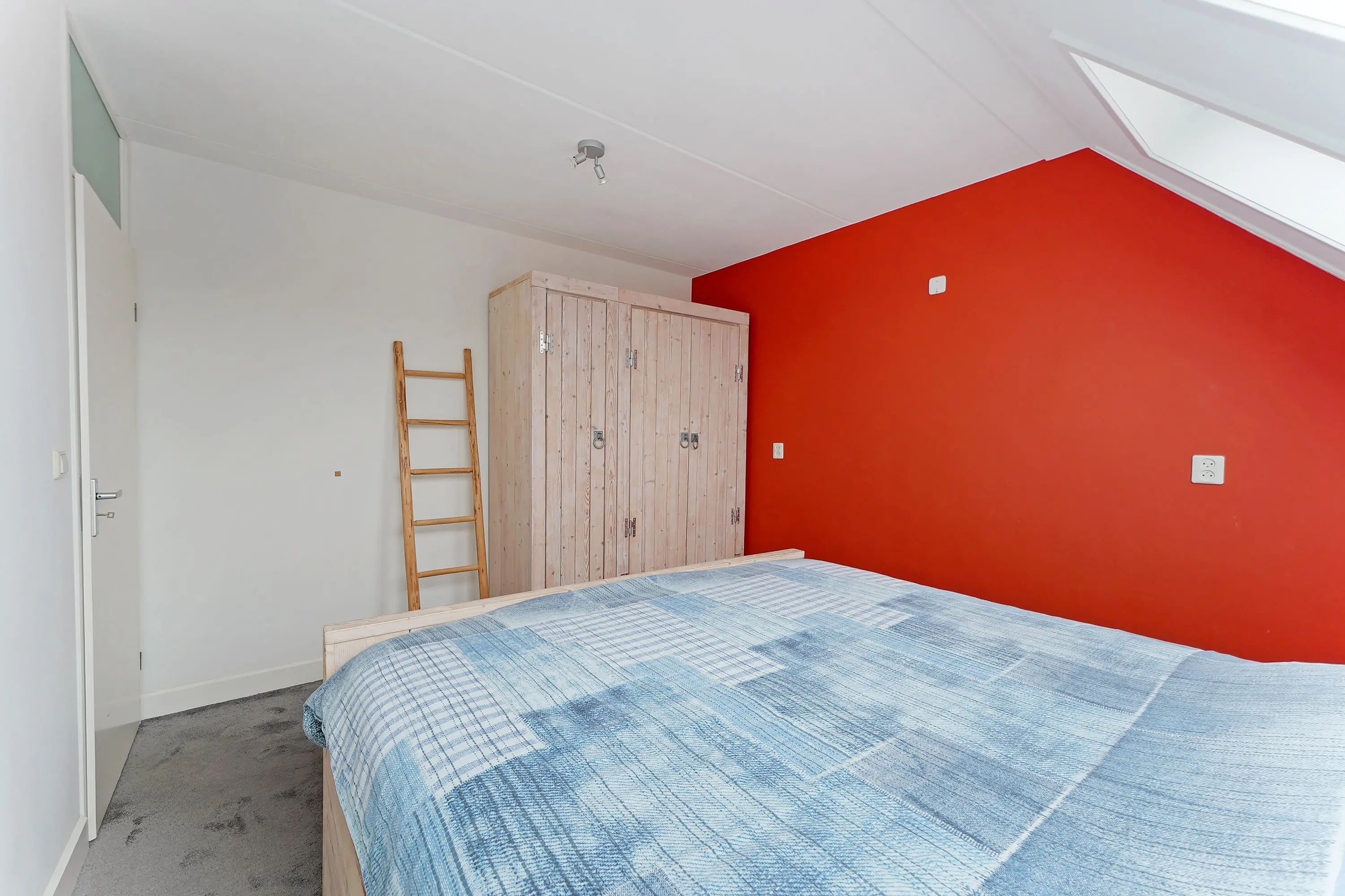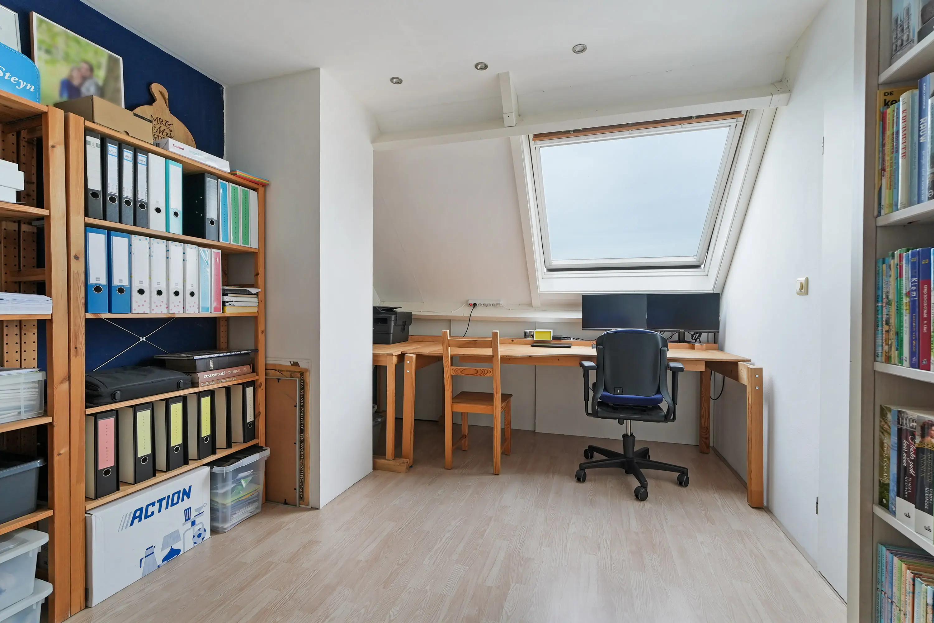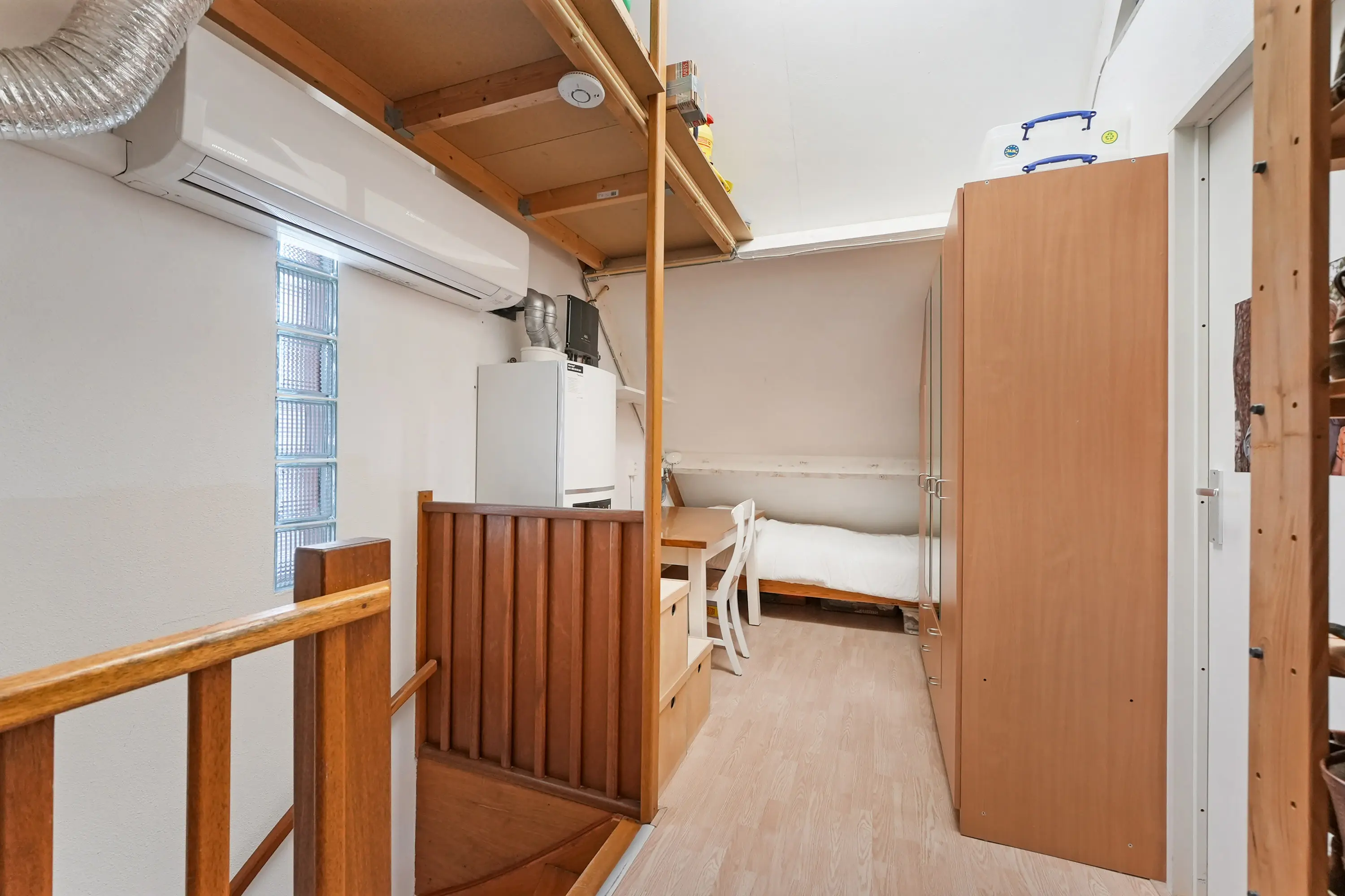 Bereikbaar via de vaste trap bereikt u de volwaardige 2e verdieping. De overloop verleent toegang tot slaapkamer nummer 4. Eveneens een ruime slaapkamer, die momenteel in gebruik is als werkkamer. Opbergruimte treft u achter het knieschot en op de opbergzolder. Verder bevindt zich op de overloop de cv-ketel en boven het trapgat hangt de airco-unit. De slaapkamer op deze verdieping beschikt over een groot dakraam en diverse bergruimte ter plaatse van het knieschot. Ook achter de wasmachine/drogeropstelling bevindt zich een flinke bergruimte.