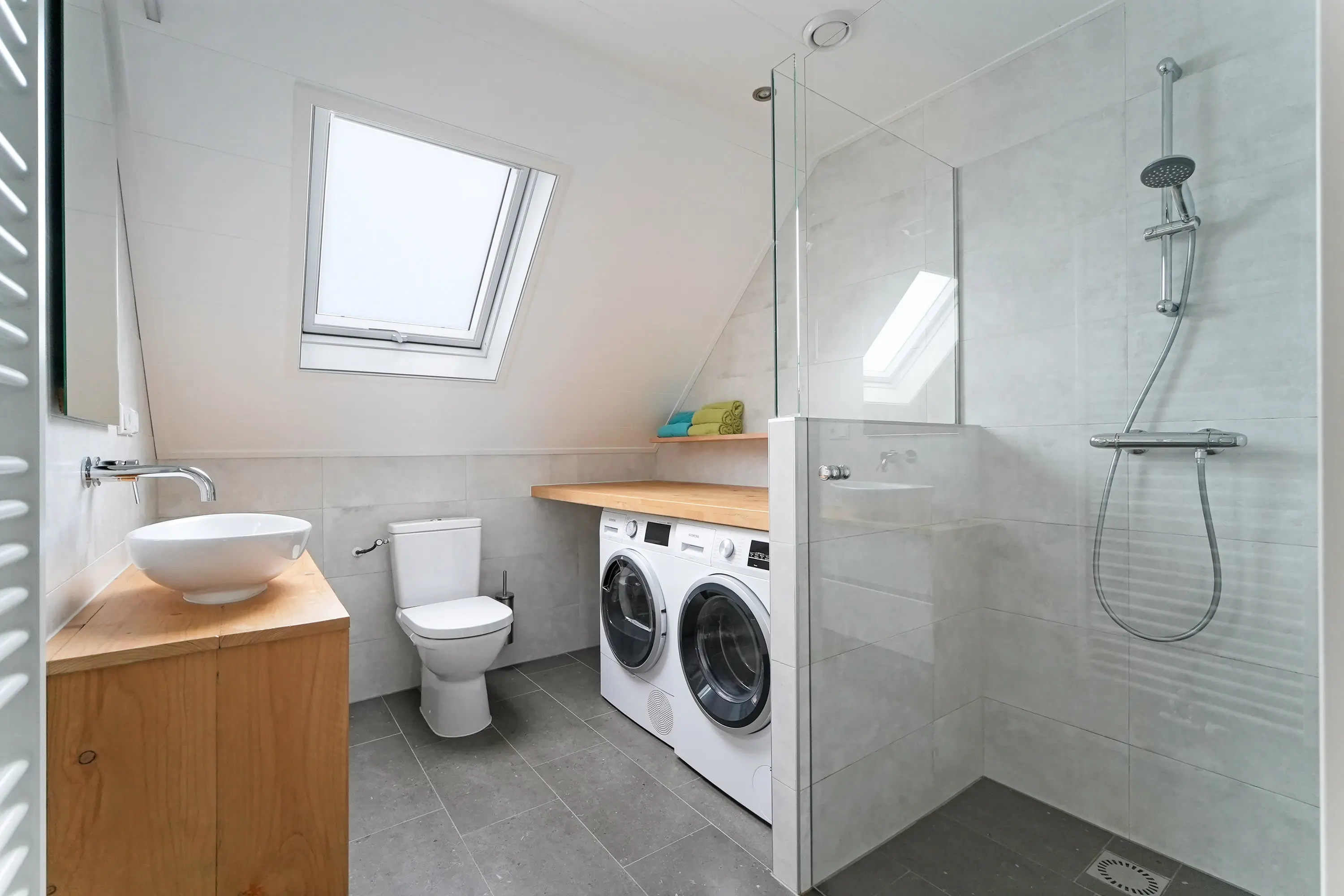 De overloop geeft toegang tot 3 slaapkamers, waaronder de riante ouderslaapkamer met 2 grote recent vernieuwde dakramen. De slaapkamers aan de voorzijde zijn voorzien van rolluiken. De keurig verzorgde badkamer is voorzien van een inloopdouche, fraai wastafelmeubel, tweede toilet en absoluut handig, een werkblad met daaronder de wasmachine- en droger. Ook op deze verdieping is het geheel keurig afgewerkt.