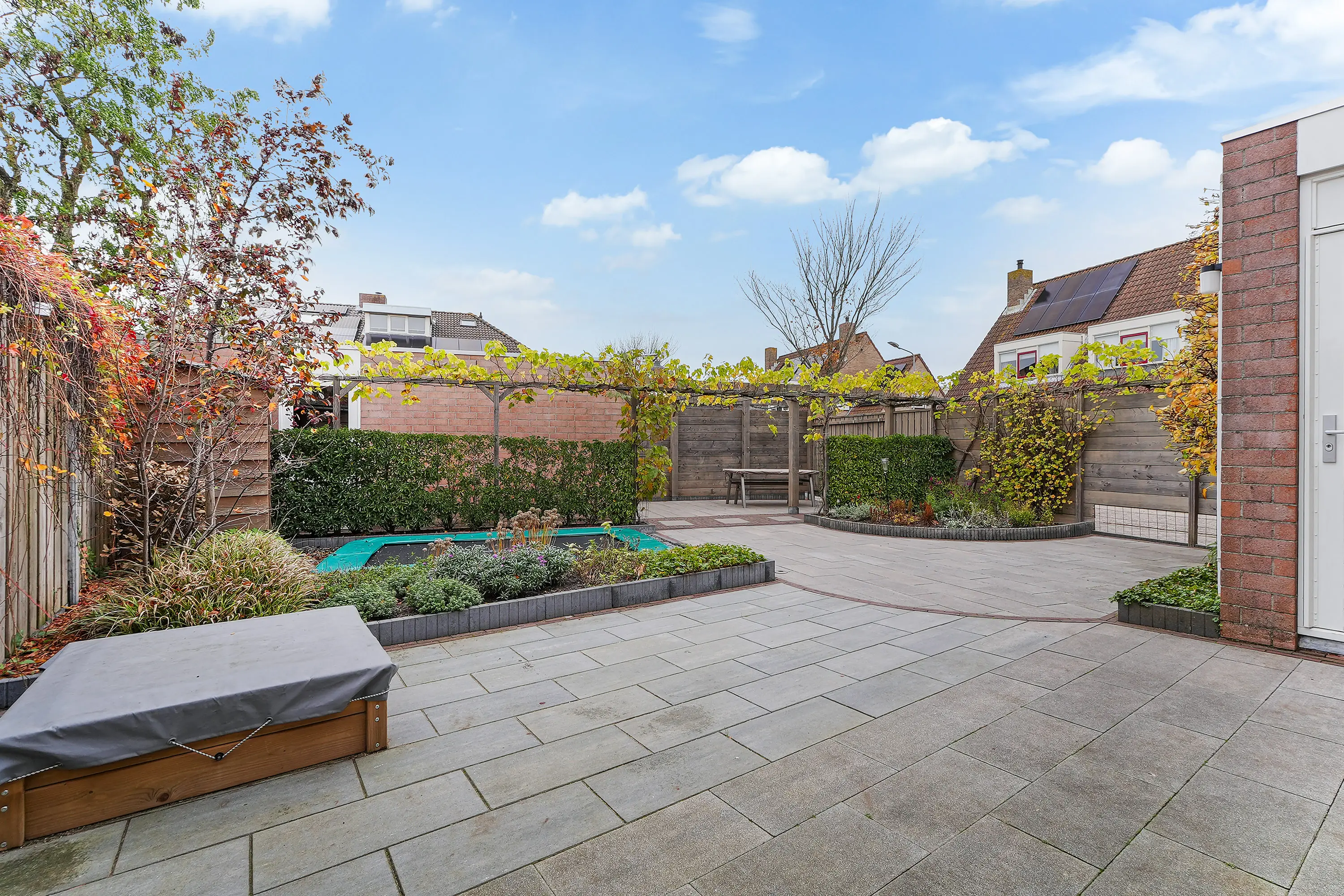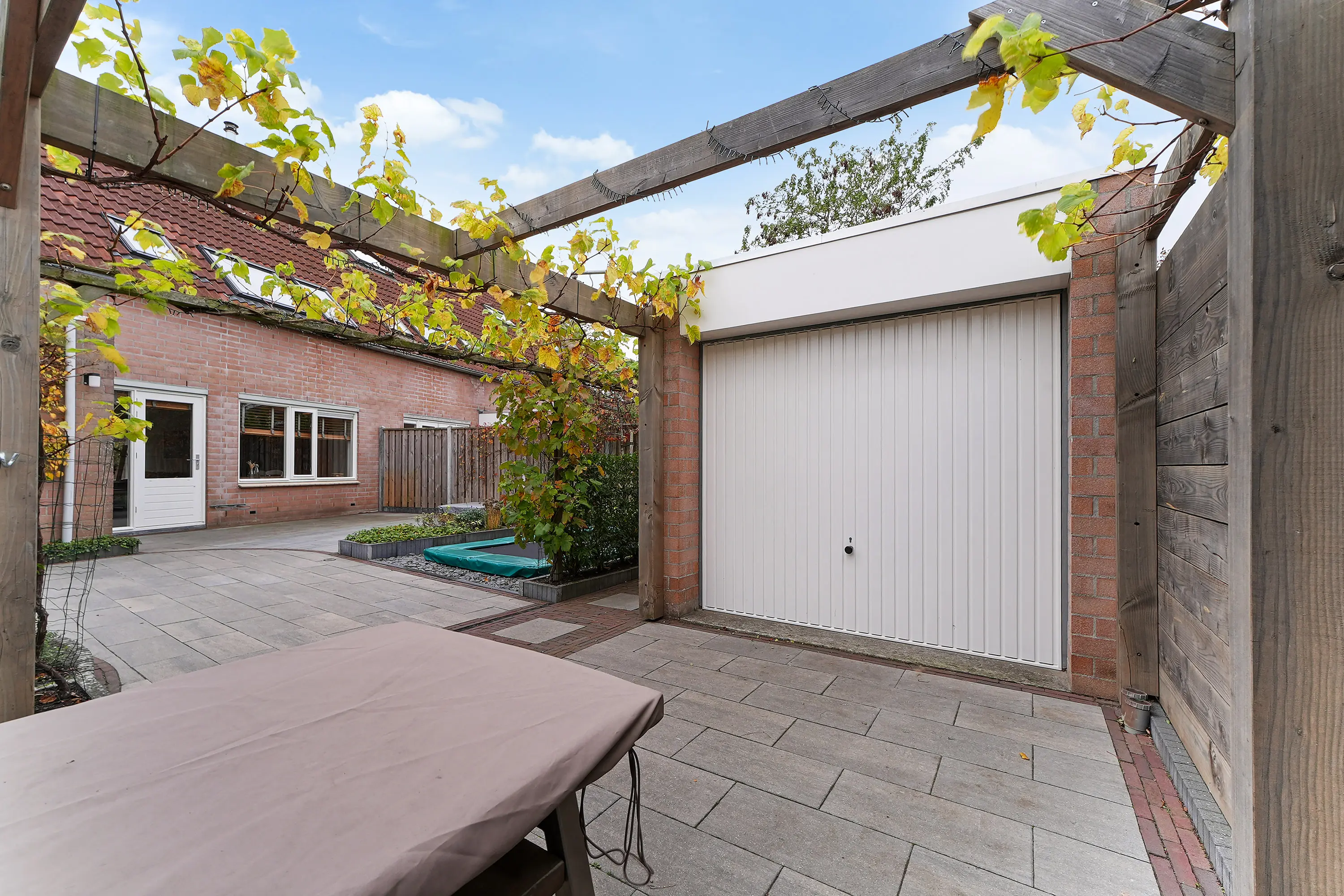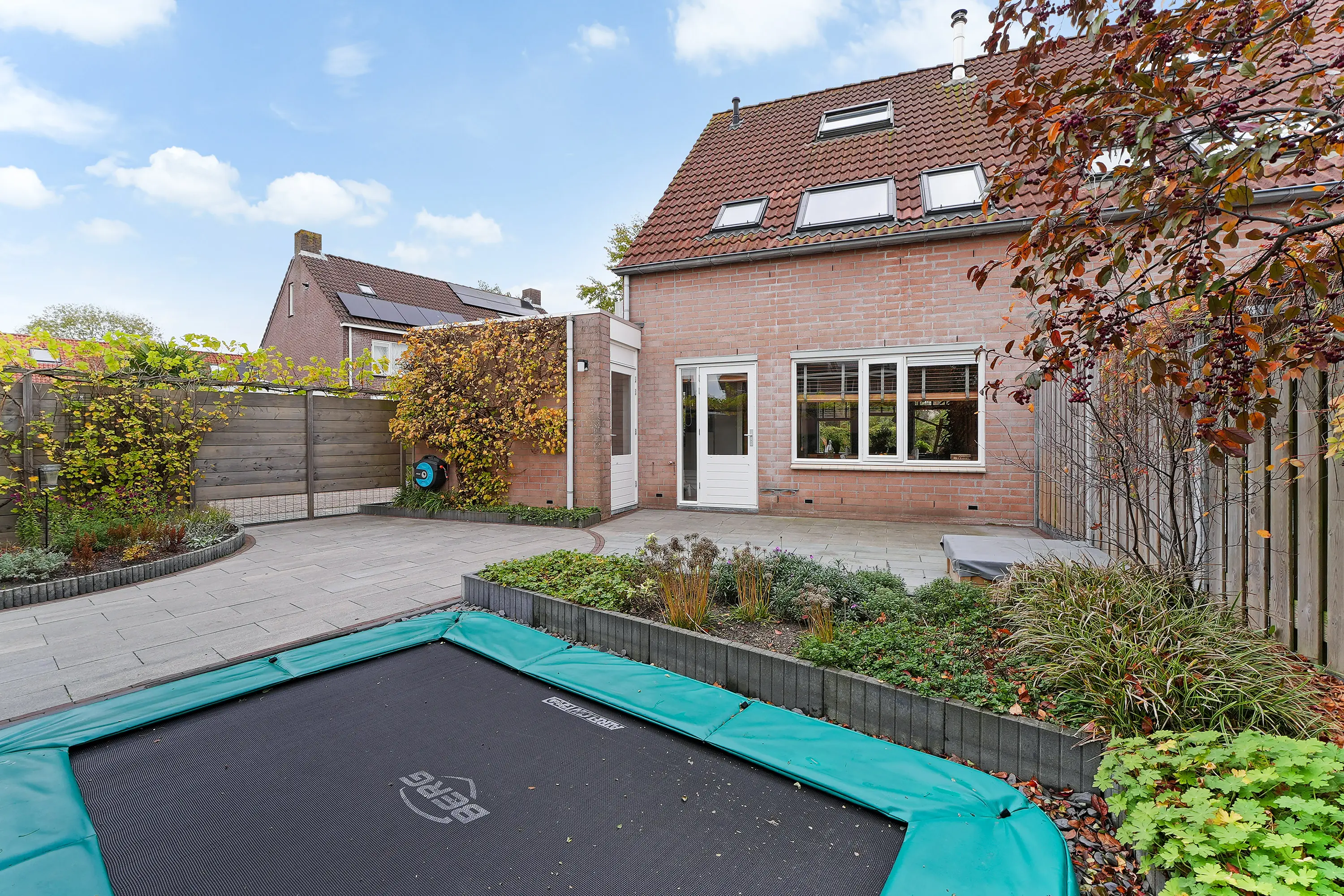 De tuin behoort toch wel tot een van de meest bijzondere facetten van deze woning. Dankzij de hoekligging is de tuin ruim van omvang en biedt deze veel zon én volop ruimte voor meerdere terrassen en gezellige hoekjes. Een keurig verzorgd geheel, vormgegeven door middel van sierbestrating en fraaie groenborders met beplanting. Achter in de tuin staat een riante stenen berging in combinatie met een garage, welke tevens vanaf de straat te bereiken is – ideaal voor het stallen van fietsen, (tuin)gereedschap of de auto.