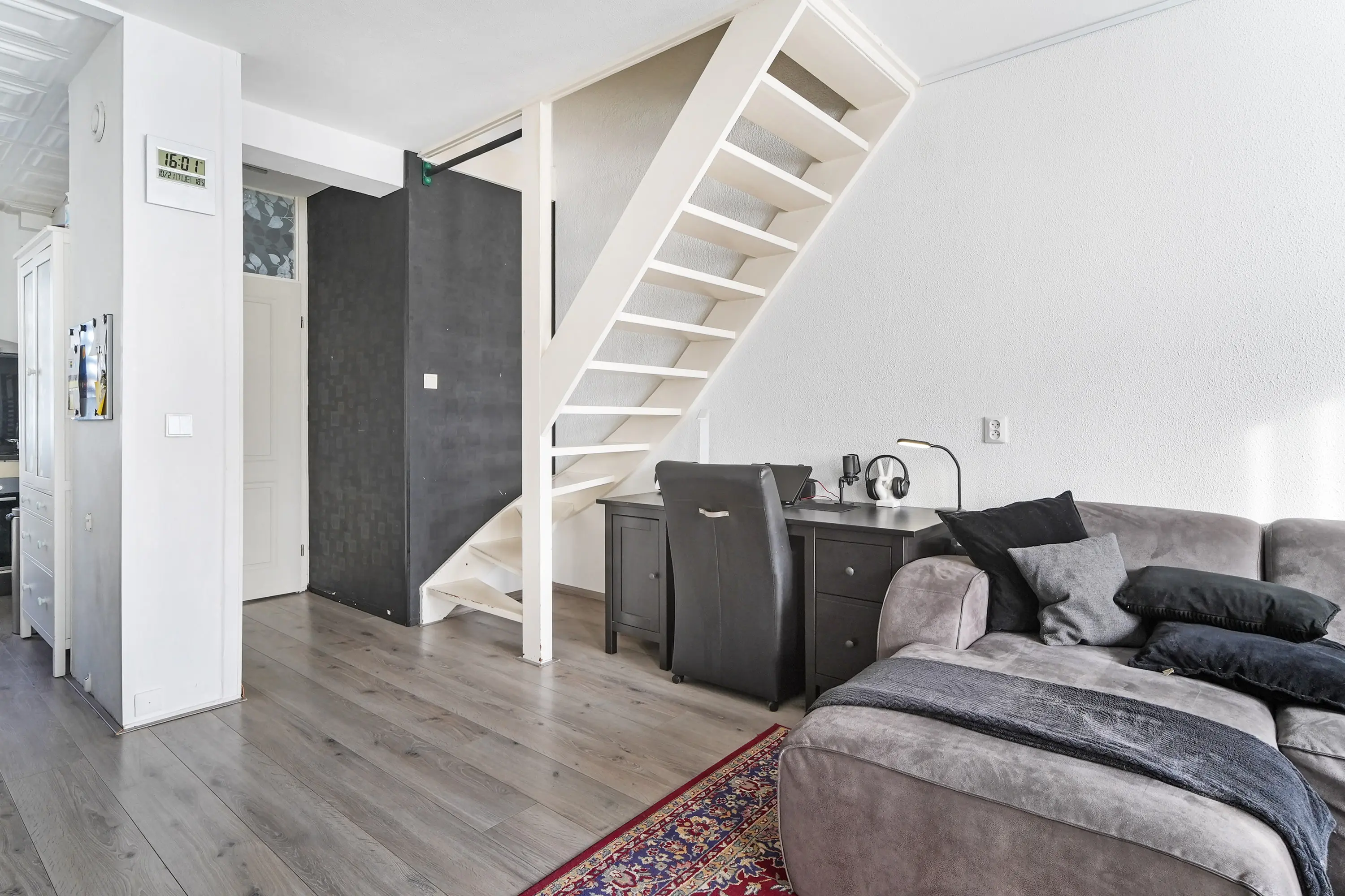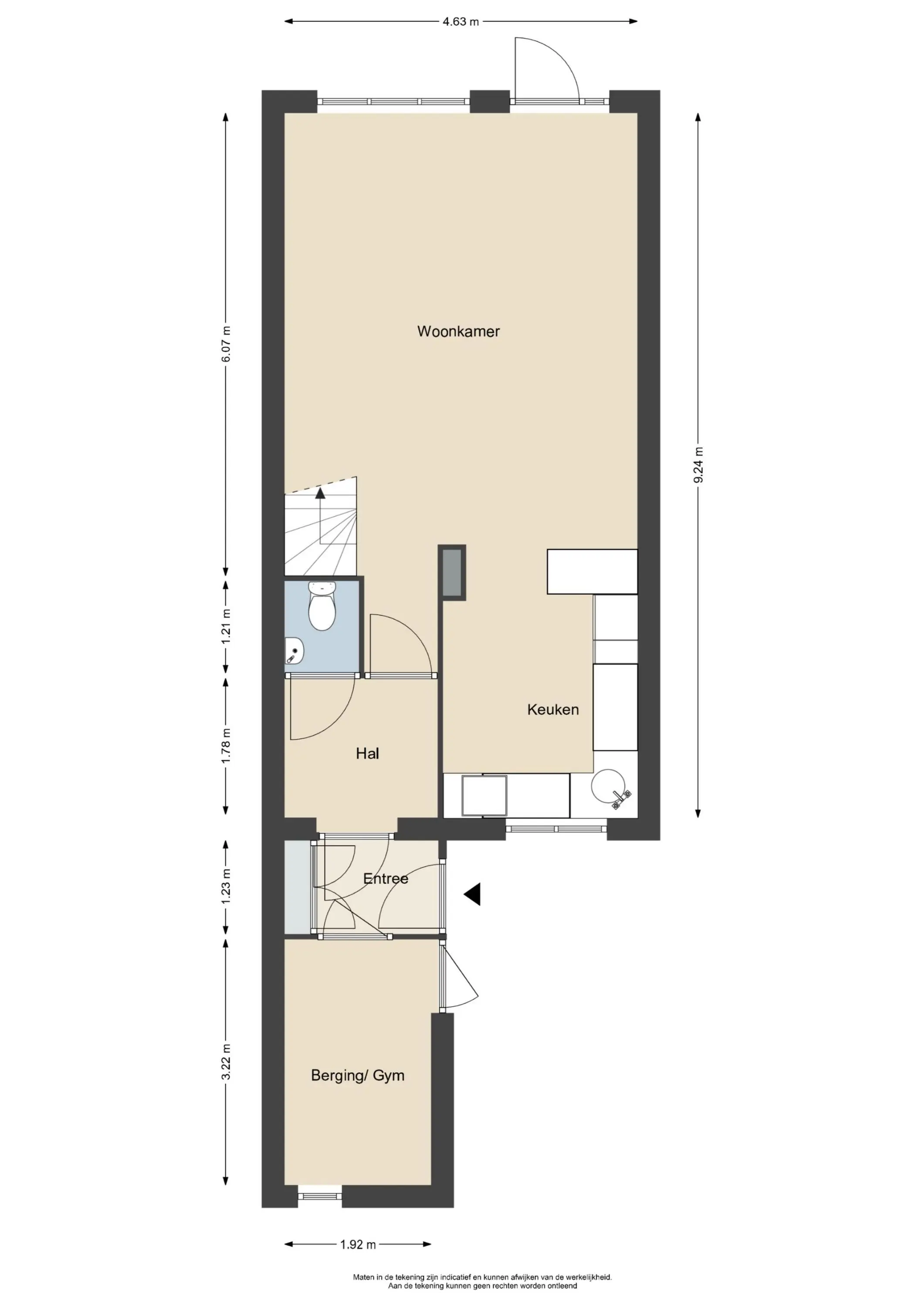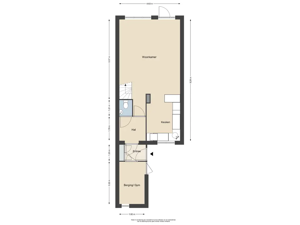 Portaal met toegang tot de hobby-/bergruimte en hal. De hobby-/bergruimte is tevens van buiten te bereiken en is voorzien van verwarming en elektra en is momenteel in gebruik als sportruimte. Via de hal bereik je het nette toilet met fonteintje, tuingerichte en lichte woonkamer met trap naar de 1e verdieping en tuindeur en aansluitend een nette open keuken.