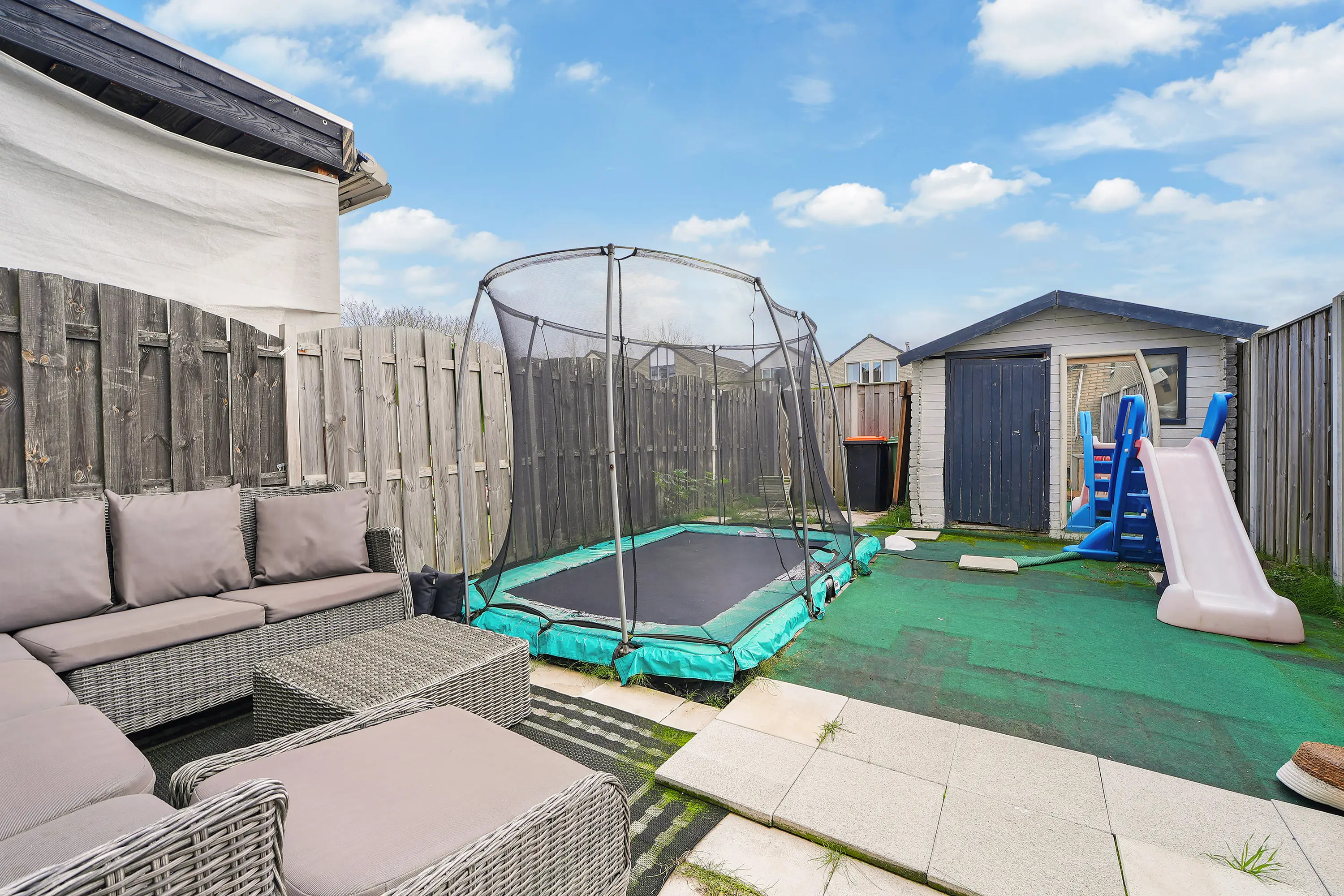De zonnige achtertuin op het zuiden is voorzien van terras, houten tuinhuis en achterom. Aan de voorzijde is er nog een diepe voortuin met extra ruime oprit voor meerdere auto's.
