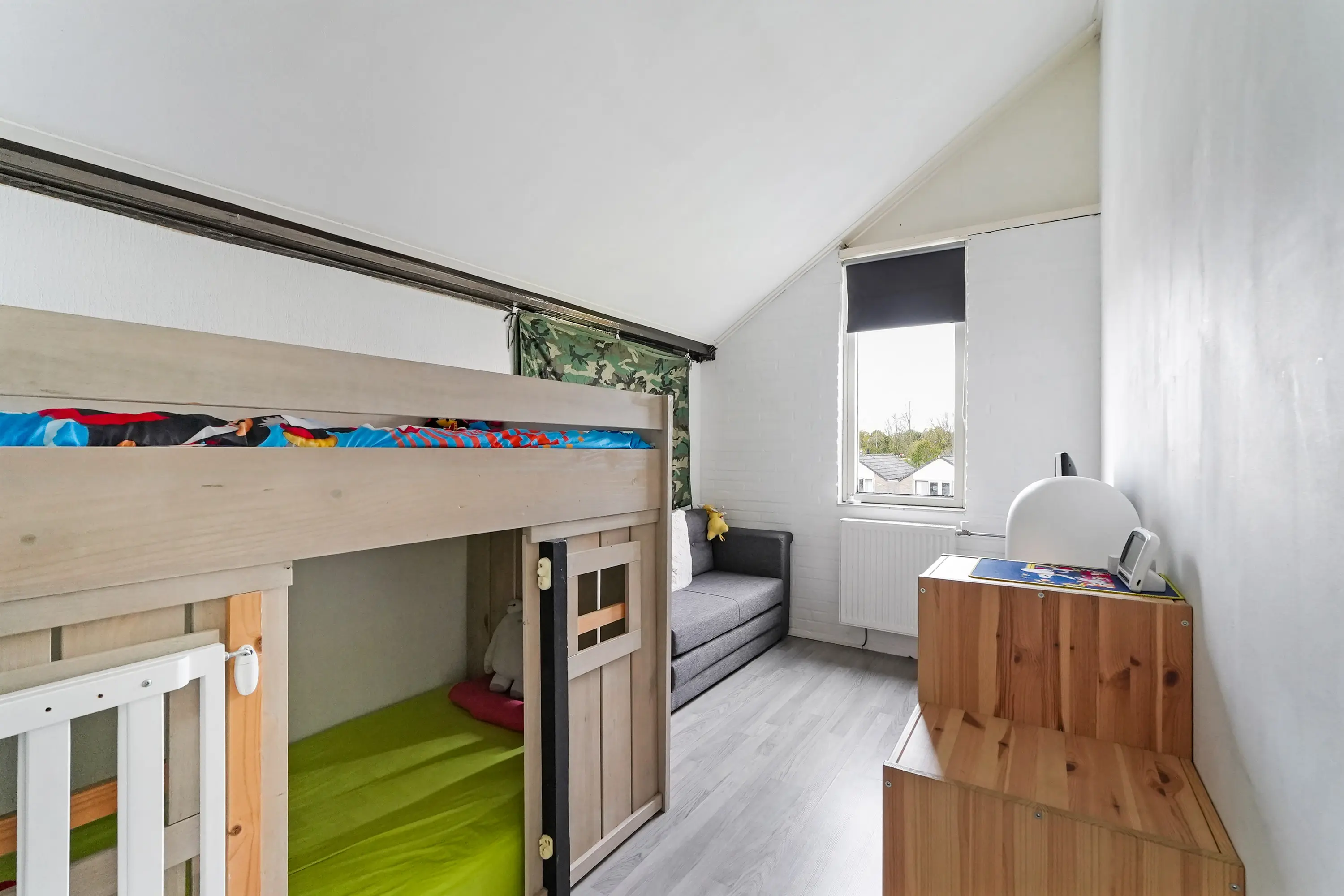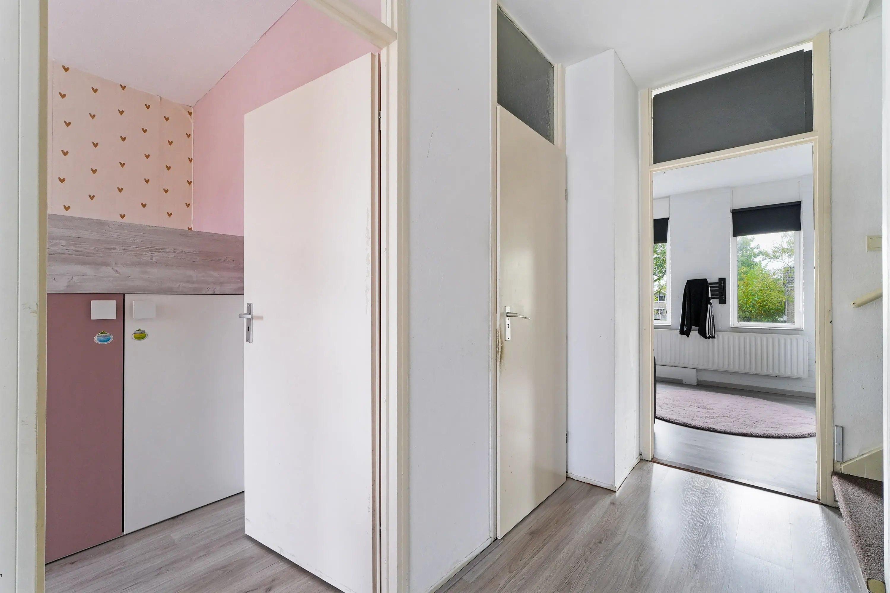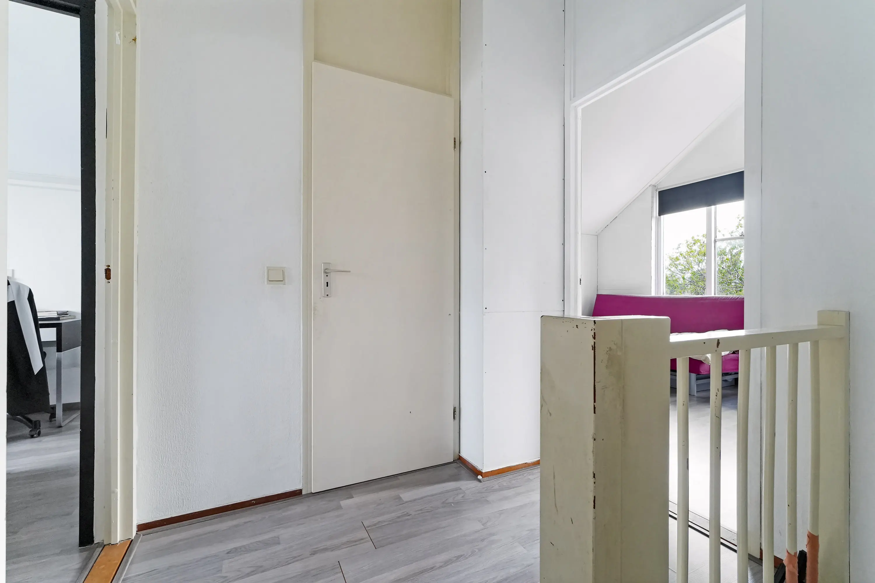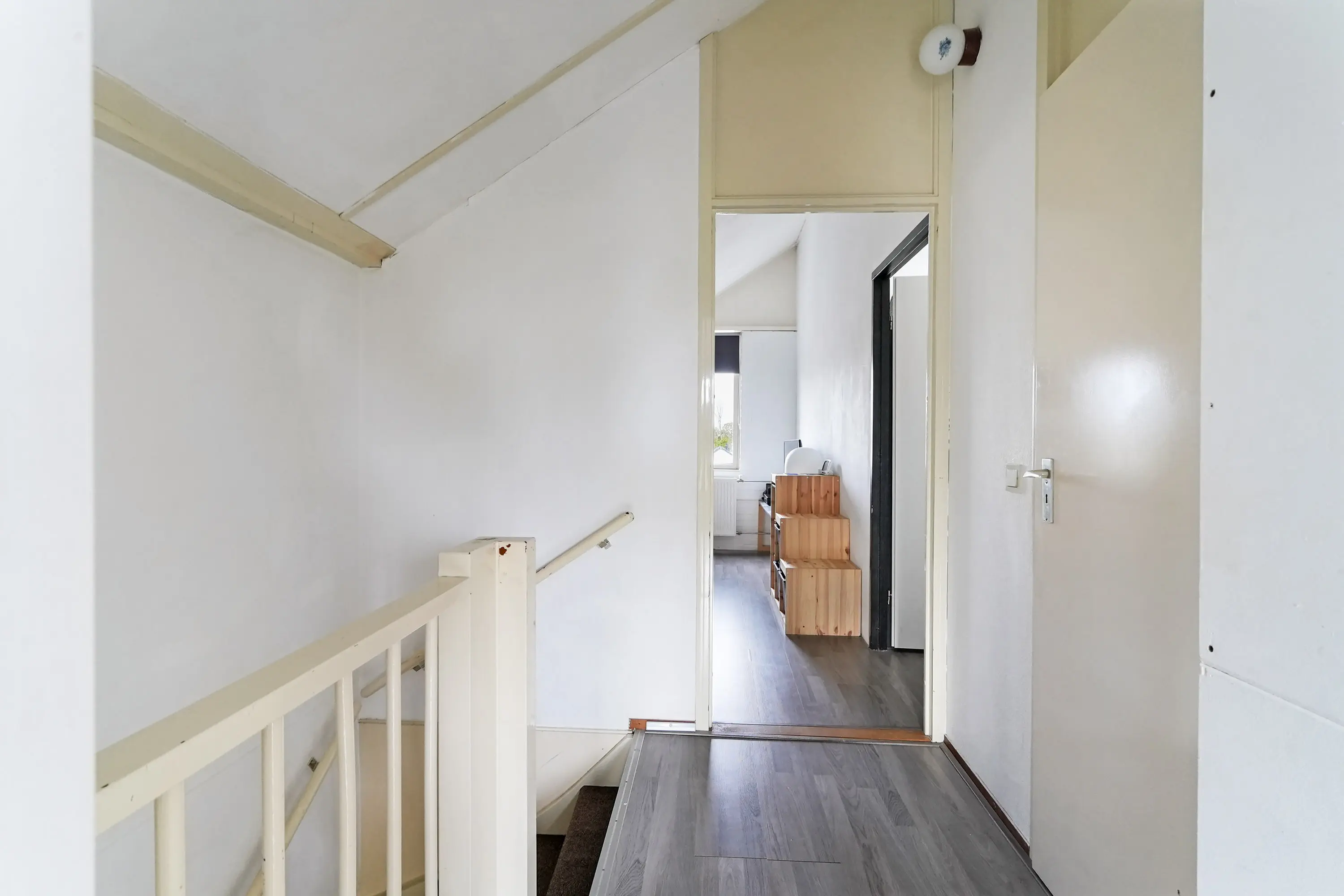 Overloop met vaste trap naar de 2e verdieping, slaapkamer 1 en slaapkamer 2 en 3 zijn gescheiden door een vouwdeur. Vervolgens een nette volledig betegelde badkamer voorzien van douchecabine, toilet en wastafelmeubel.