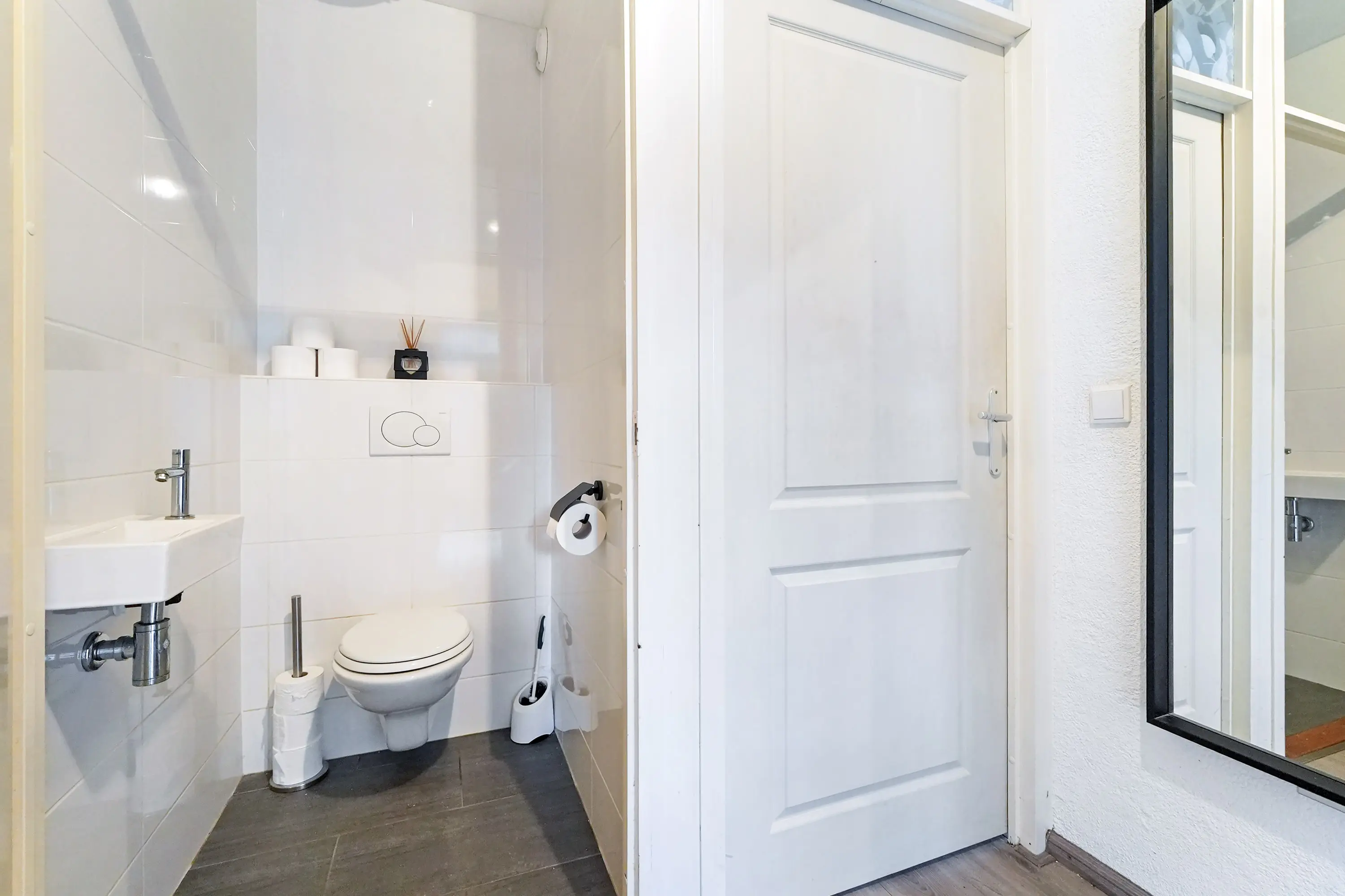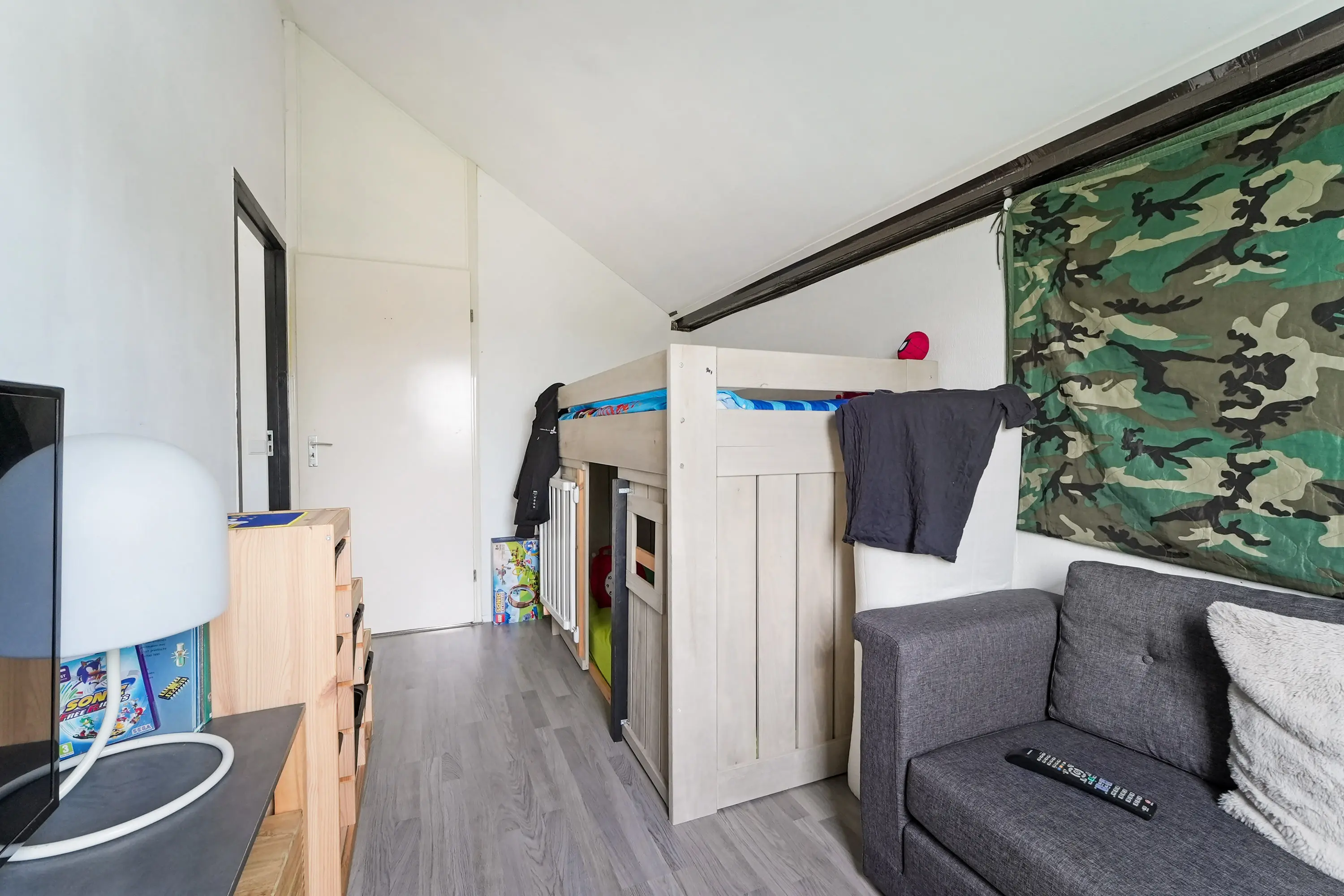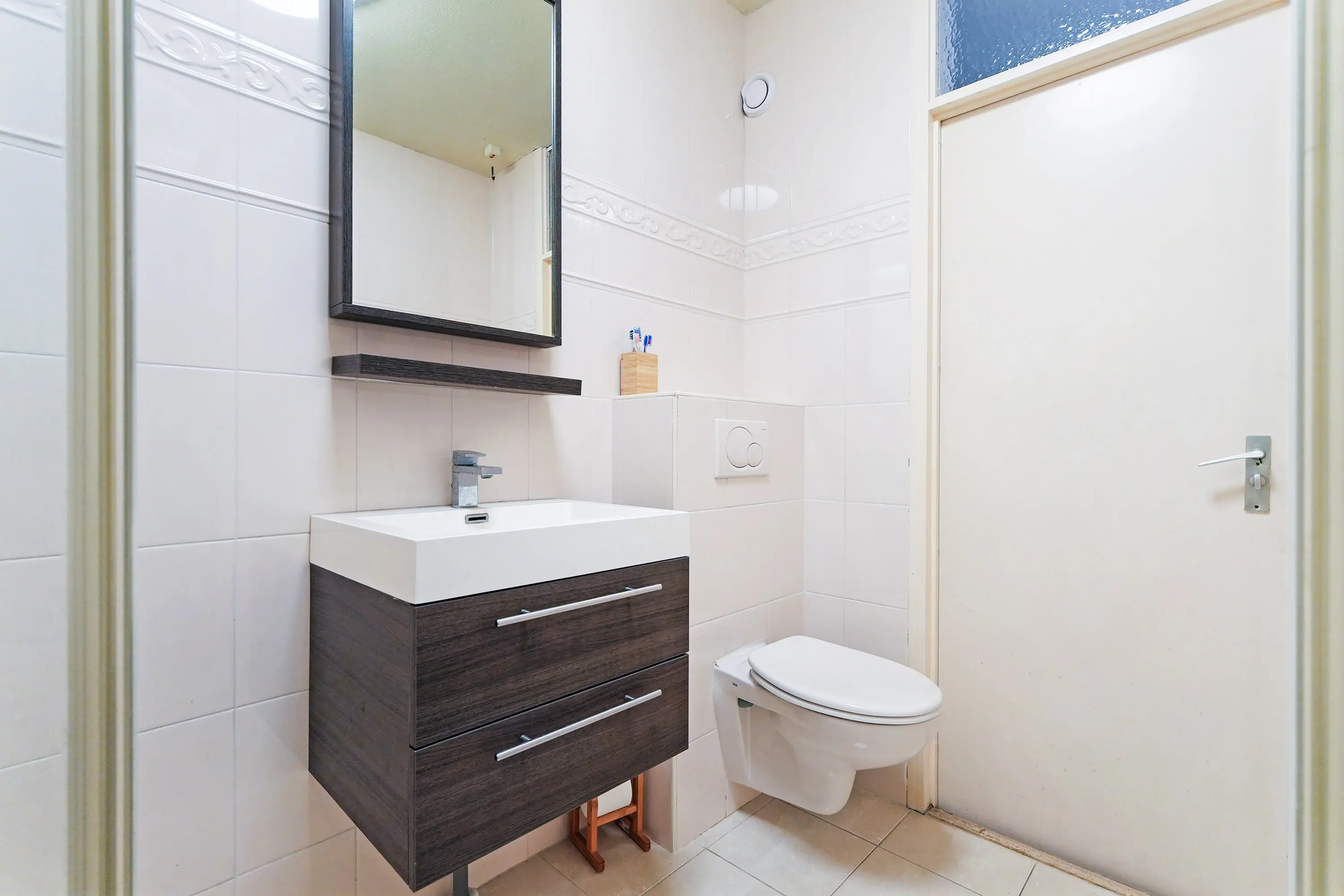 Overloop met vaste trap naar de 2e verdieping, slaapkamer 1 en slaapkamer 2 en 3 zijn gescheiden door een vouwdeur. Vervolgens een nette volledig betegelde badkamer voorzien van douchecabine, toilet en wastafelmeubel.