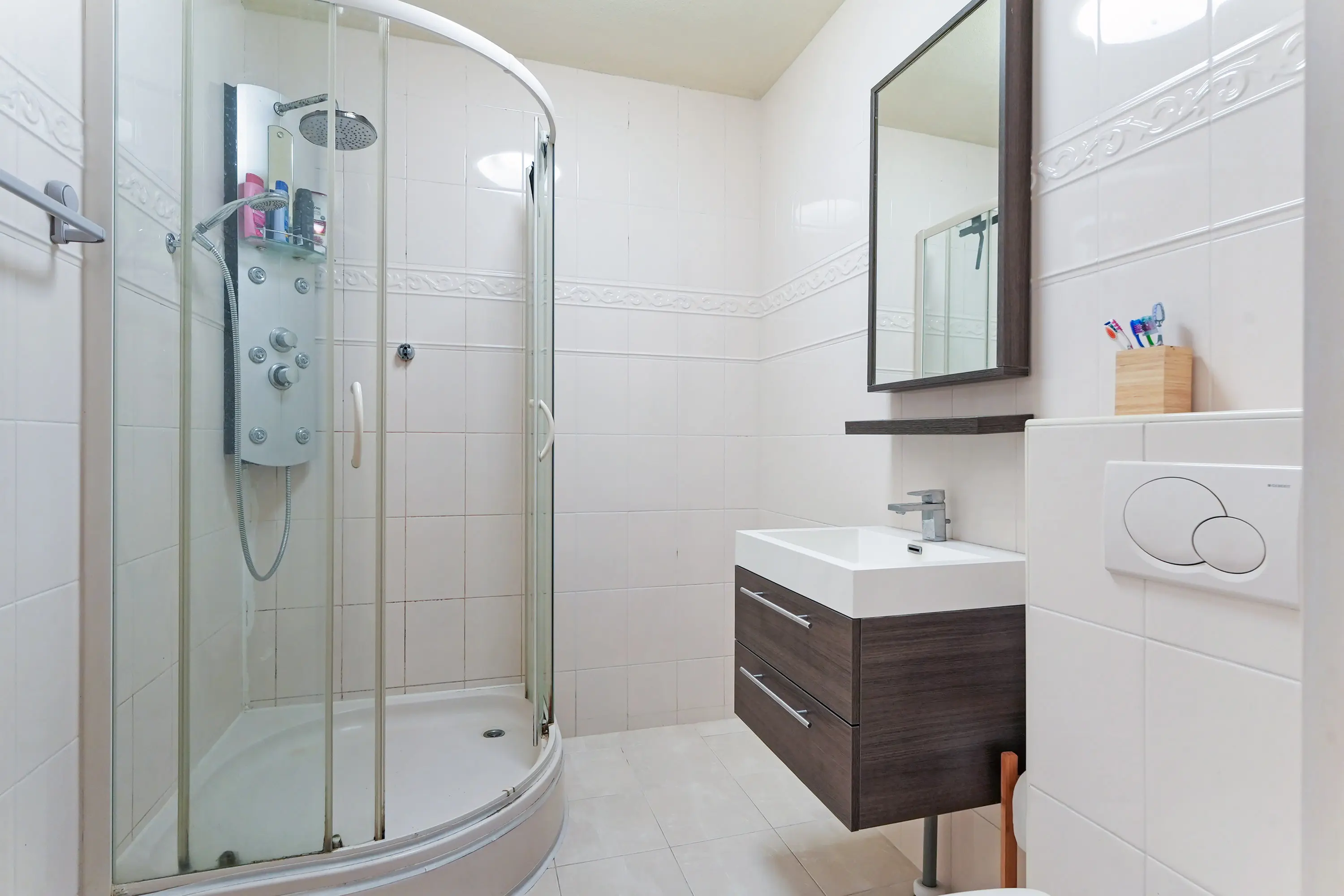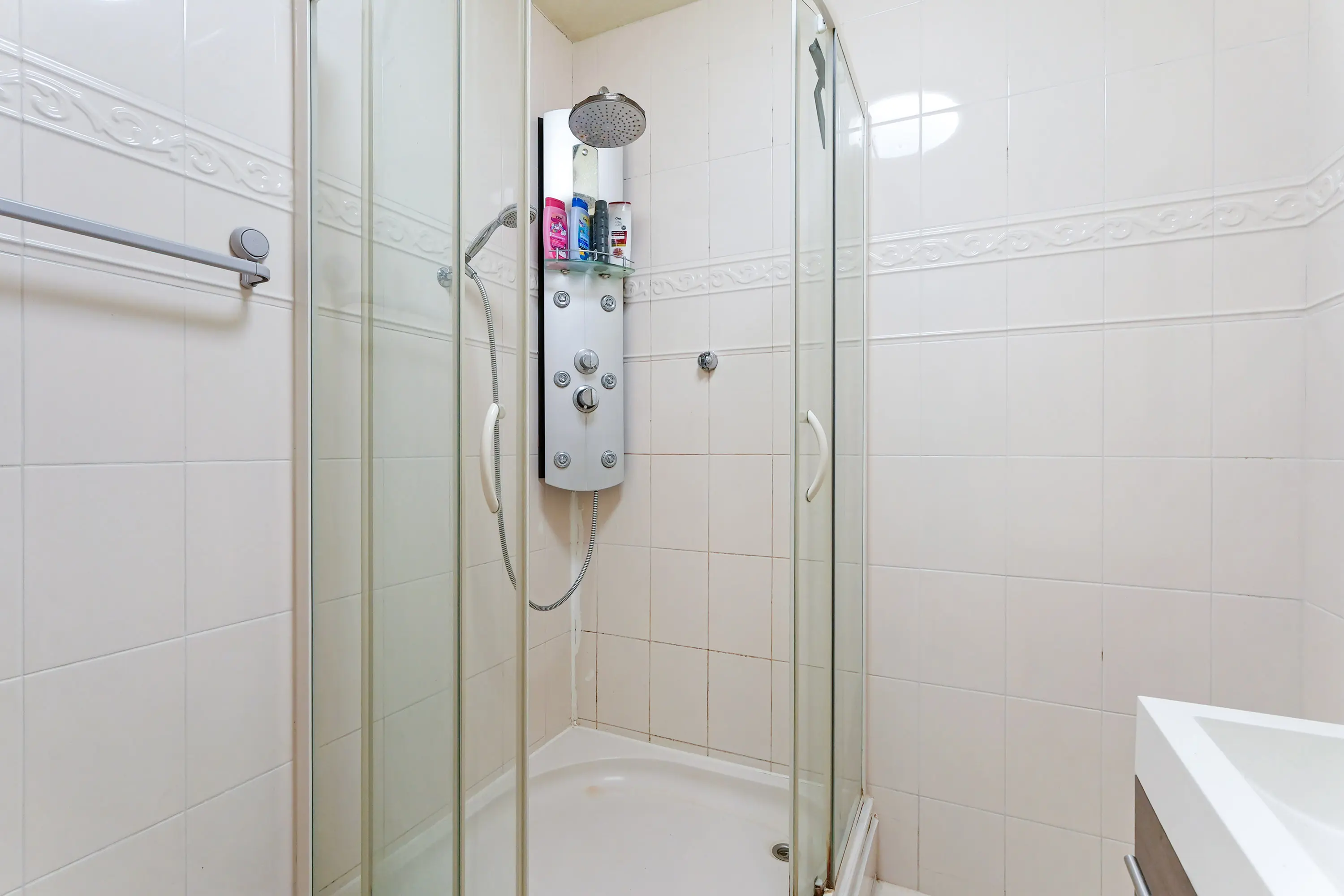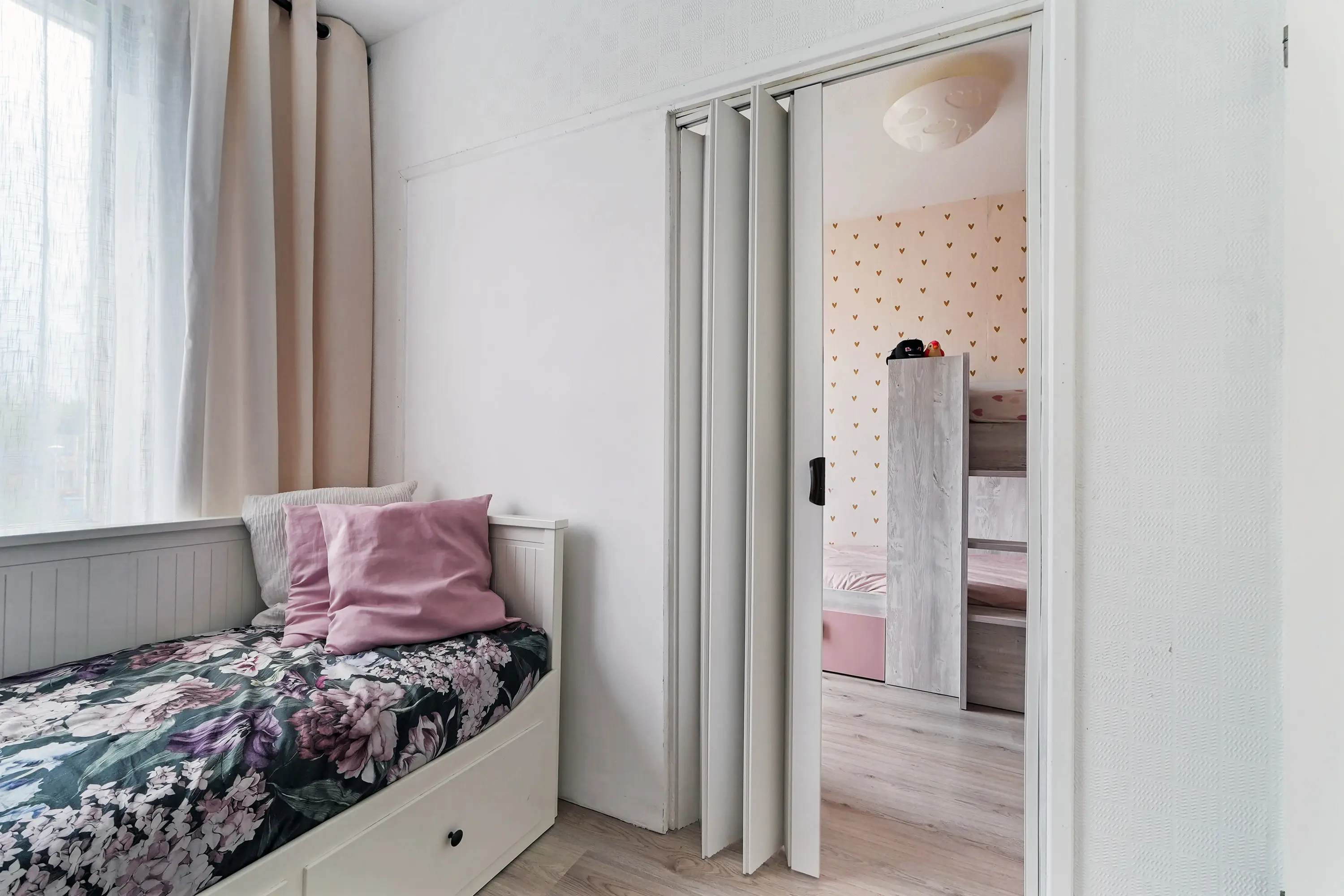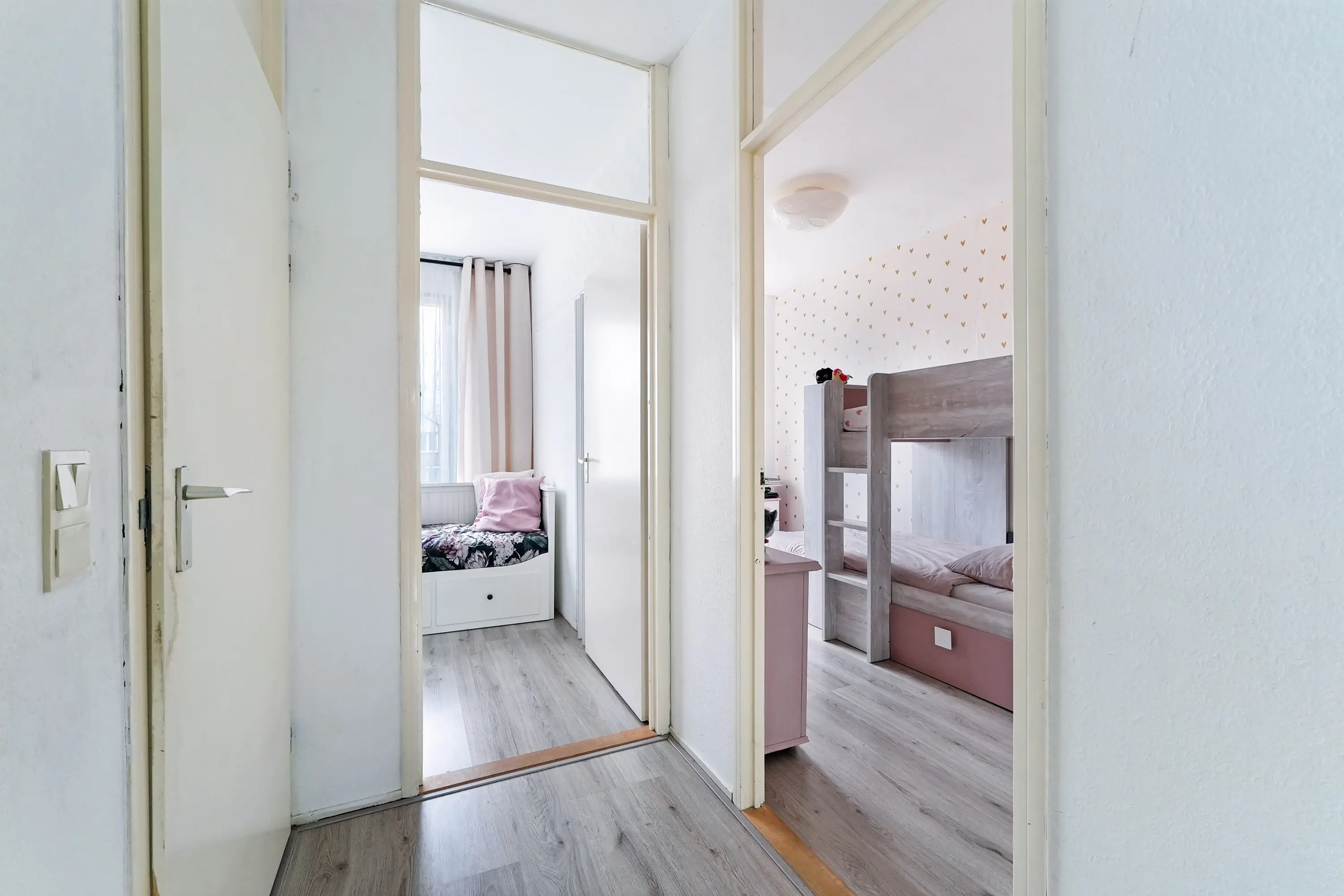 Overloop met vaste trap naar de 2e verdieping, slaapkamer 1 en slaapkamer 2 en 3 zijn gescheiden door een vouwdeur. Vervolgens een nette volledig betegelde badkamer voorzien van douchecabine, toilet en wastafelmeubel.