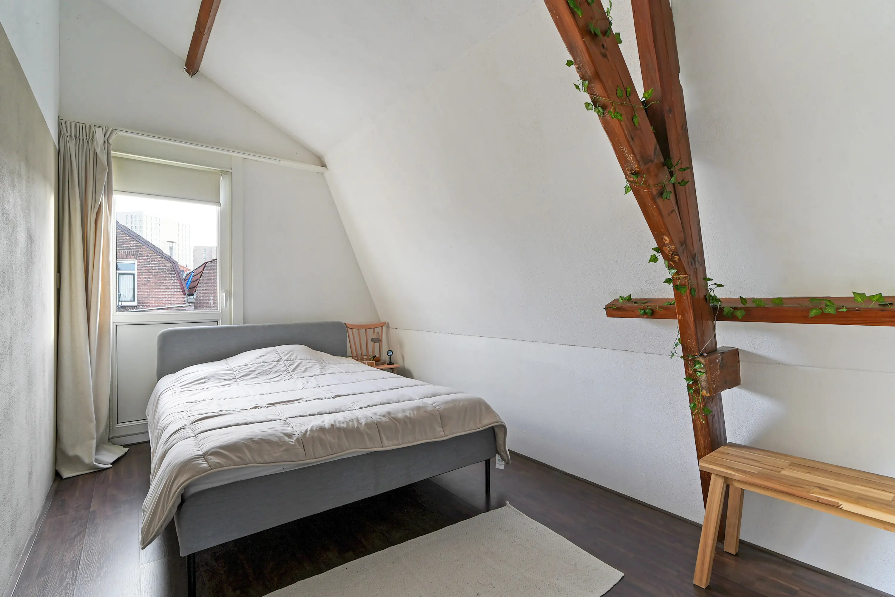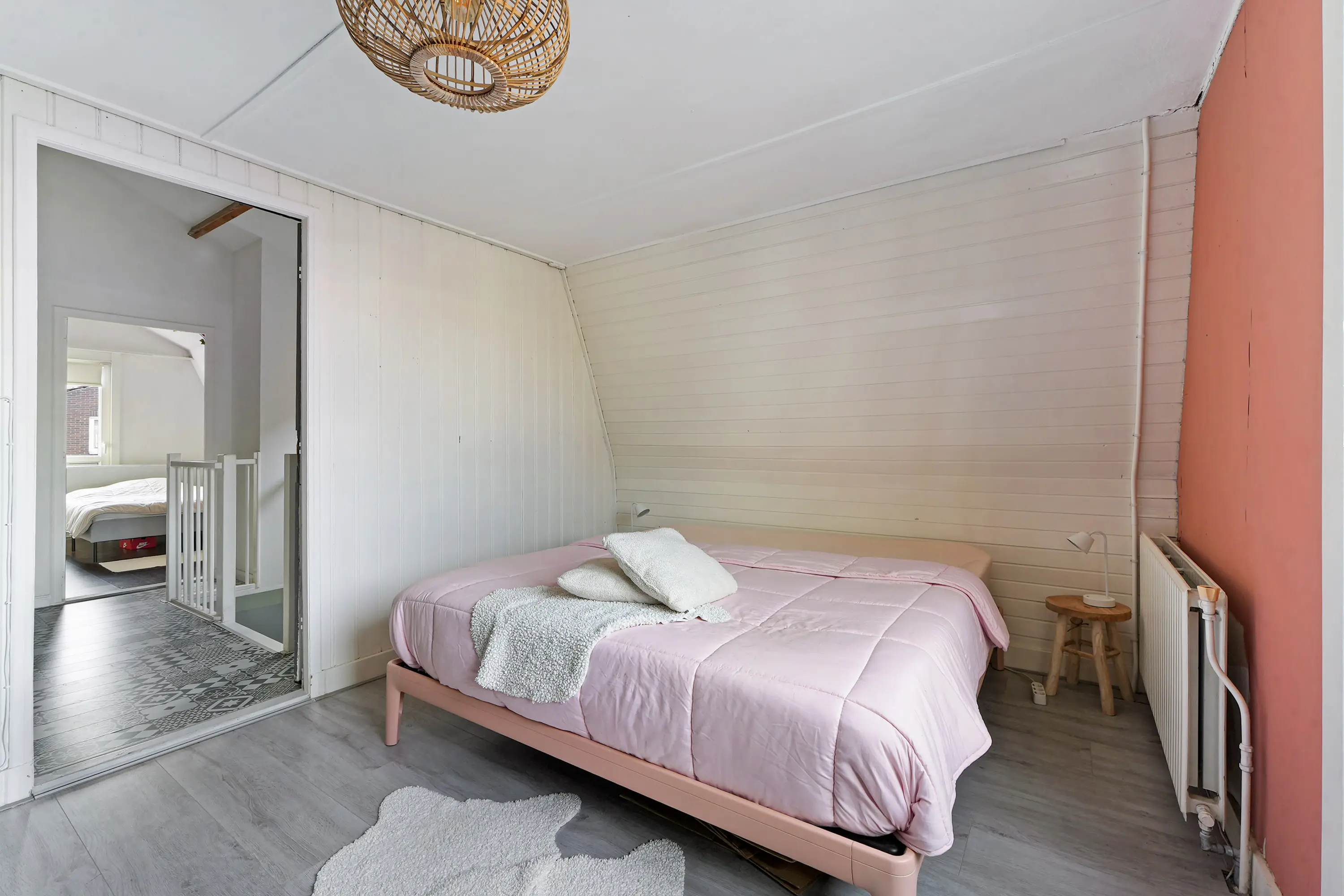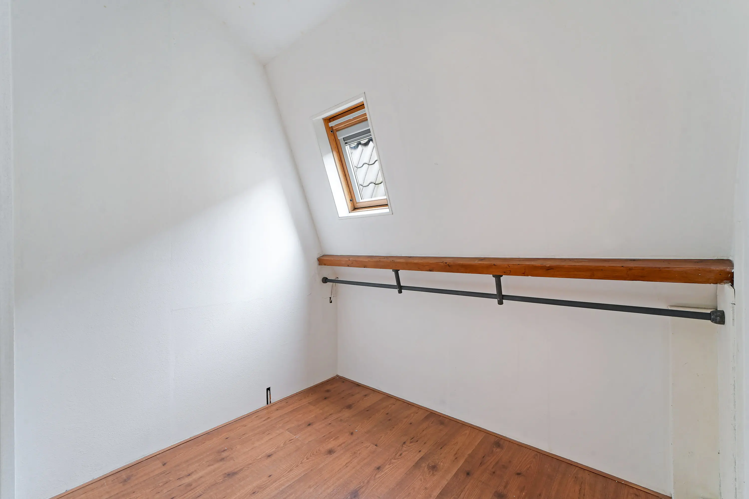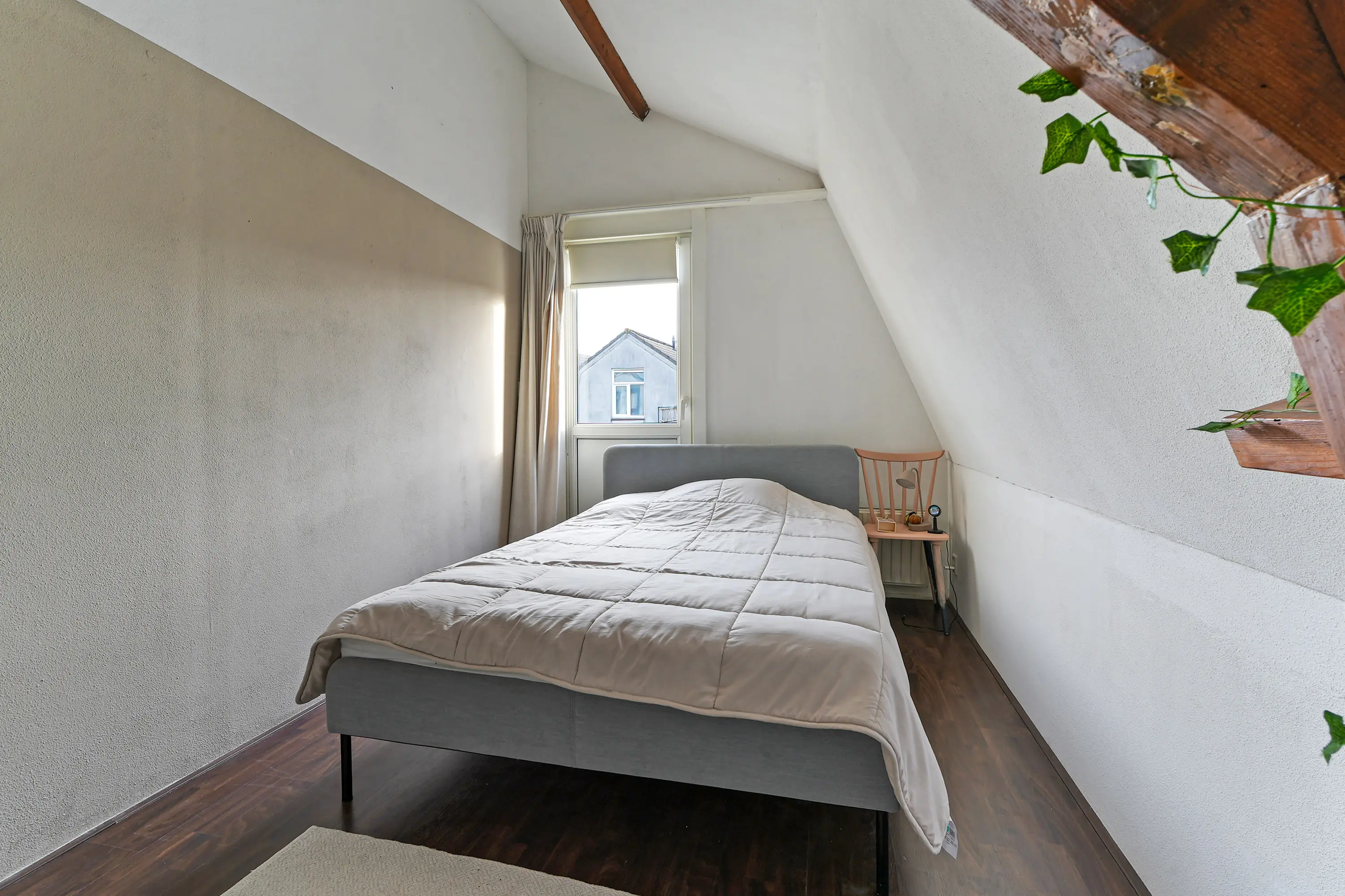 Op de verdieping bevinden zich maar liefst vier goed bruikbare slaapkamers. Aan de voorzijde ligt een royale ouderslaapkamer. Aan de achterzijde zijn twee praktische slaapkamers gesitueerd, waarvan één toegang biedt tot een prettig dakterras. Tussen deze kamers bevindt zich een extra kamer die uitstekend dienst kan doen als slaap-, werk- of hobbykamer. De openslaande deuren naar het Franse balkon in de slaapkamer aan de voorzijde zijn voorzien van een handbediend rolluik. Via de eerste verdieping heeft u toegang tot een ruime bergzolder, voorzien van een nieuwe vloer, waardoor deze daadwerkelijk beloopbaar is. U kunt er niet rechtop lopen, maar de zolder beschikt over voldoende draagkracht om door volwassenen te worden betreden en om te gebruiken voor de opslag van (zware) spullen en dozen. De toegang is zichtbaar op de foto op de overloop: de grijze deur bovenin.