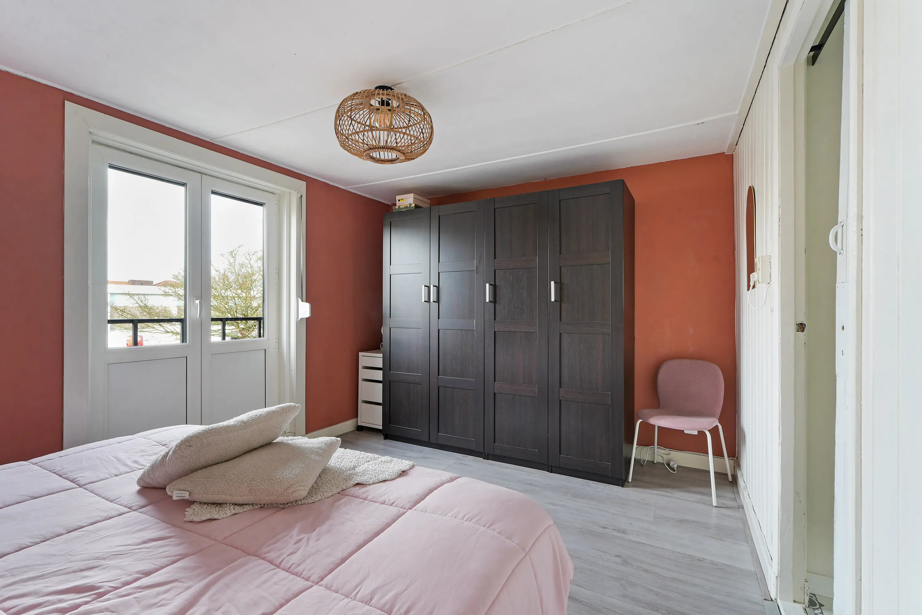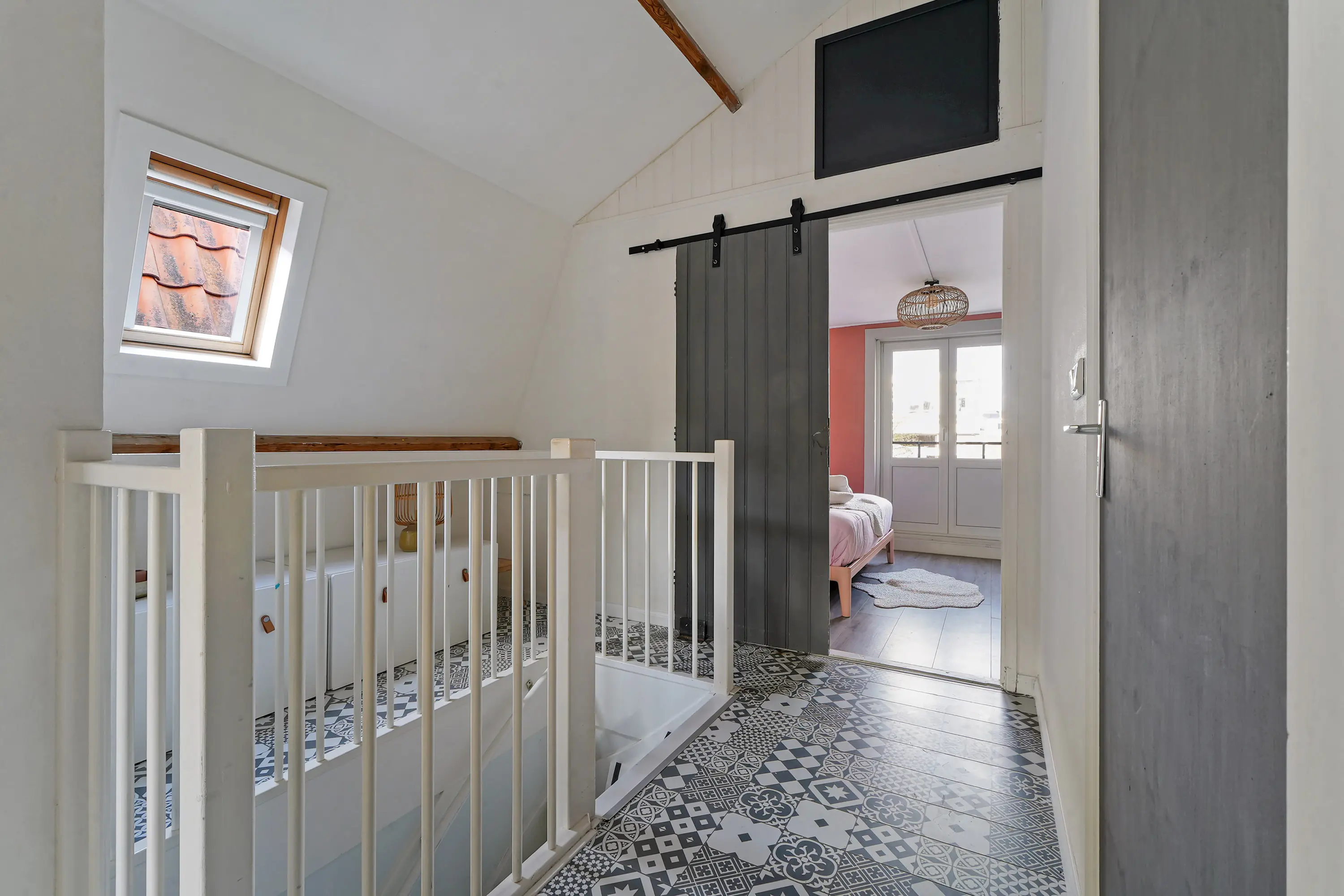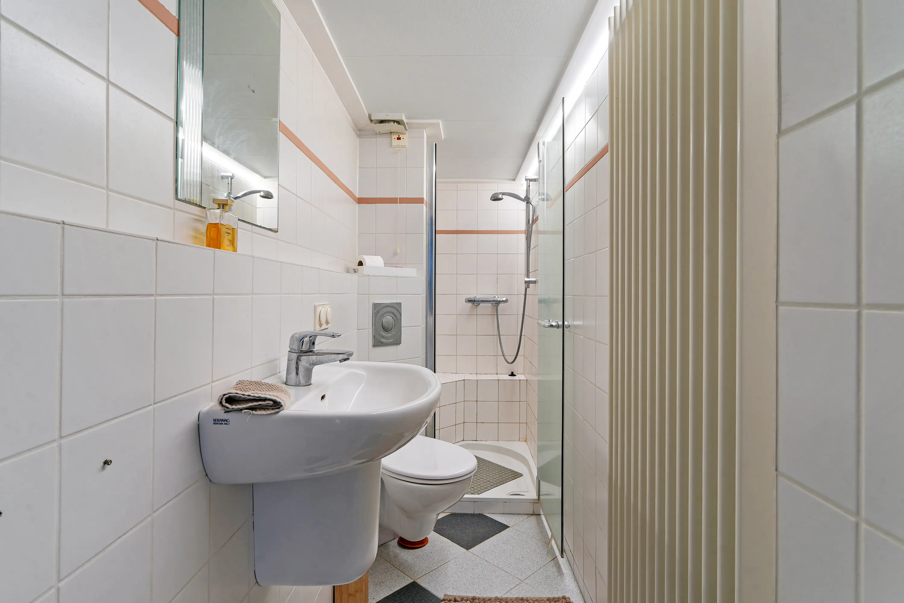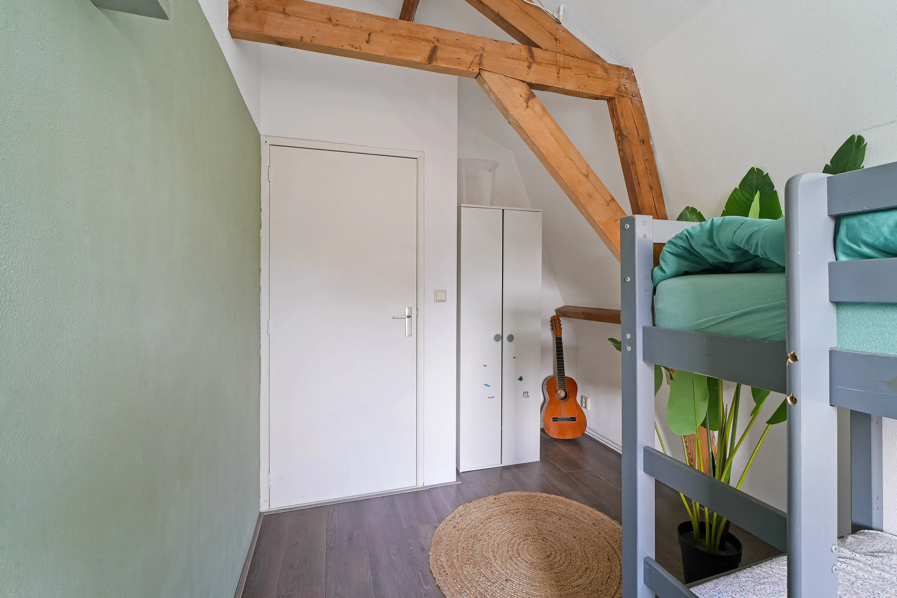 Op de verdieping bevinden zich maar liefst vier goed bruikbare slaapkamers. Aan de voorzijde ligt een royale ouderslaapkamer. Aan de achterzijde zijn twee praktische slaapkamers gesitueerd, waarvan één toegang biedt tot een prettig dakterras. Tussen deze kamers bevindt zich een extra kamer die uitstekend dienst kan doen als slaap-, werk- of hobbykamer. De openslaande deuren naar het Franse balkon in de slaapkamer aan de voorzijde zijn voorzien van een handbediend rolluik. Via de eerste verdieping heeft u toegang tot een ruime bergzolder, voorzien van een nieuwe vloer, waardoor deze daadwerkelijk beloopbaar is. U kunt er niet rechtop lopen, maar de zolder beschikt over voldoende draagkracht om door volwassenen te worden betreden en om te gebruiken voor de opslag van (zware) spullen en dozen. De toegang is zichtbaar op de foto op de overloop: de grijze deur bovenin.