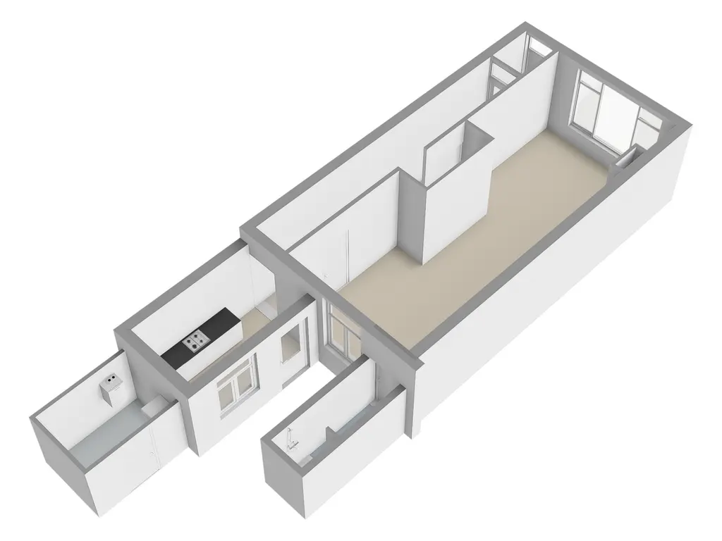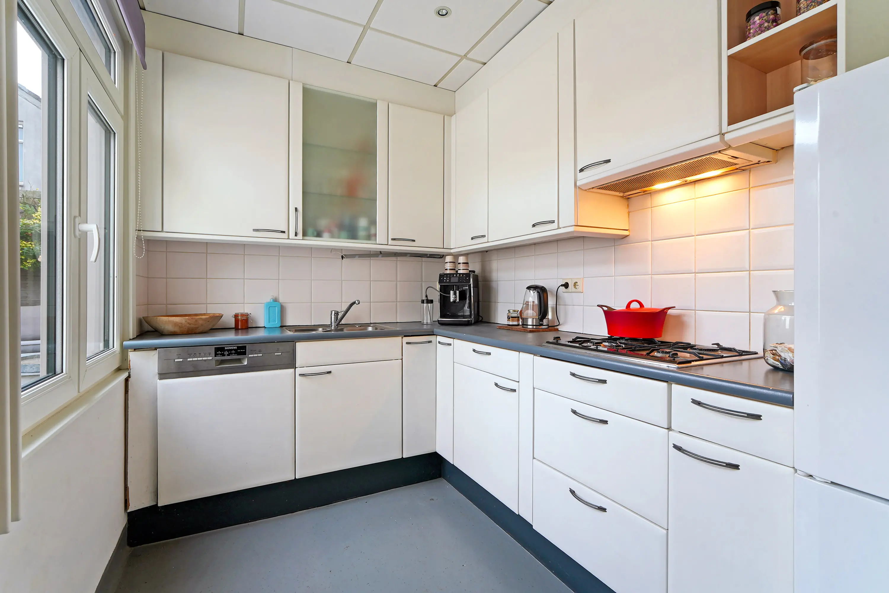 Aan de achterzijde is de woning uitgebouwd, waar u de keuken aantreft. Deze is iets ouder, maar keurig onderhouden en voorzien van diverse inbouwapparatuur. In de uitbouw bevindt zich tevens de badkamer met douche, wastafel en toilet.