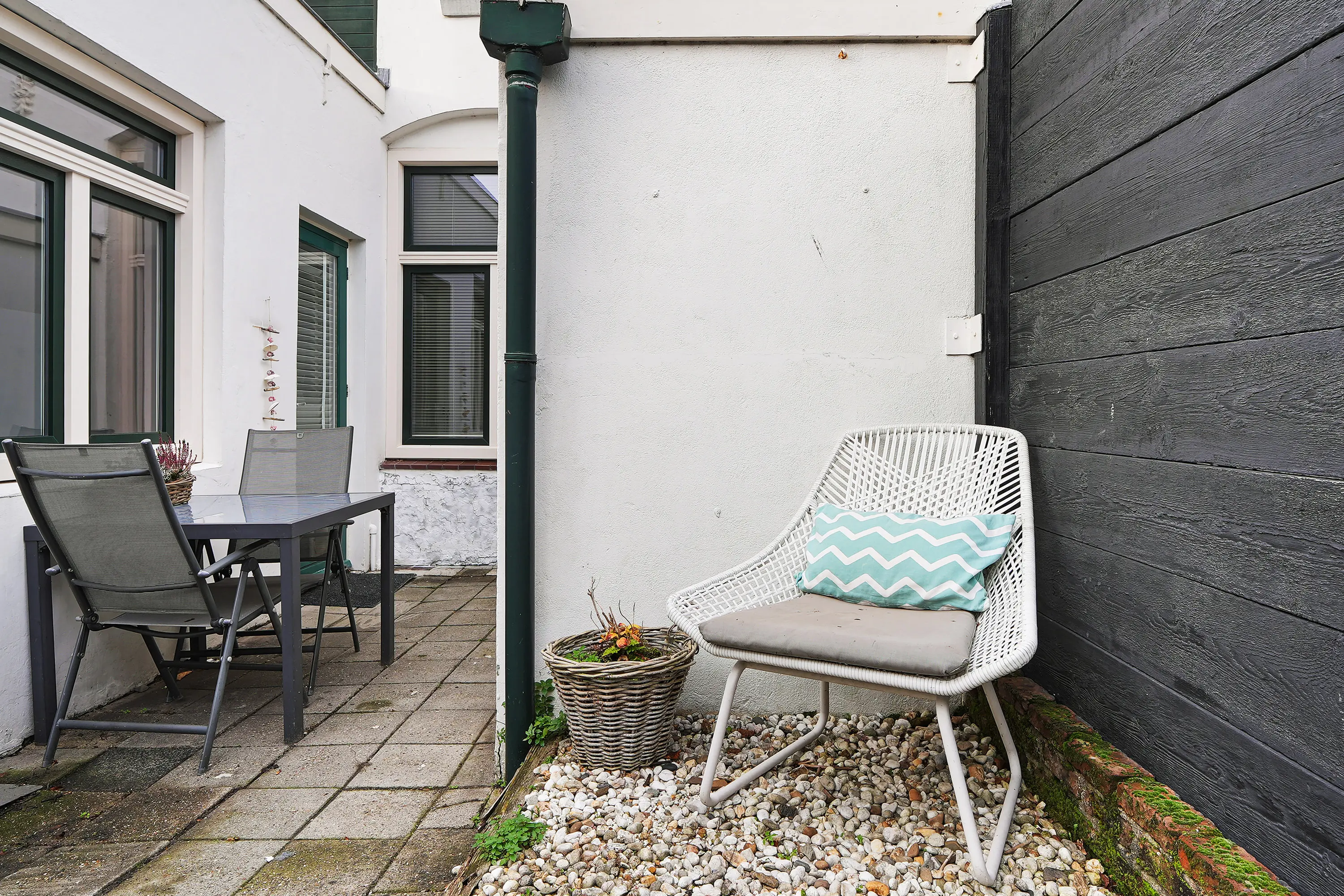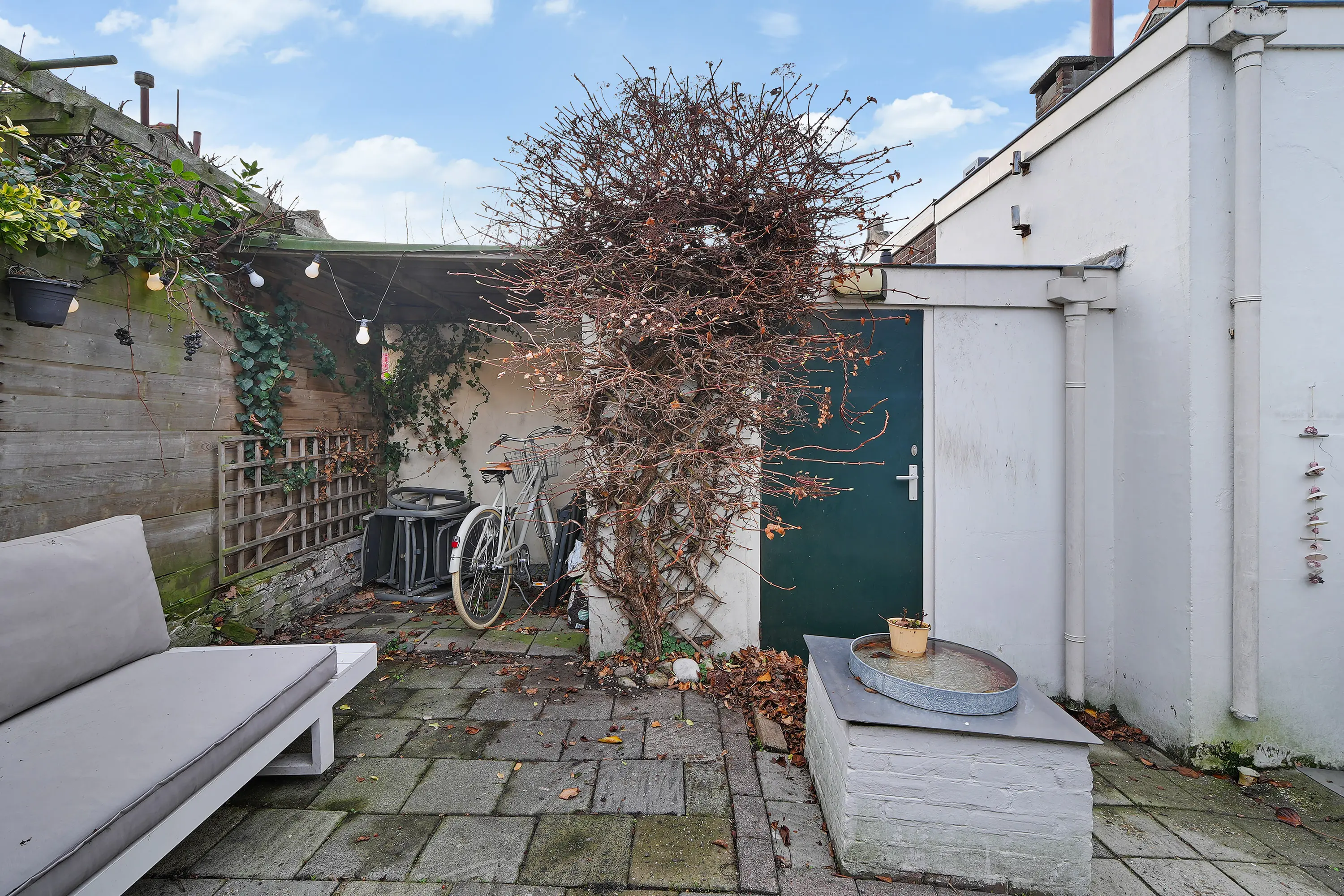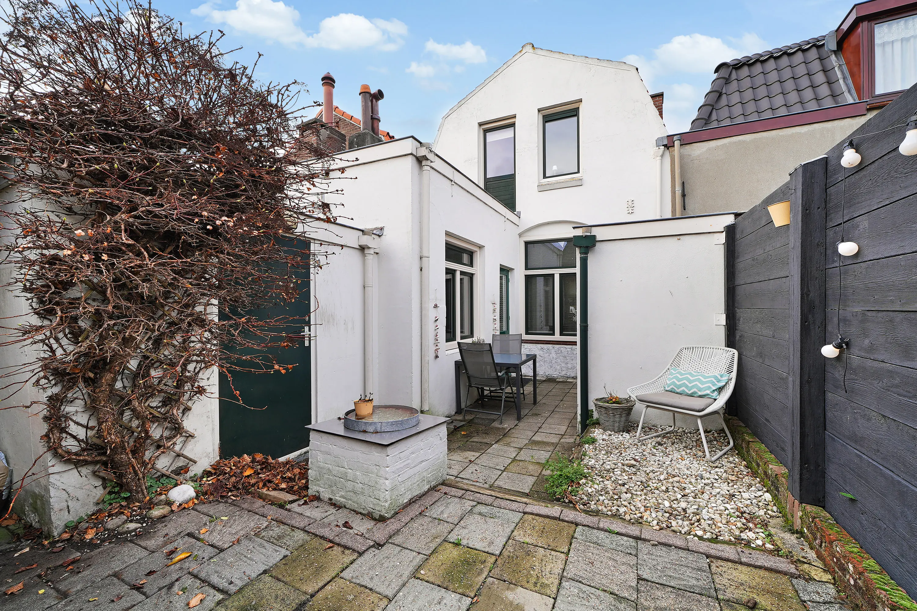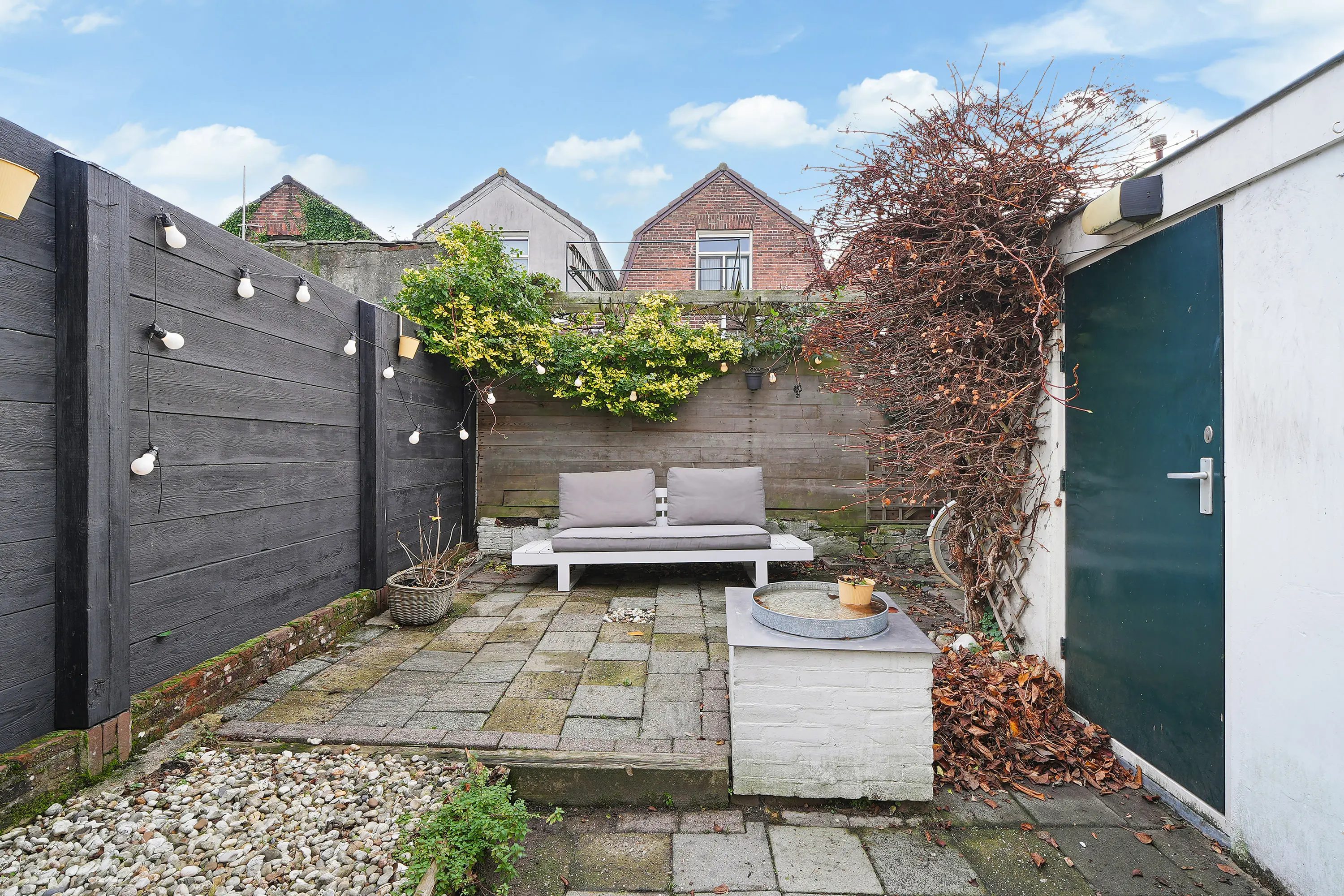 Achter de woning ligt een gezellige stadstuin op het zuiden. Een fijne plek om in alle rust van de zon te genieten, te ontspannen of gezellig buiten te zitten tijdens lange zomeravonden.