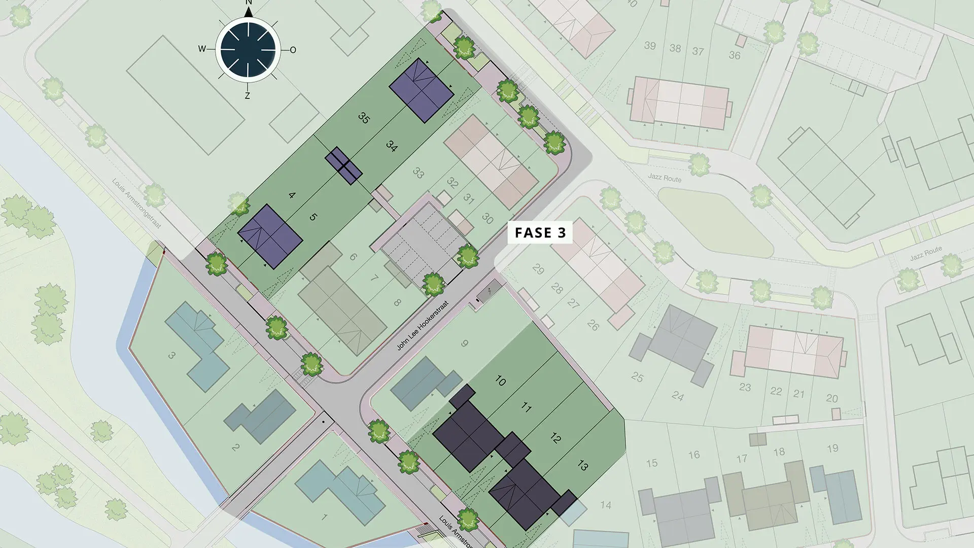 Er zijn 2 blokjes van twee-onder-één-kapwoningen. In deze 2 blokjes zit het verschil in de kap: er is een woning met een langskap en een woning met een dwarskap. De woningen met langskap hebben een beukmaat van 5.7 meter en 130 m² woonoppervlakte (bouwnummer 5 en 34). De blokken liggen tegenover elkaar met aangrenzende tuinen aan de achterzijde. De woningen met de dwarskap hebben nog eens 10 m² woonoppervlakte meer (bouwnummer 4 en 35). De variatie in de gevels en de kappen geeft een mooi beeld in de straat en ook belangrijk; er is keuze in twee-onder-één-kapwoningen.