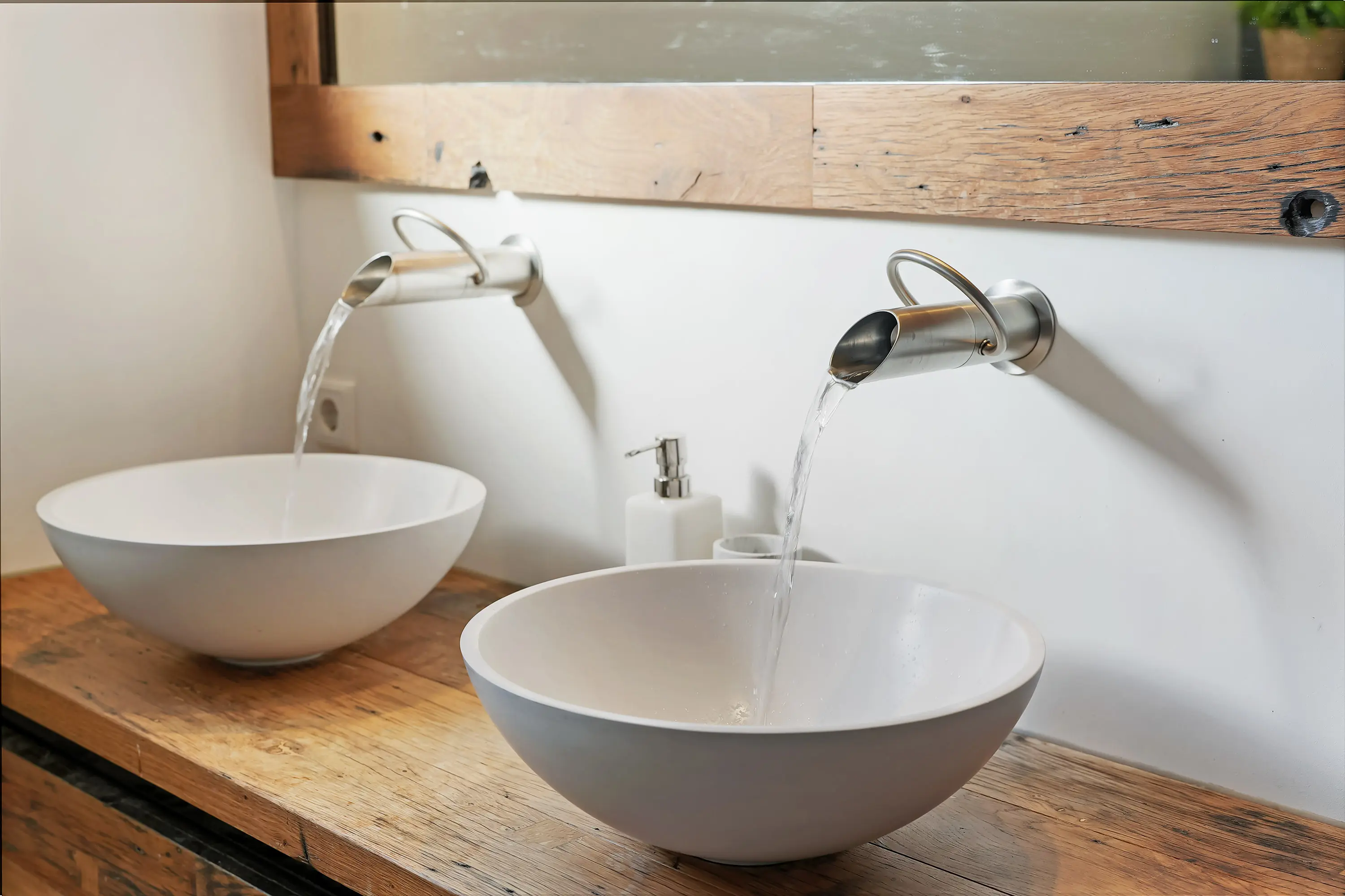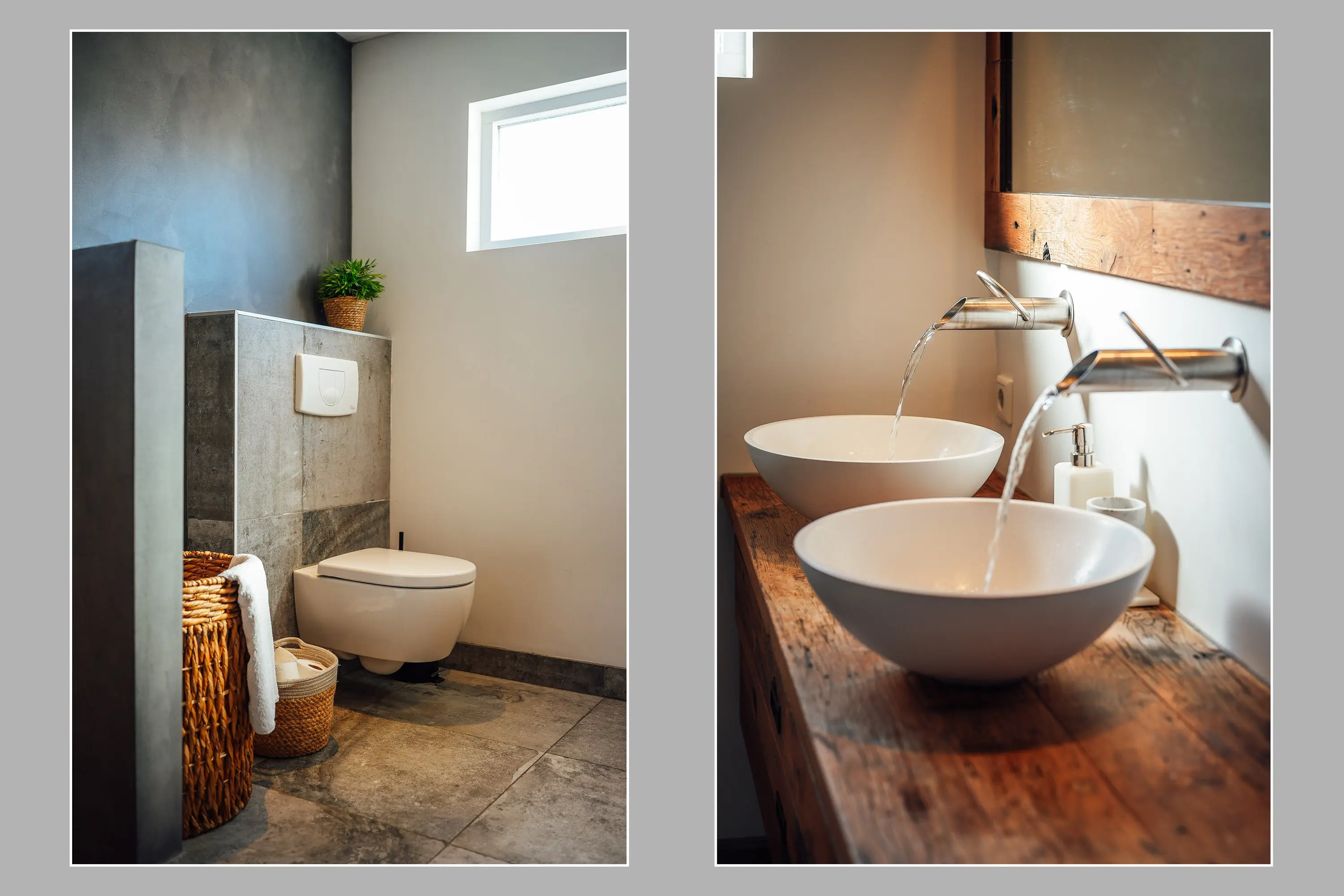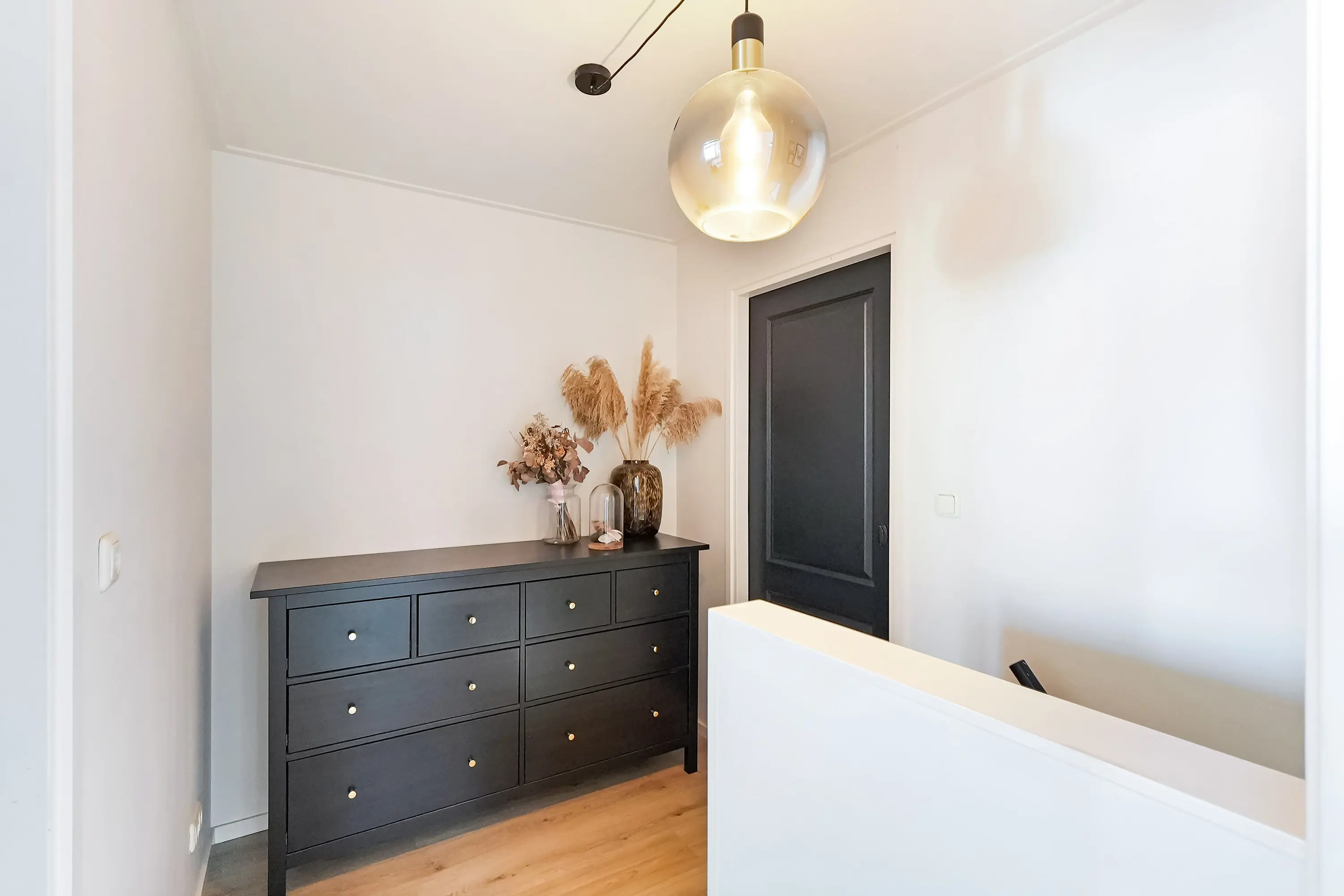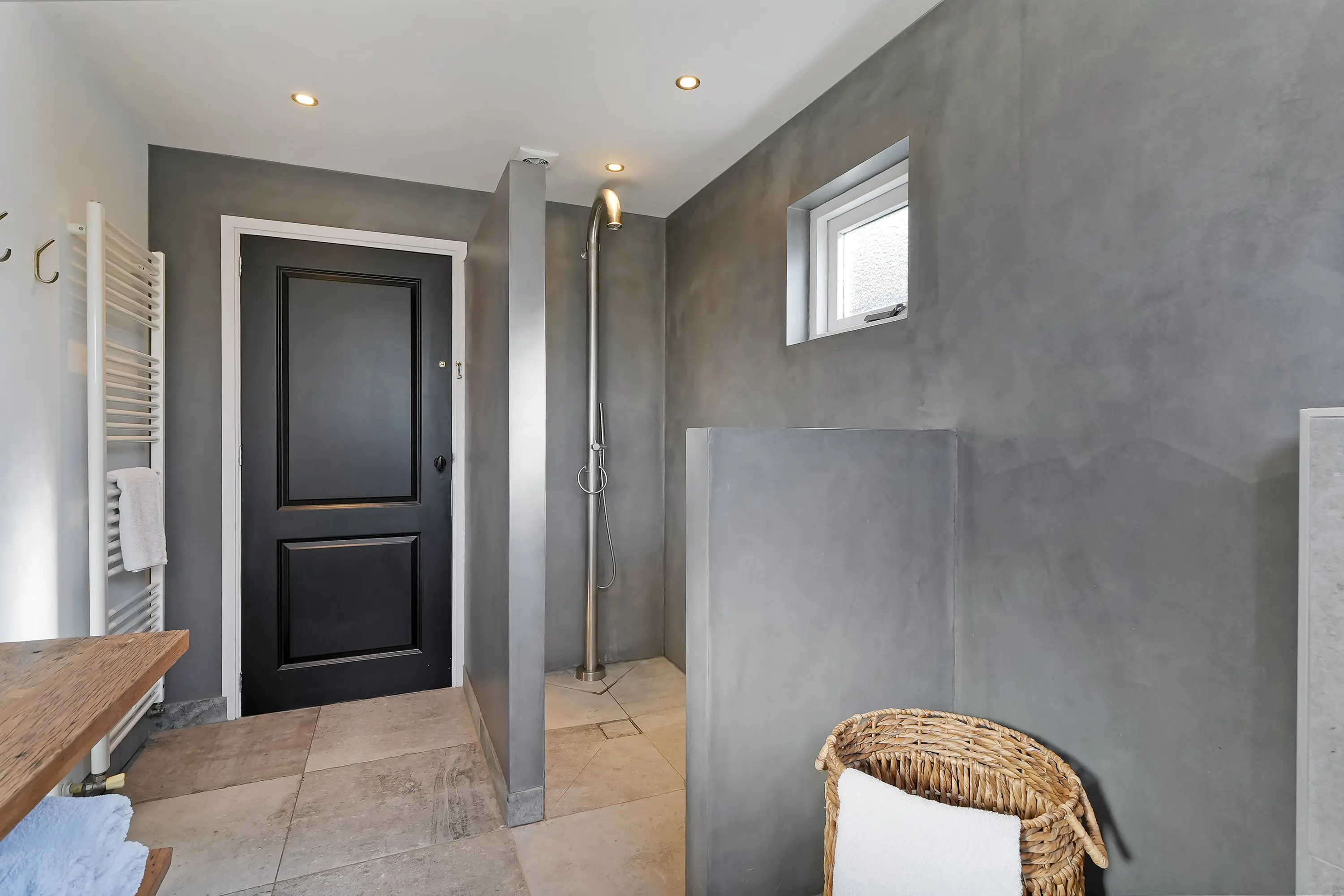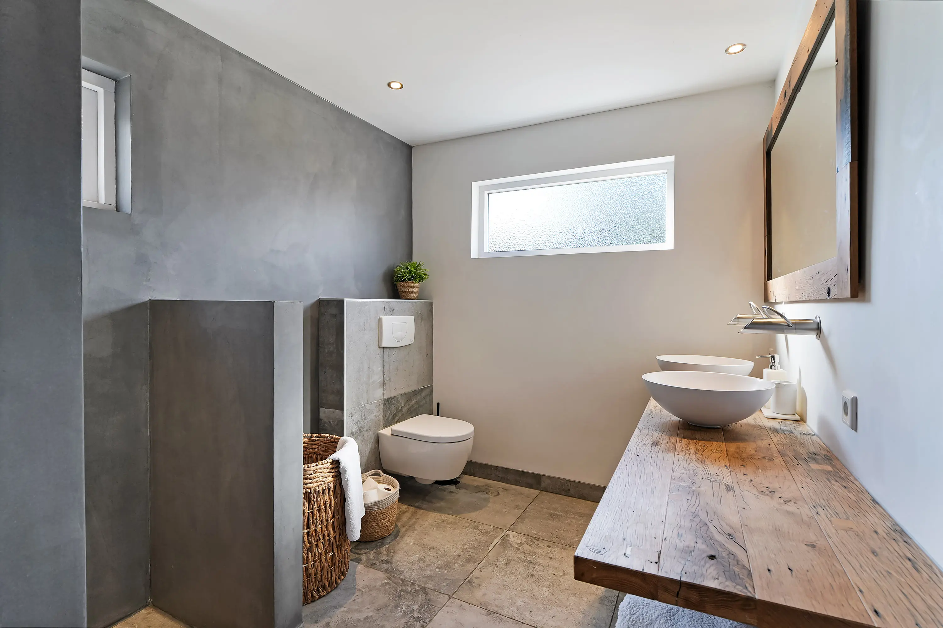 Een lange gang verbindt het woongedeelte met de trapopgang en geeft toegang tot het toilet en de luxe uitgevoerde badkamer. Deze badkamer is modern en stijlvol ingericht, met een ruime inloopdouche voorzien van een opvallend roestvrijstalen douchegarnituur. Ook de dubbele wastafel met RVS-uitloop geeft de ruimte een eigentijdse en hoogwaardige uitstraling. Daarnaast beschikt de badkamer over een tweede toilet, wat extra comfort biedt.