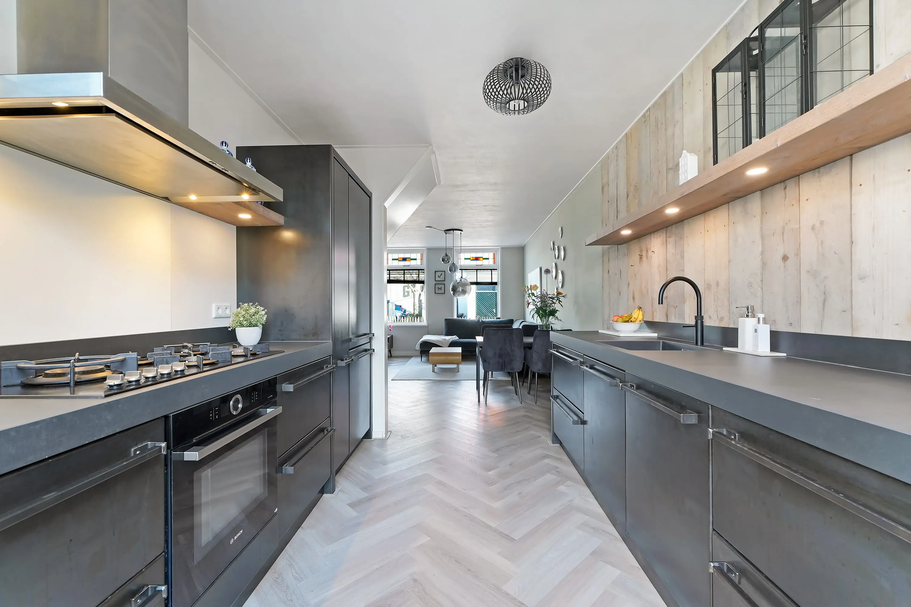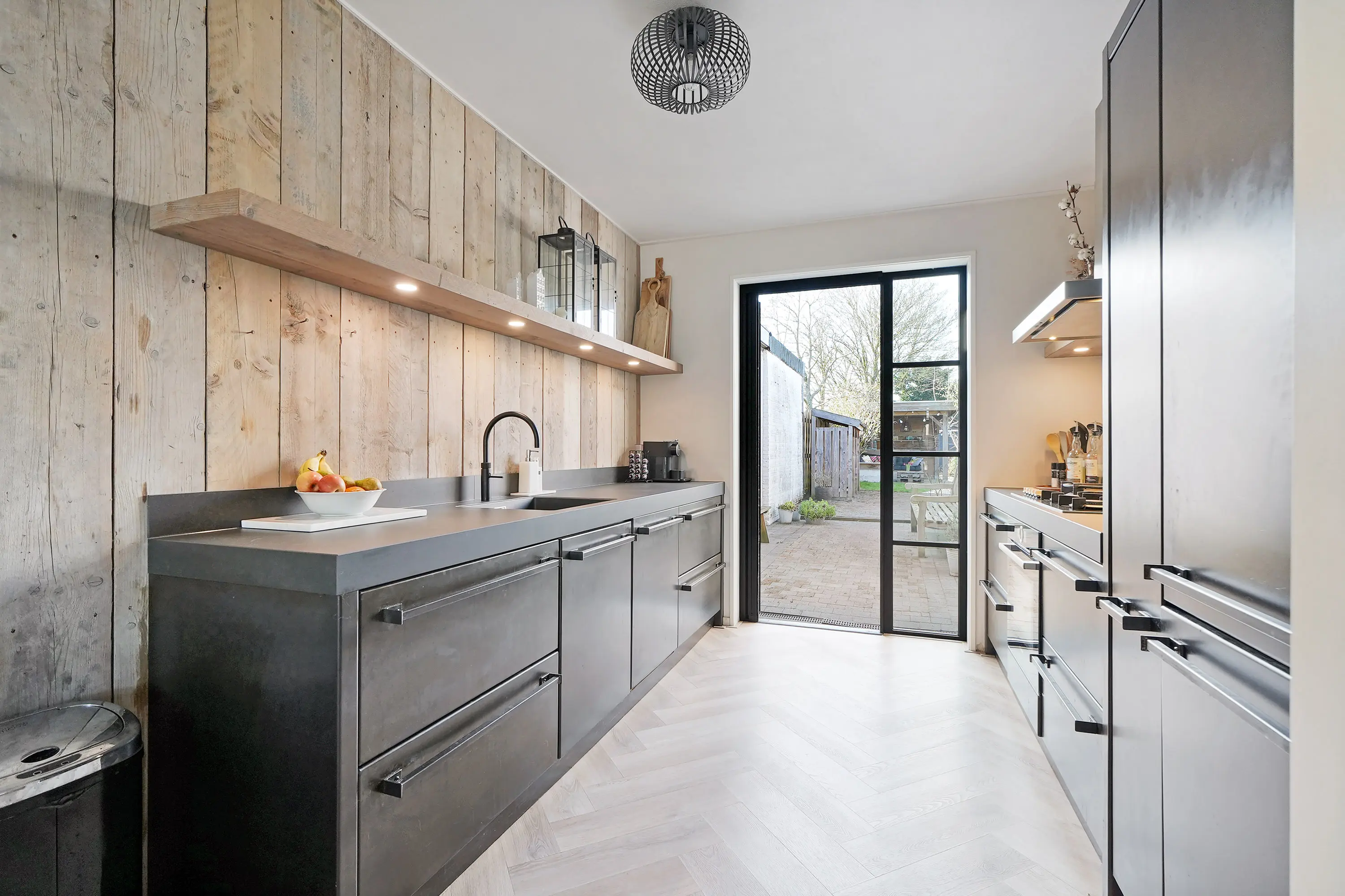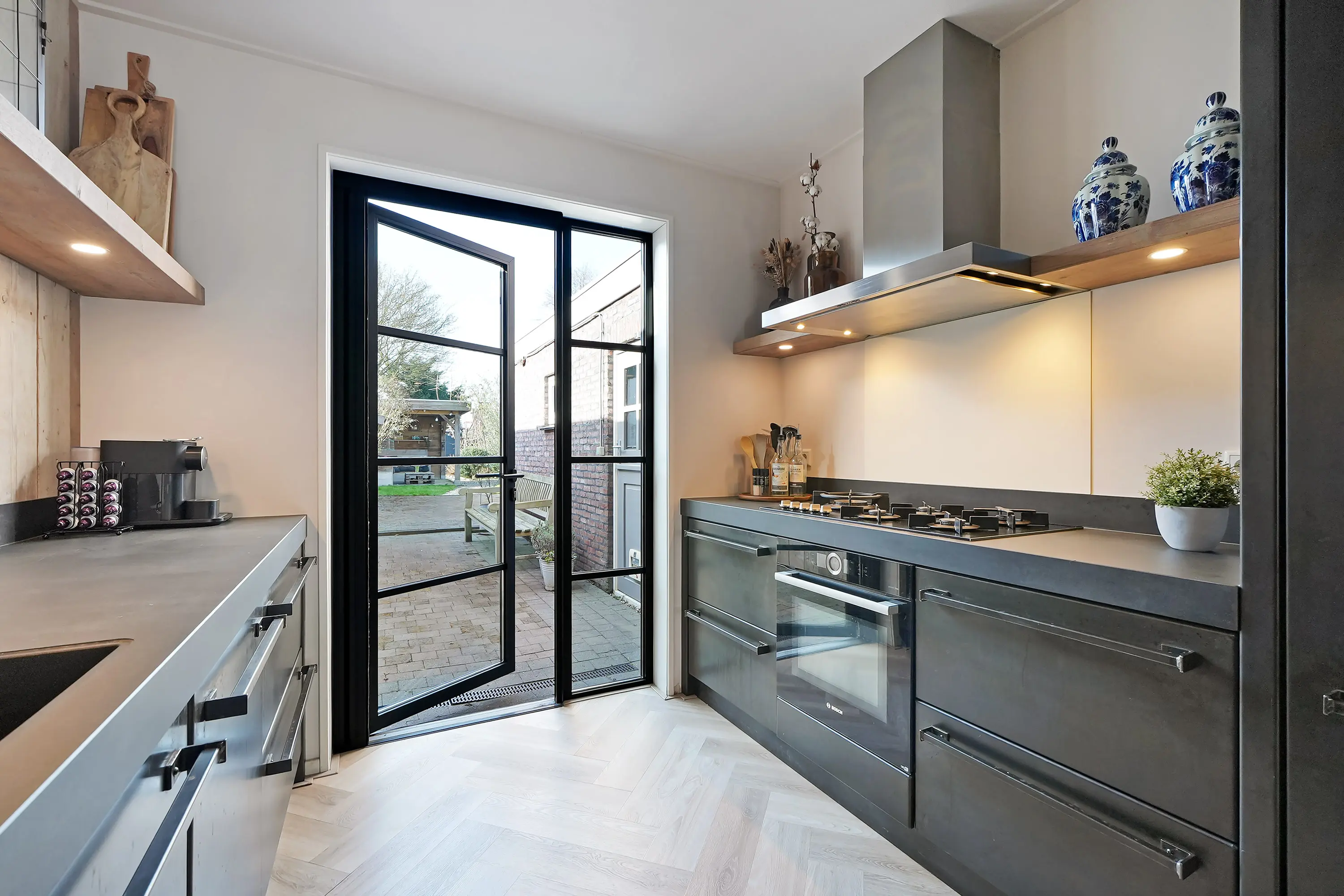 De open keuken is bereikbaar vanuit de woonkamer en vormt een echte blikvanger. Deze maatwerkkeuken is uitgevoerd in een moderne staalblauwe kleurstelling en uitgerust met diverse hoogwaardige inbouwapparatuur. Dankzij de grote zwarte aluminium pui staat de keuken in directe verbinding met de tuin en valt er volop daglicht naar binnen.