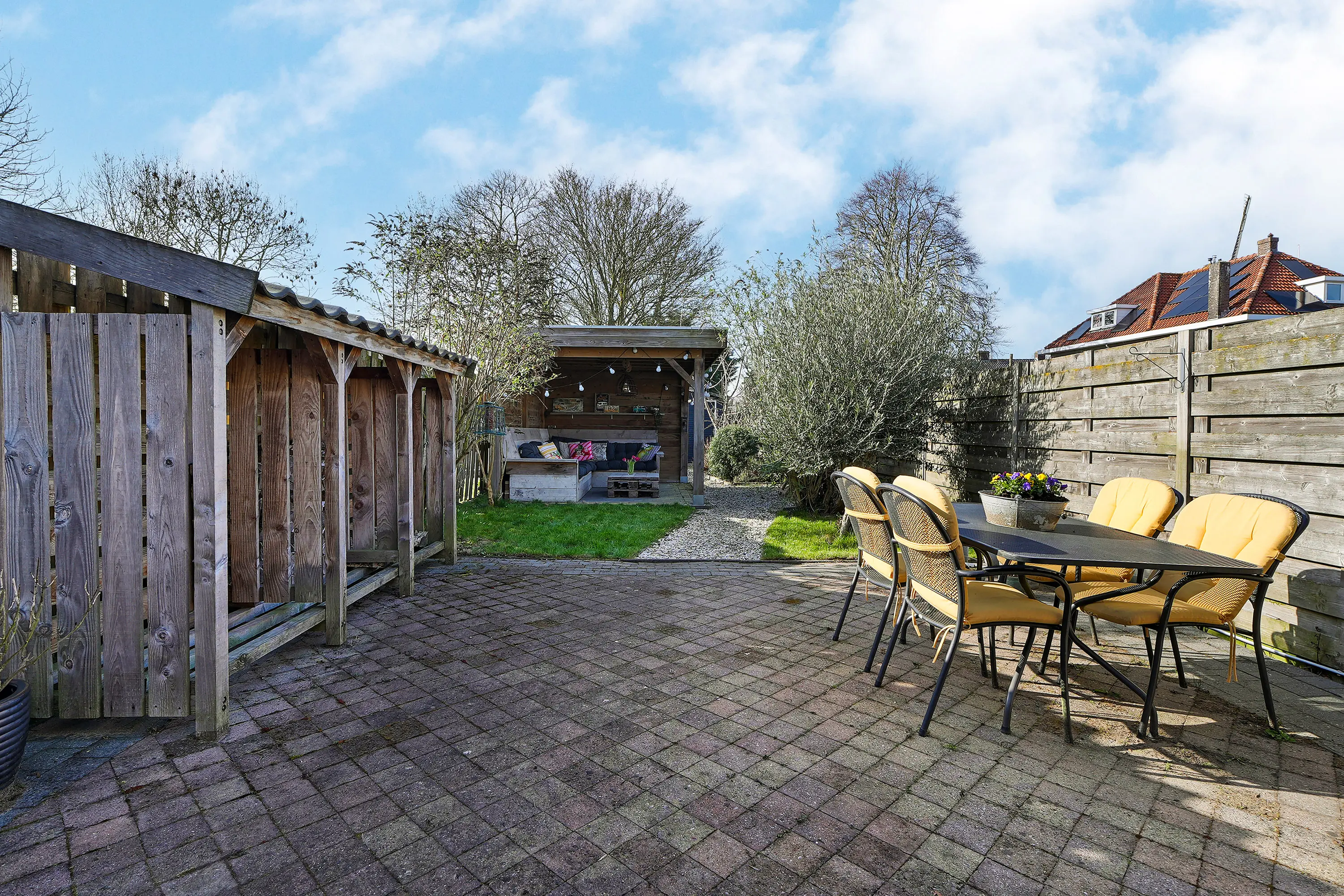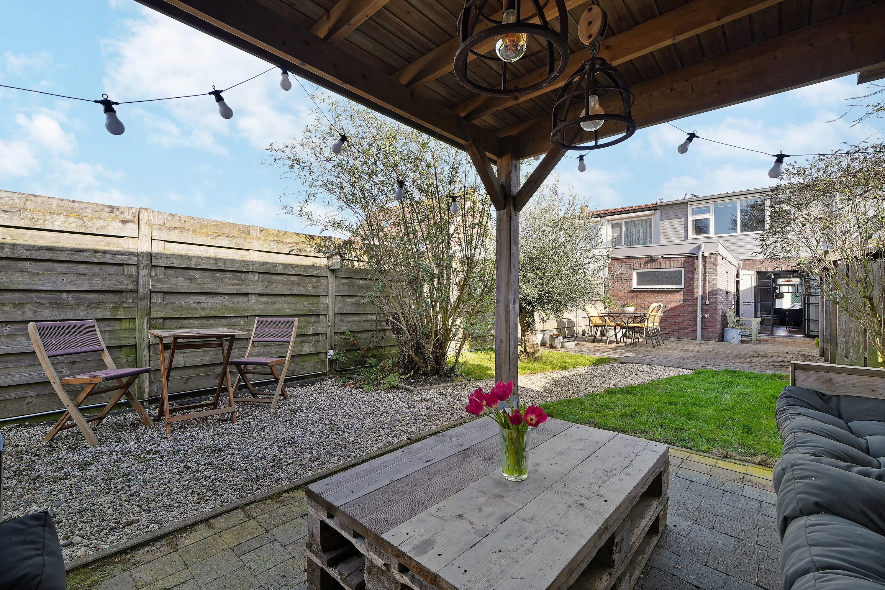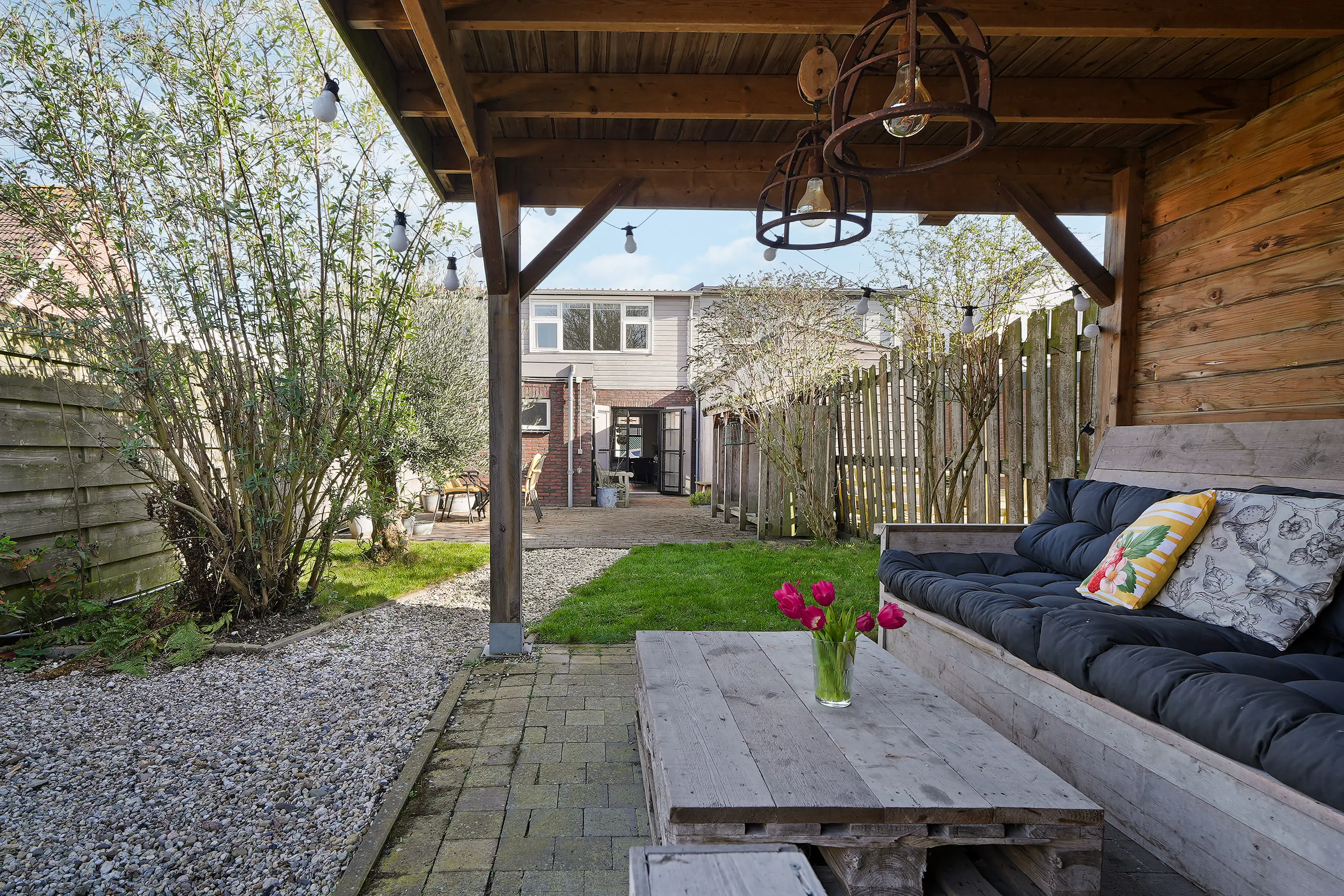 Achter de woning ligt een bijzonder diepe en fraai aangelegde achtertuin van circa 30 meter, een zeldzaamheid. Halverwege de tuin bevindt zich een sfeervolle veranda waar je op warme dagen een aangenaam schaduwplekje vindt en waar je tot in de late uurtjes kunt genieten van lange zomeravonden. Een bijzonder grote en unieke tuin met veel privacy! Het totale perceeloppervlak bedraagt maar liefst 222 m².