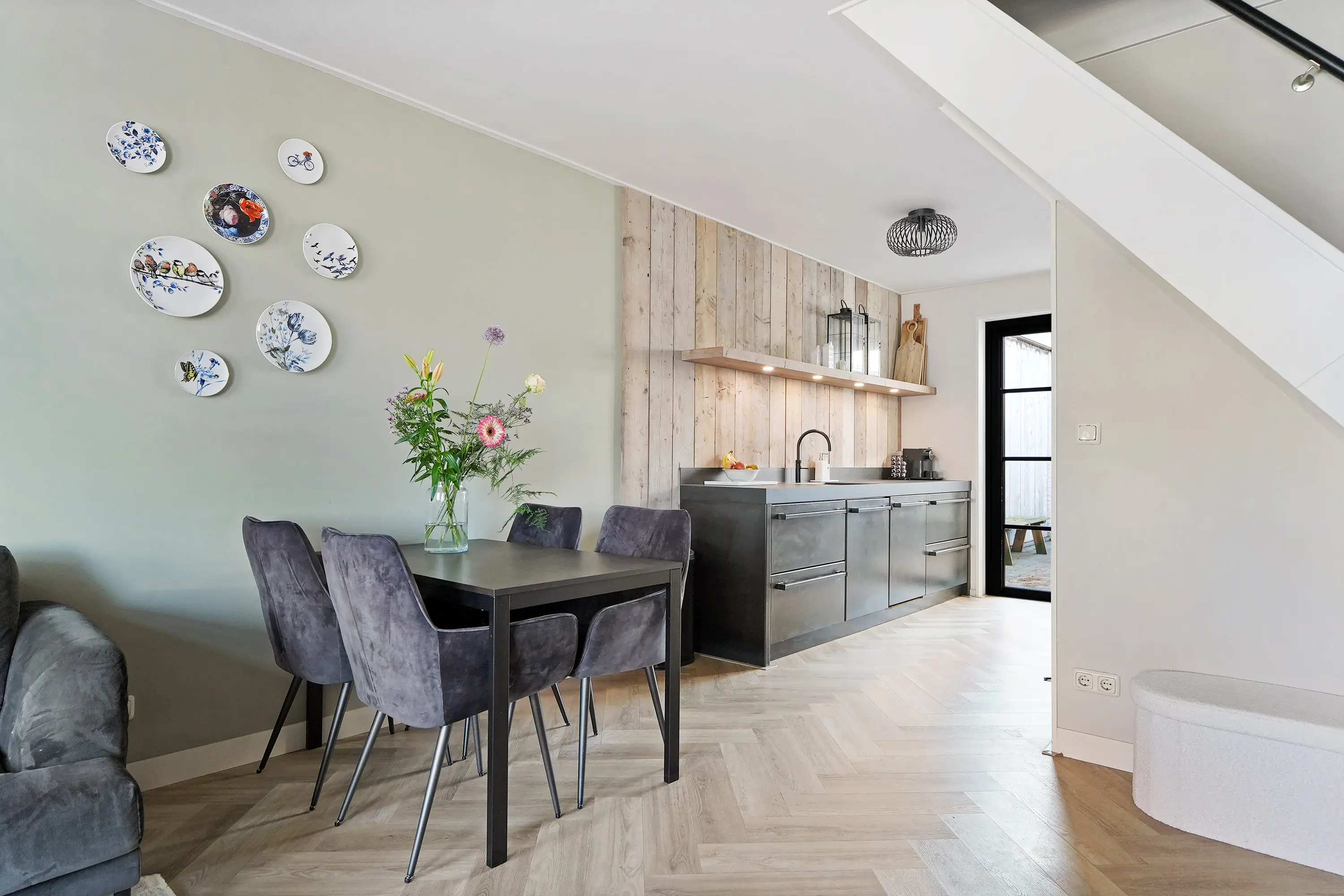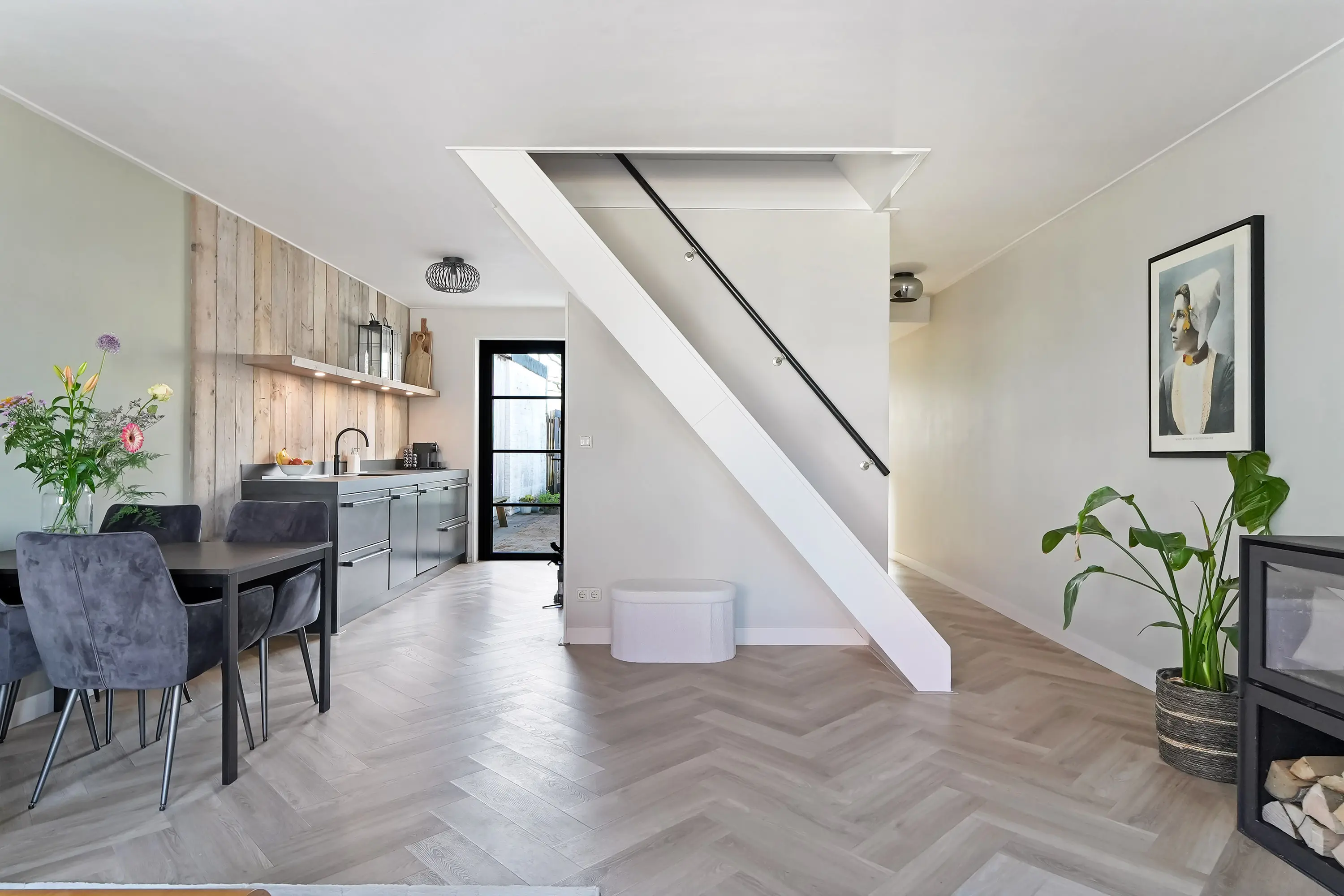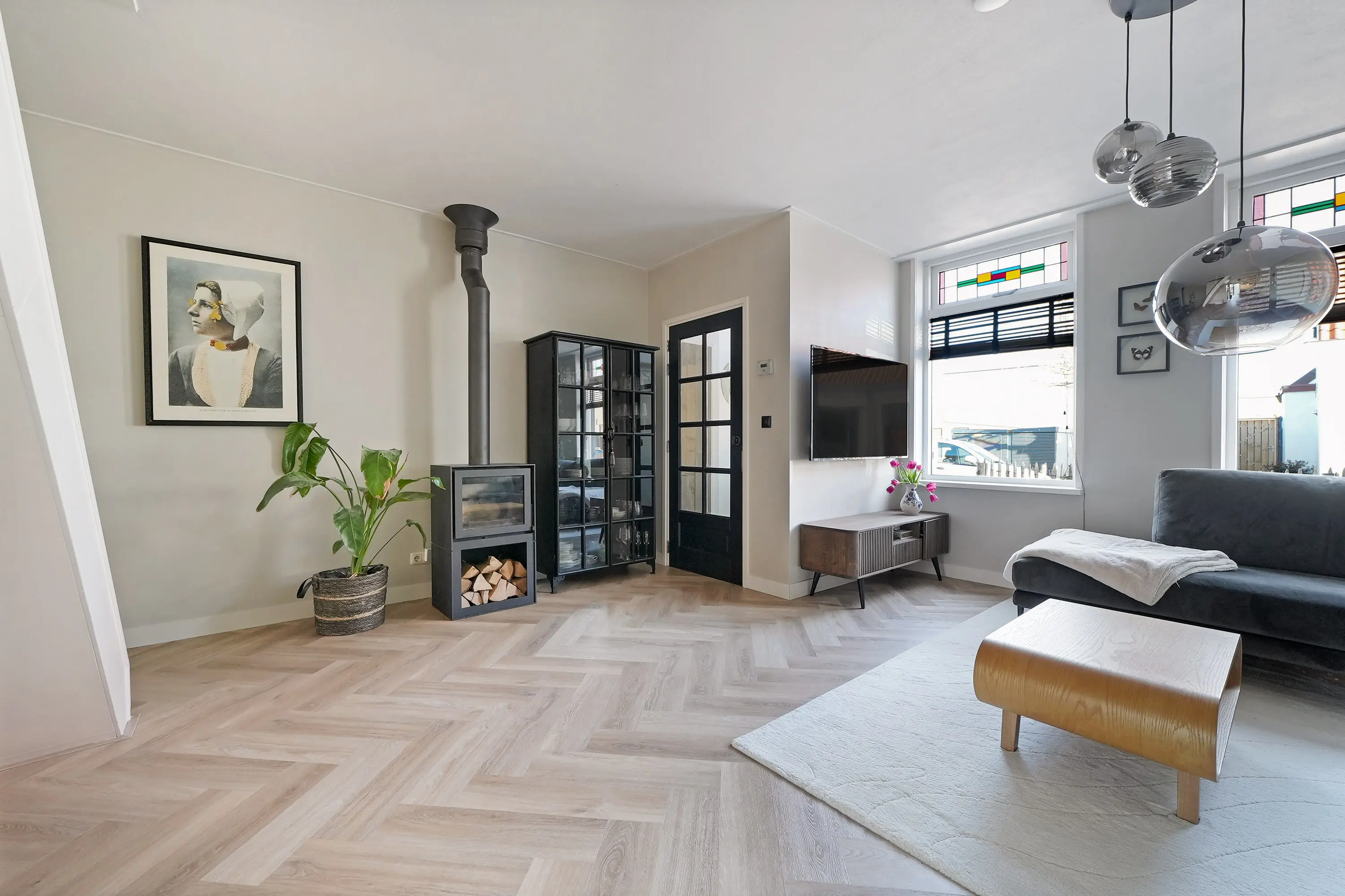 Via de entree kom je binnen in de hal, die toegang biedt tot de sfeervolle woonkamer. Deze royale L-vormige leefruimte vormt het hart van het huis en kenmerkt zich door een fraaie visgraat vloer met comfortabele vloerverwarming. De houtkachel zorgt hier voor extra warmte en een gezellige ambiance tijdens de koudere maanden.