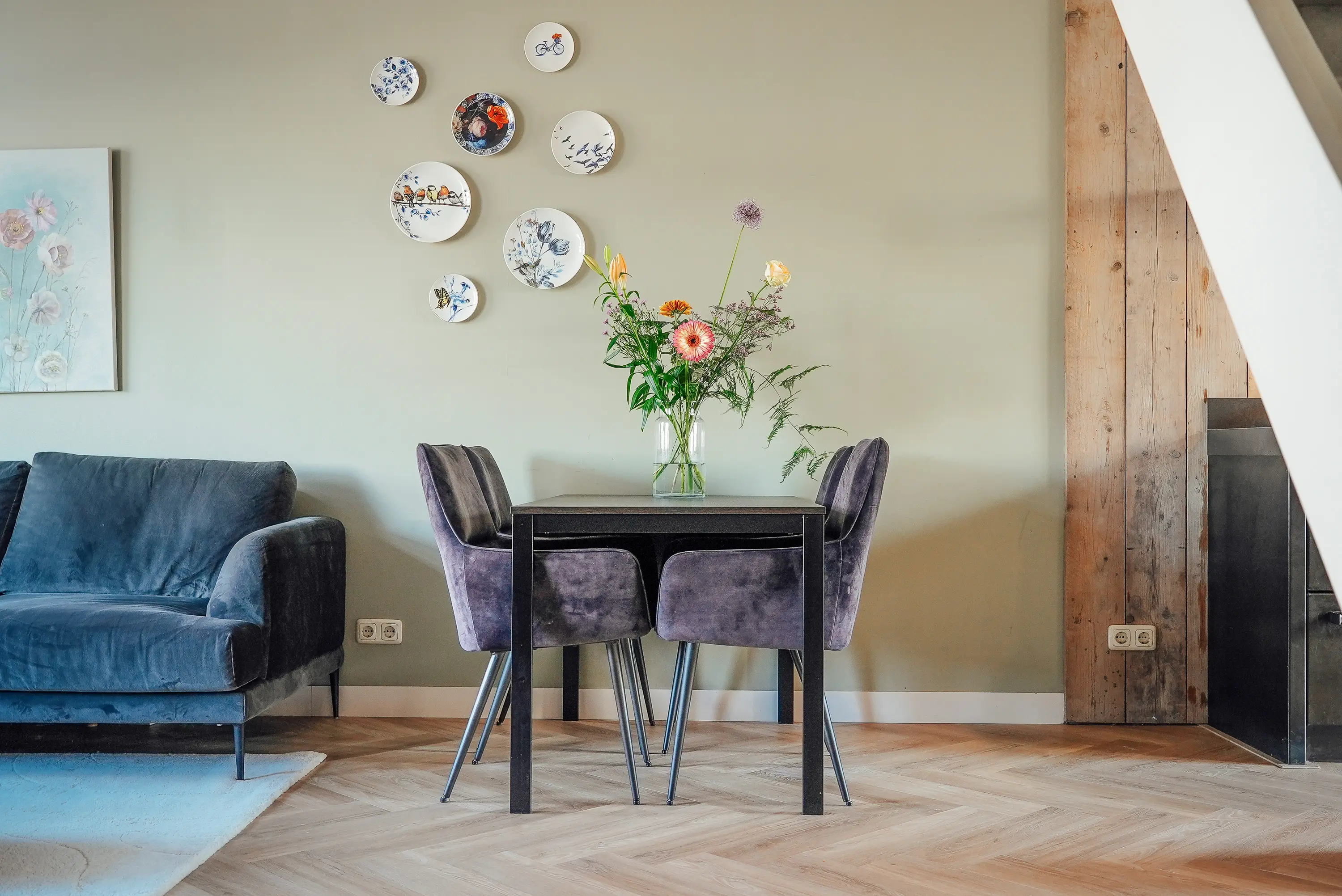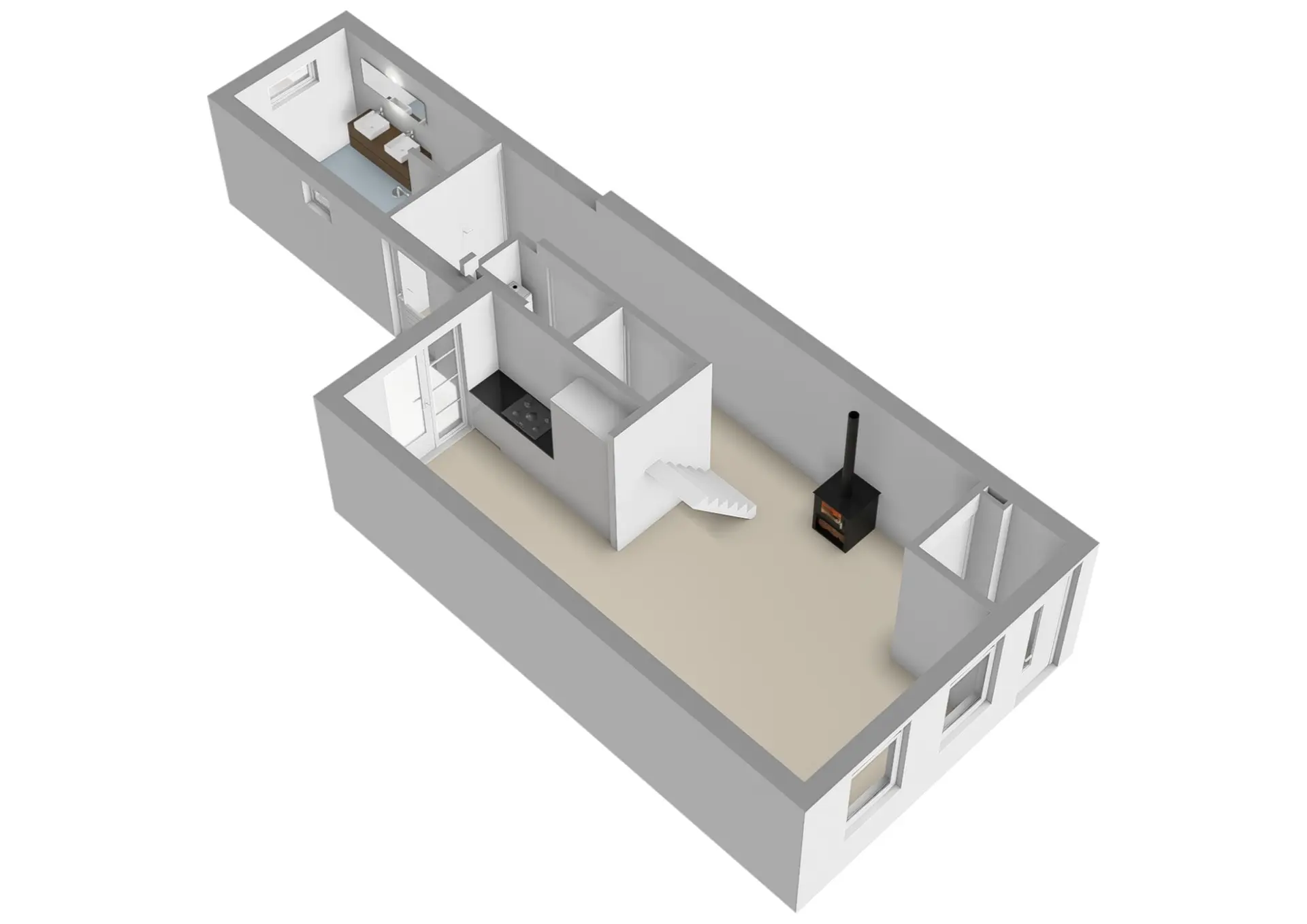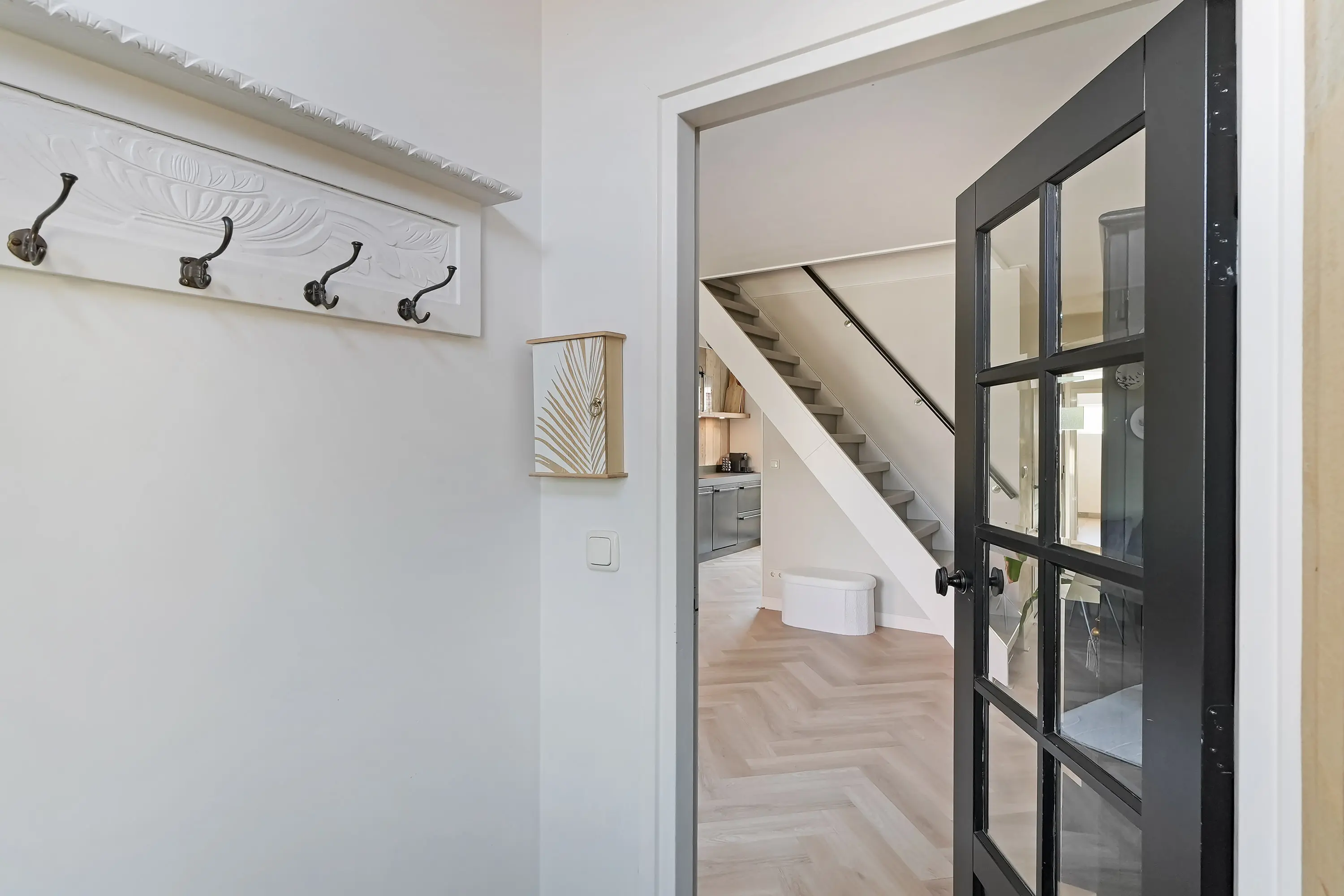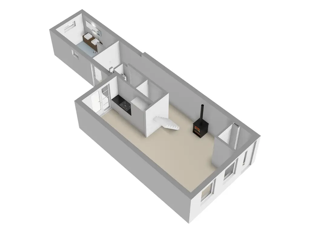 Via de entree kom je binnen in de hal, die toegang biedt tot de sfeervolle woonkamer. Deze royale L-vormige leefruimte vormt het hart van het huis en kenmerkt zich door een fraaie visgraat vloer met comfortabele vloerverwarming. De houtkachel zorgt hier voor extra warmte en een gezellige ambiance tijdens de koudere maanden.