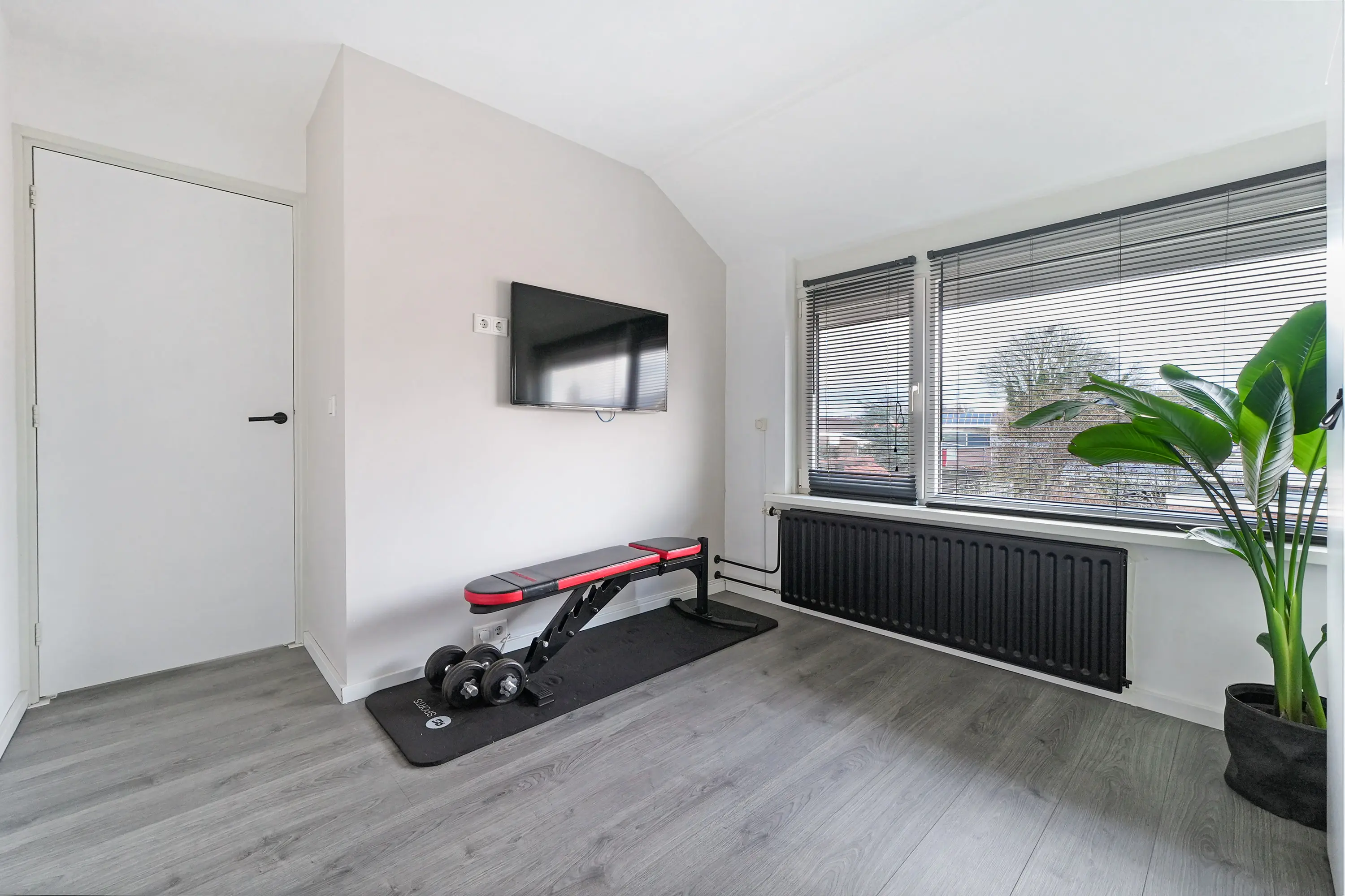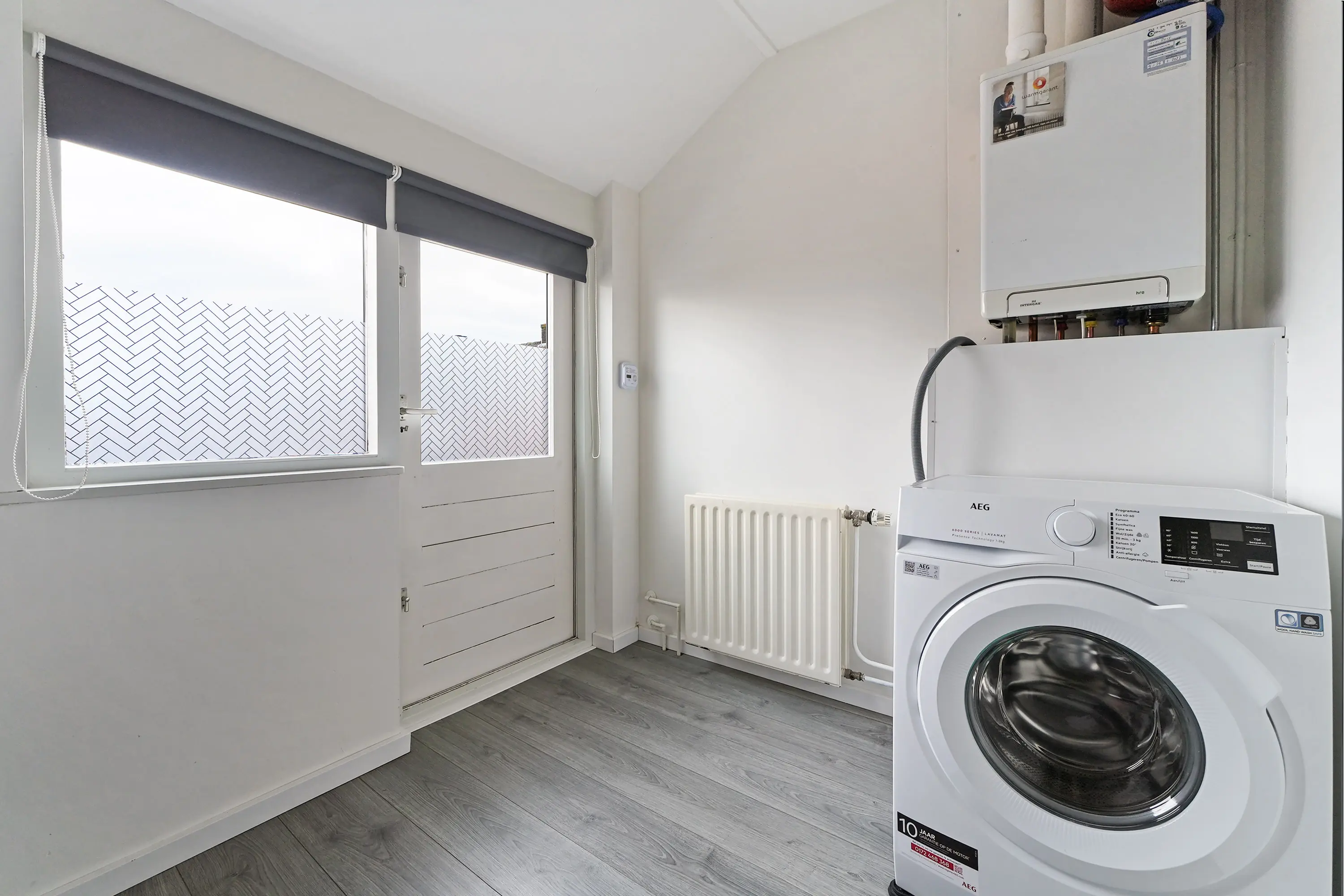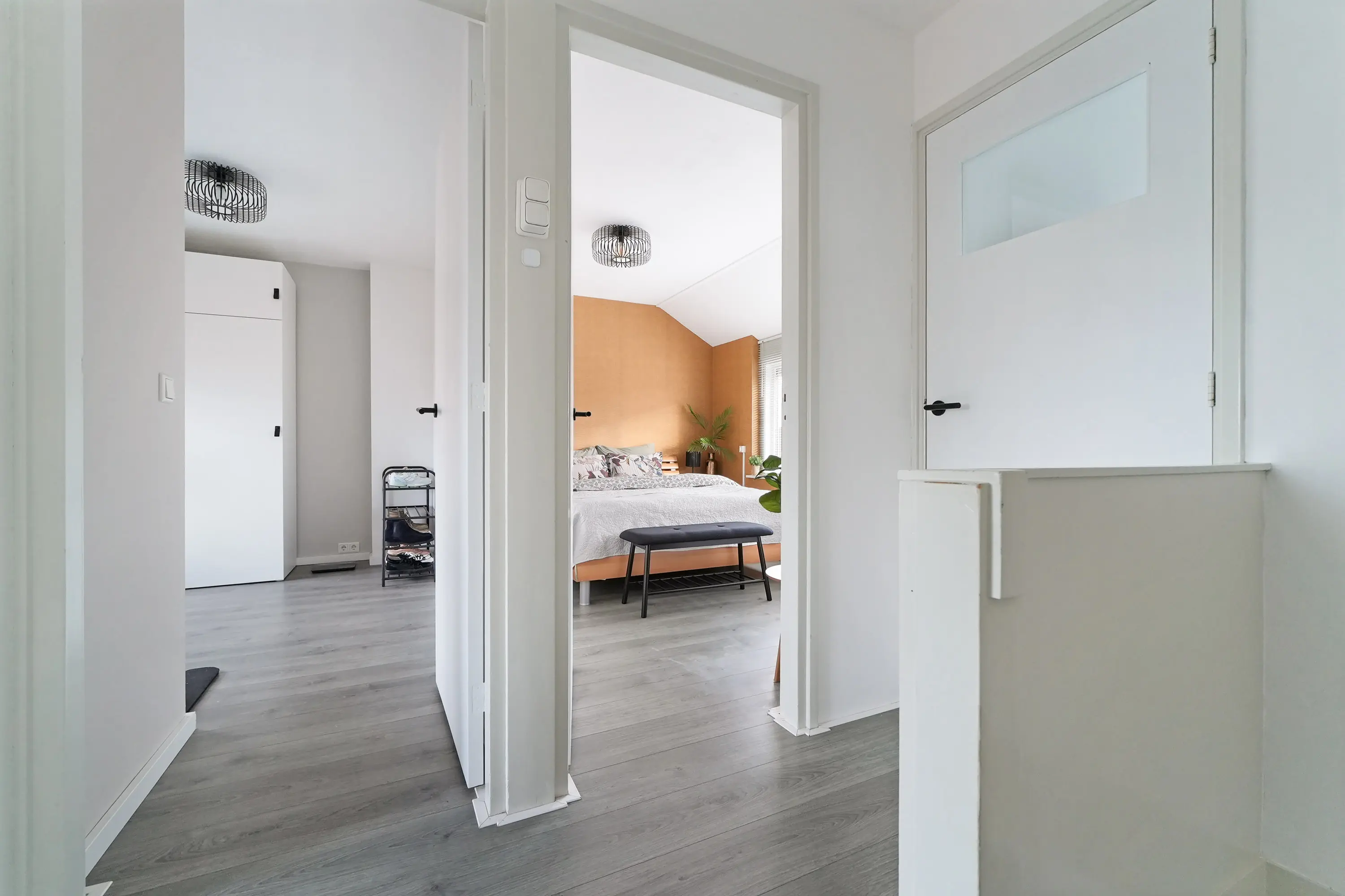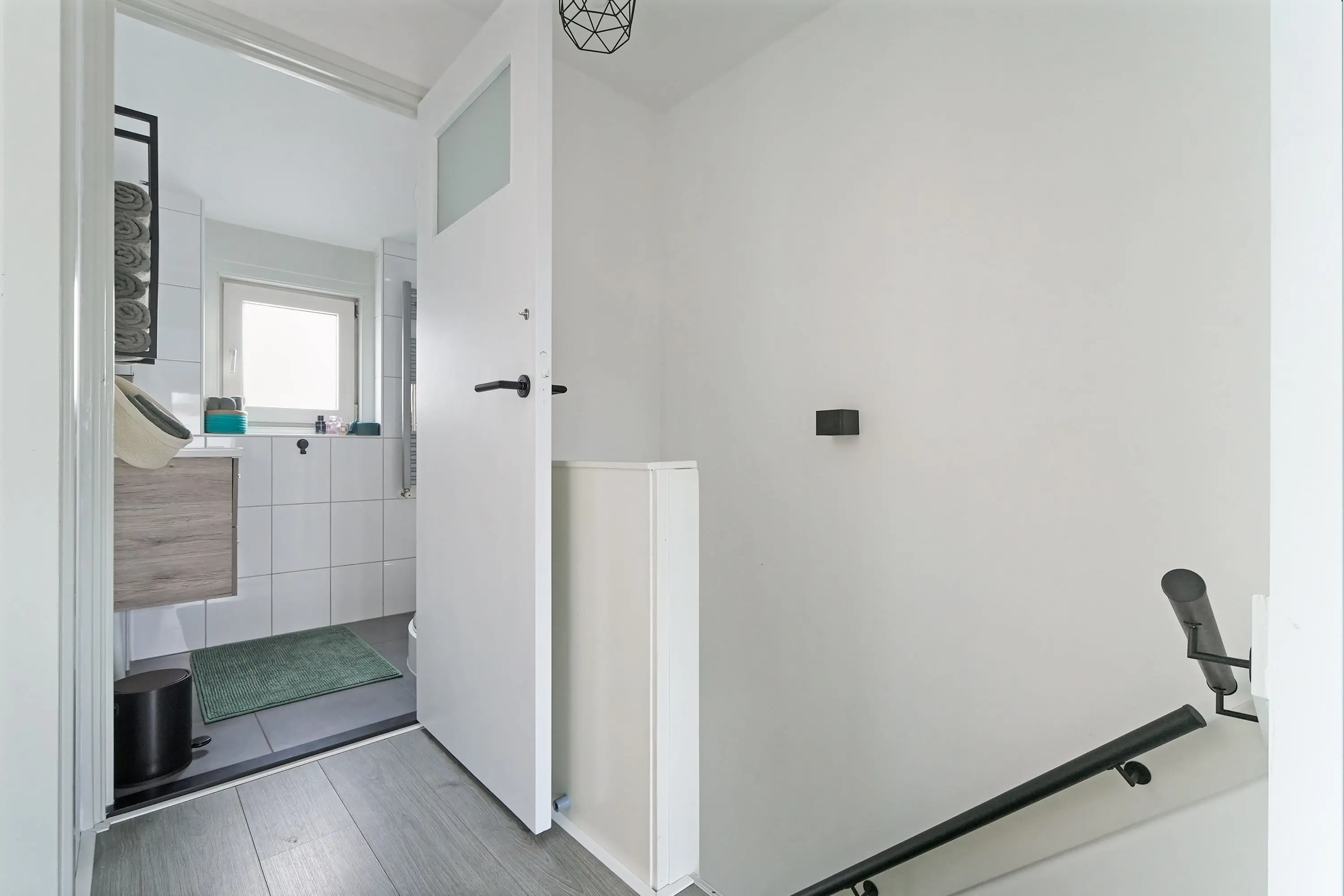 De overloop biedt toegang tot twee ruime kamers waarvan één aan voorzijde en de tweede aan achterzijde. De kleinste derde slaapkamer is in gebruik als waskamer. De badkamer is eveneens te bereiken via de overloop en is voorzien van een nette douche en wastafelmeubel.