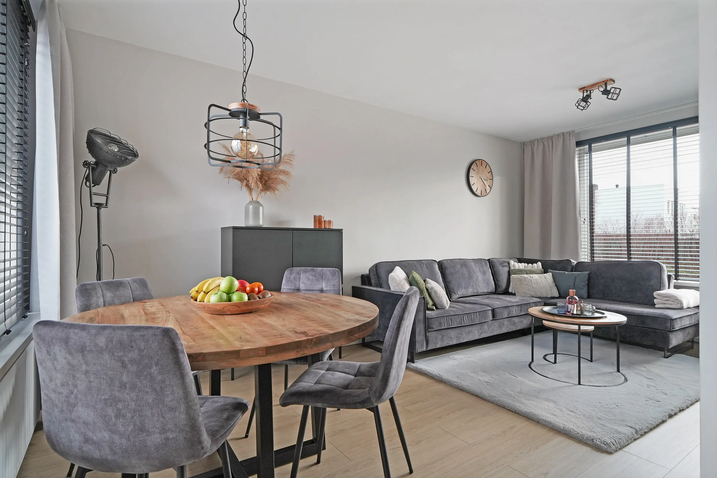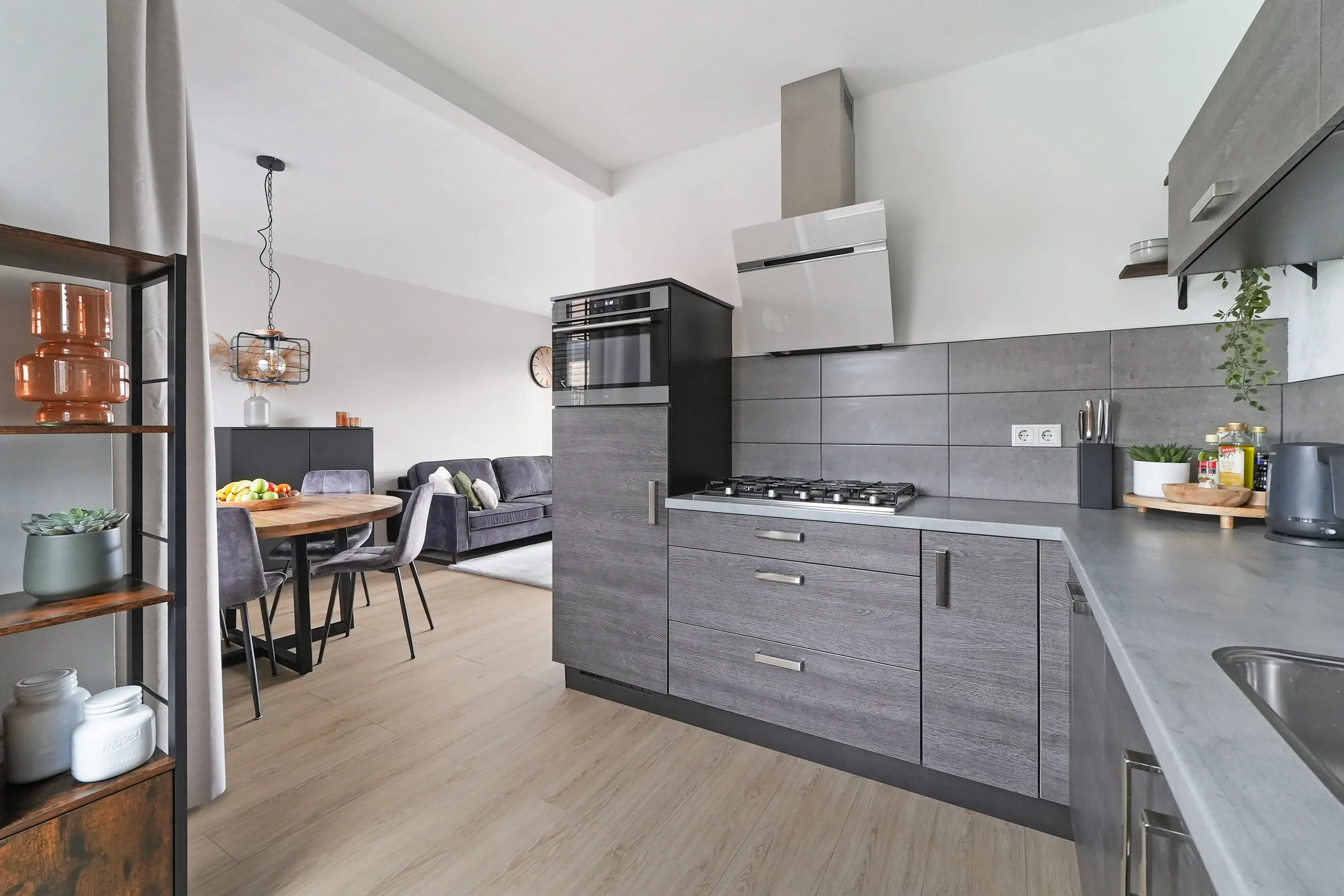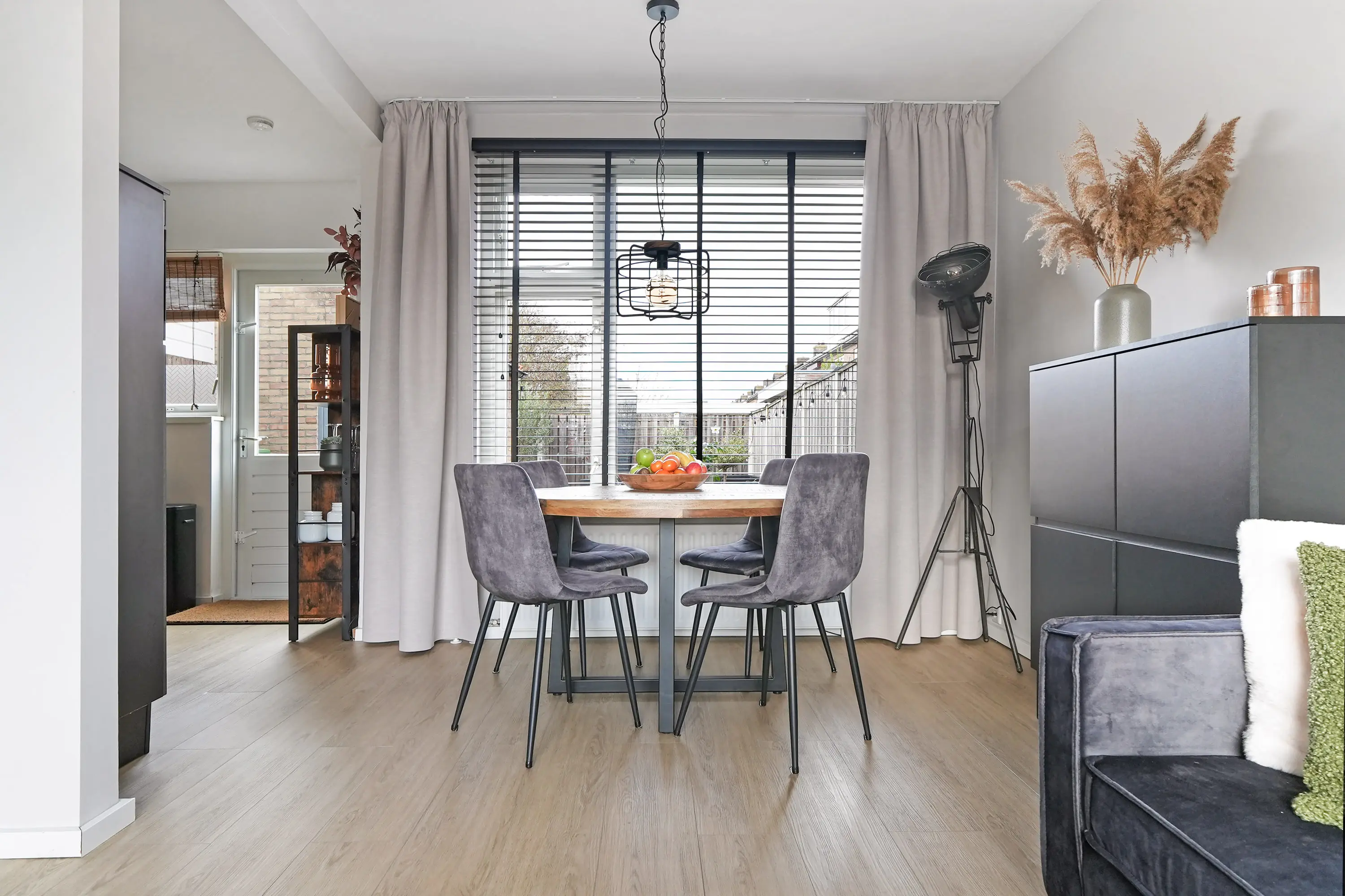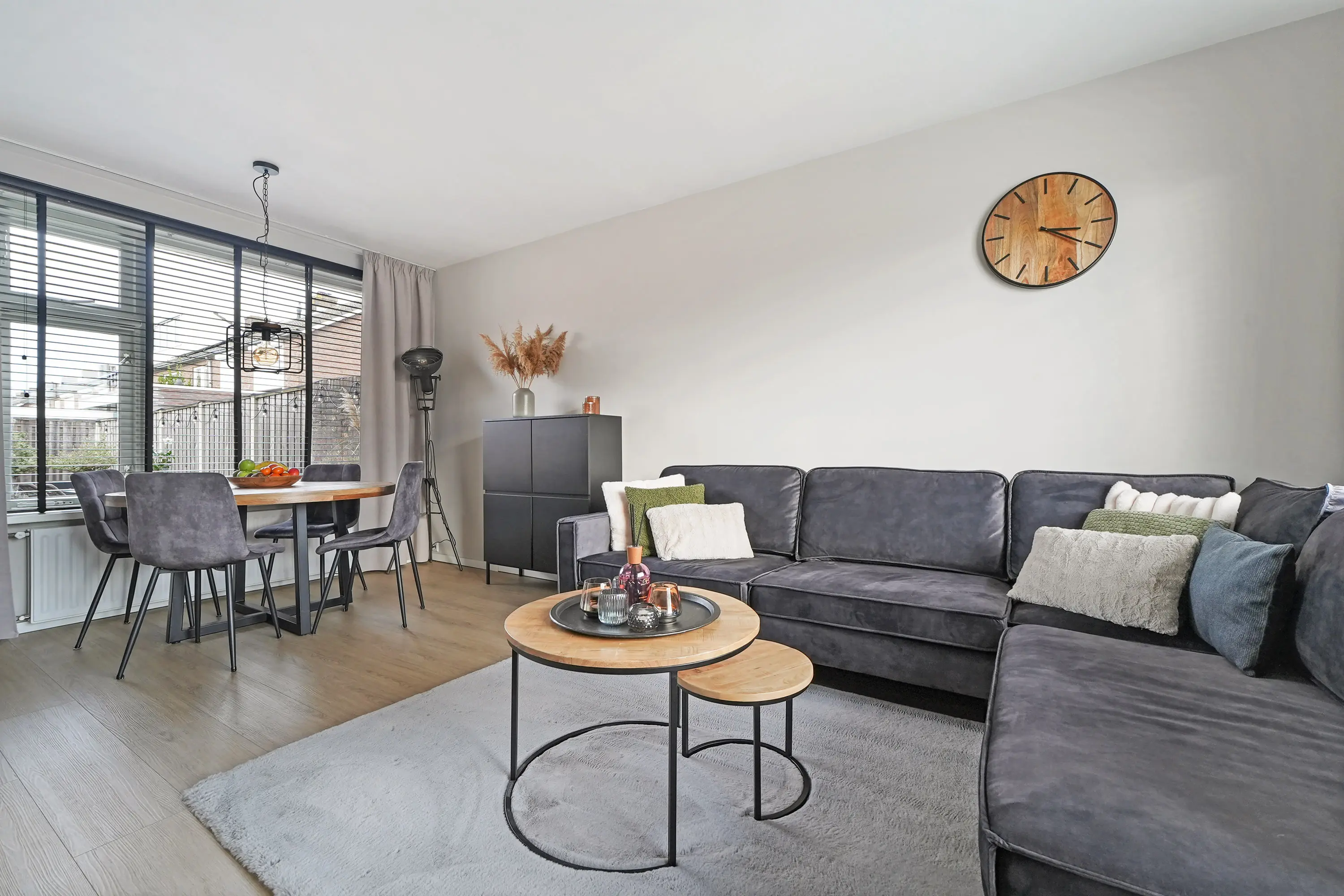 Entree in hal met (vernieuwde) meterkast, toilet, trapkast, trap opgang naar de 1e verdieping en doorgang naar de woonkamer. Bij binnenkomst ervaart u direct de nette afwerking. De zithoek treft u aan de straatzijde en de eethoek met de open keuken aan de tuinzijde. Deze leefruimte beschikt door de grote raampartijen aan de voor- en achterzijde over een prettige lichtinval. De open keuken is enkele jaren geleden vernieuwd met donkere kastfronten, betonlook aanrechtblad én uiteraard voorzien van de gewenste inbouwapparatuur. Vanuit de keuken bereikt u de tuin.