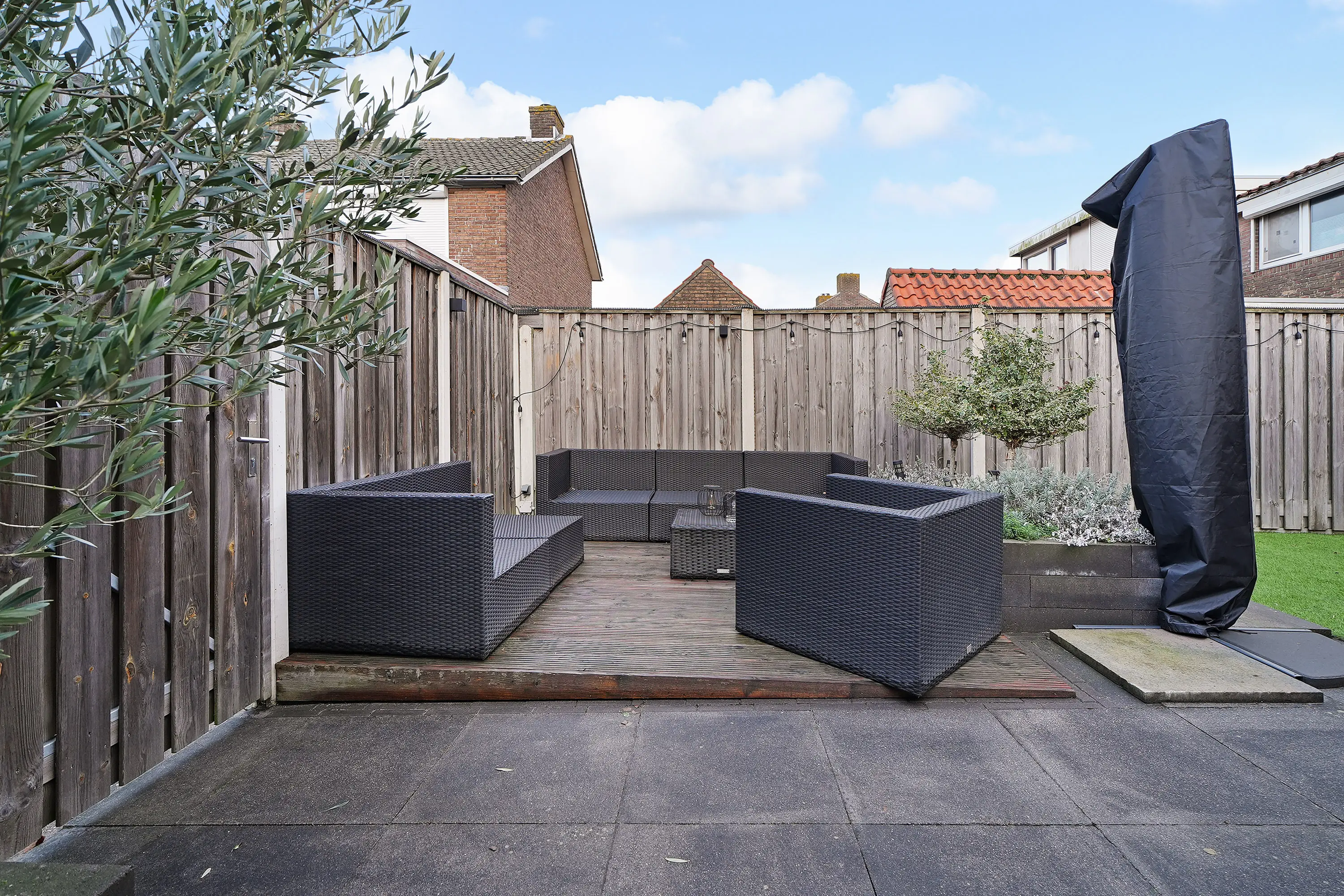 De tuin biedt door de ligging en diepte een veel zonuren en privacy. Keurig aangelegd met sierbestrating en achter in de tuin een ruim terras op de vlonderdelen. Verder beschikt de tuin over een ruime stenen berging en vrije achterom.