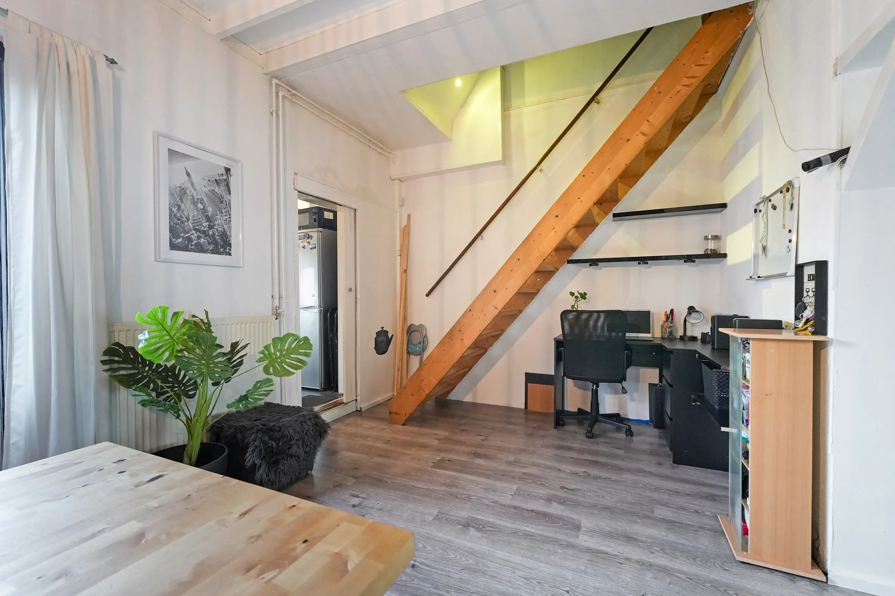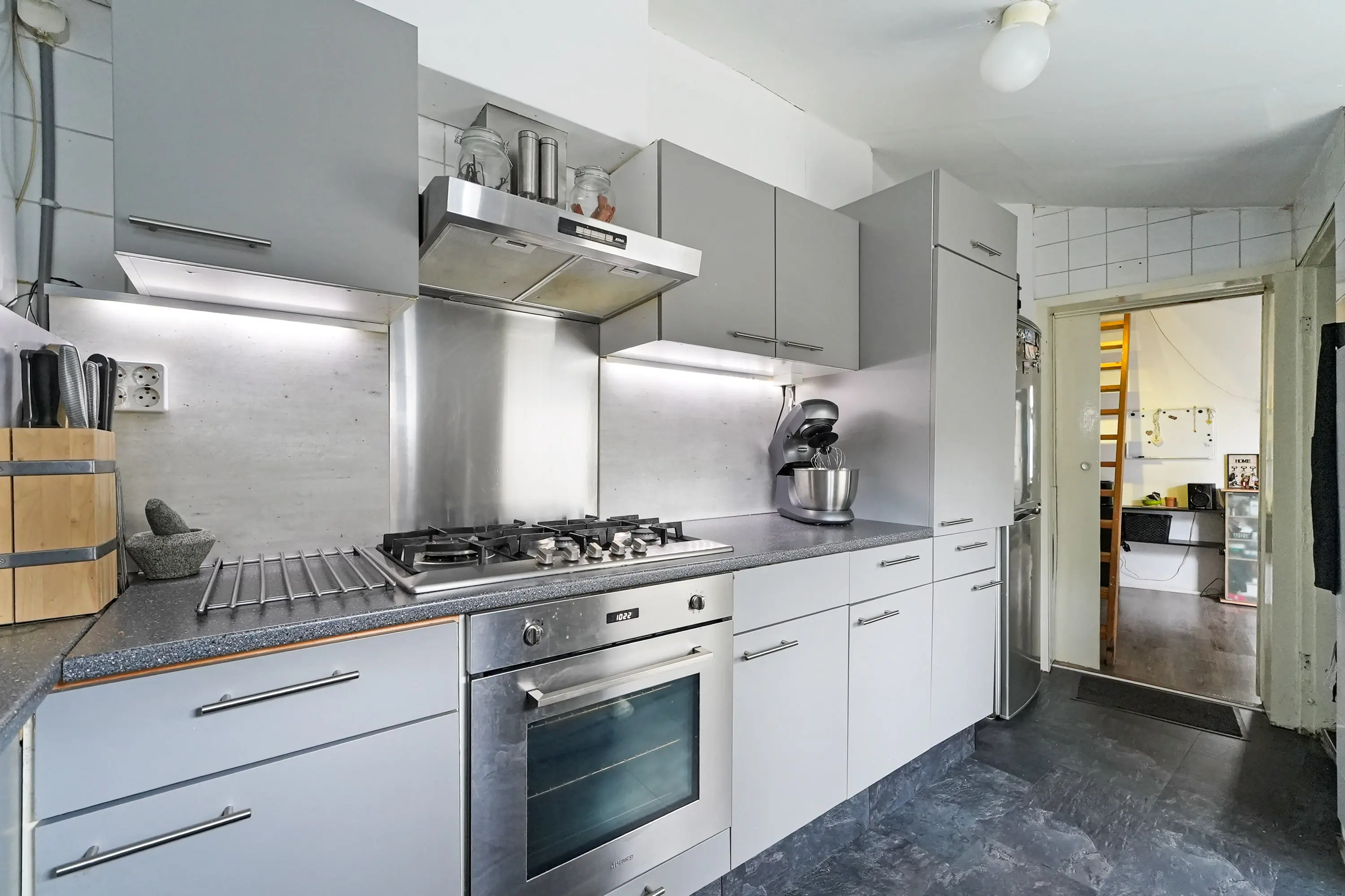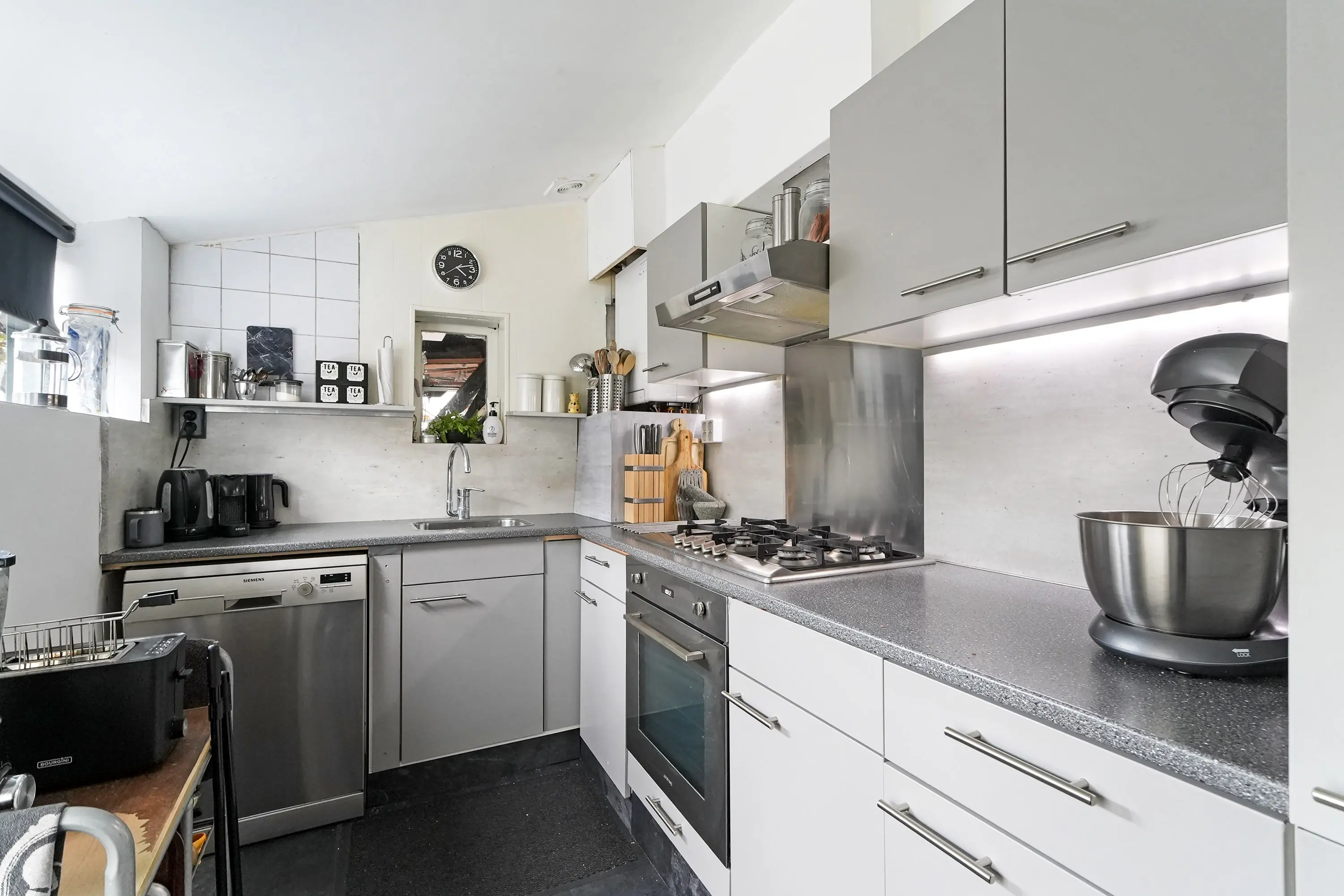 De keuken is gesitueerd in de uitbouw waar u een lichte hoekopstelling treft. Hier bevindt zich ook de cv-ketel. Vanuit zowel de keuken als via de openslaande deuren in de woonkamer heeft u directe toegang tot de tuin. Onder de open trap vindt u een praktische hoek, momenteel ingericht als thuiswerkplek. De trap brengt u naar de eerste verdieping.