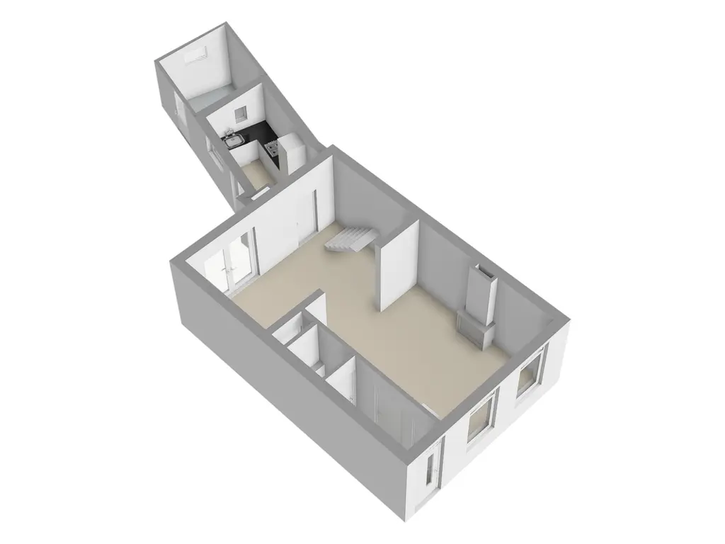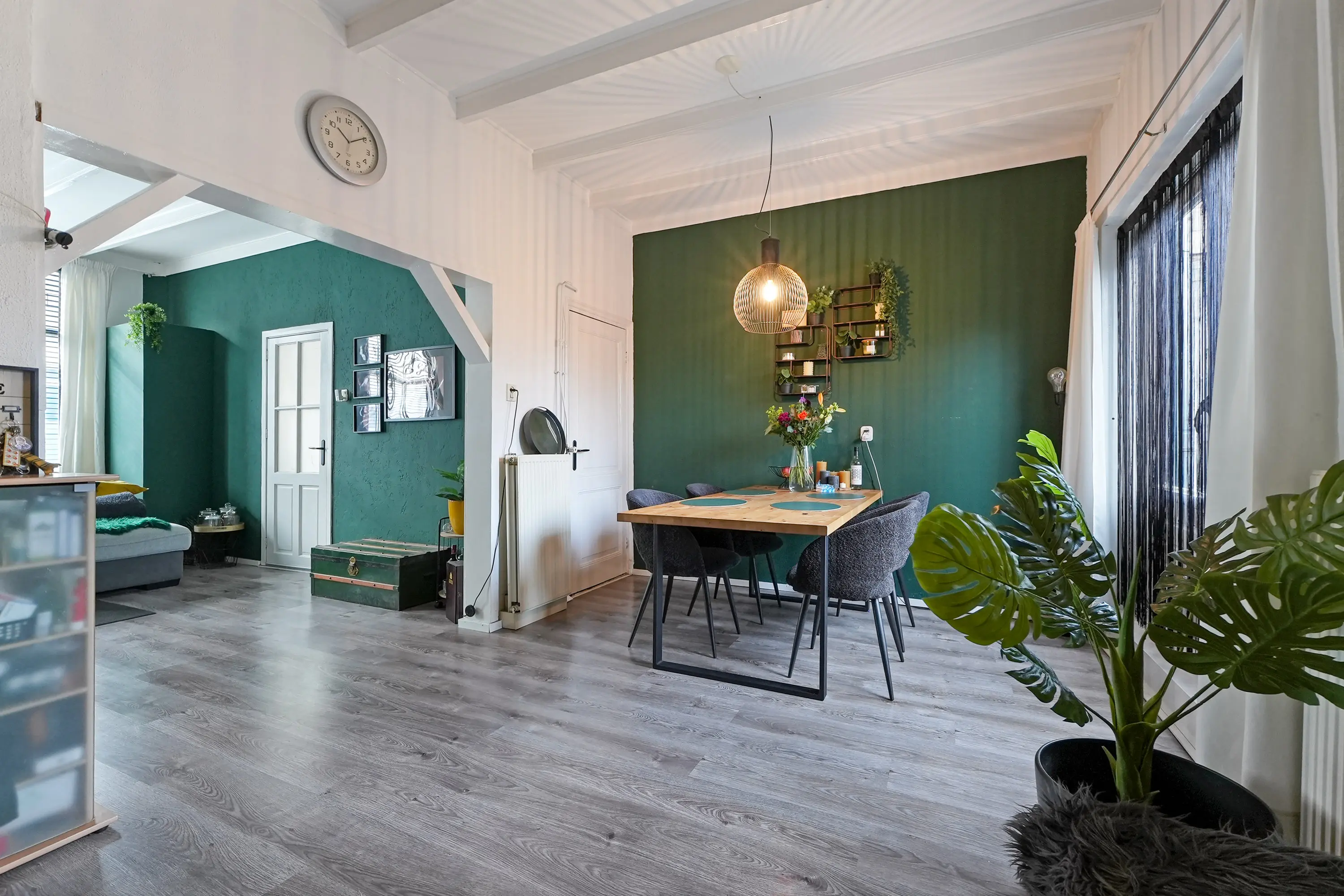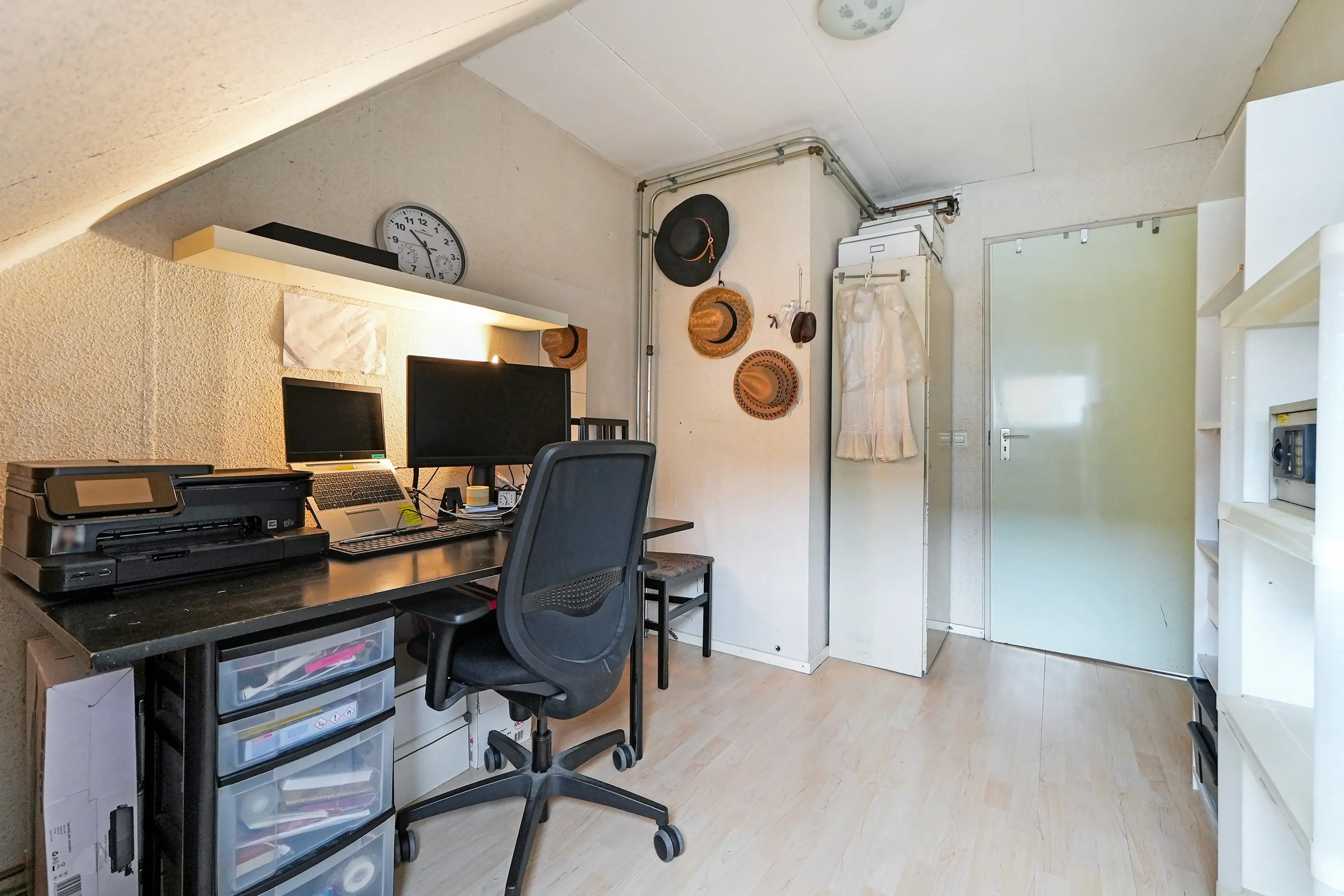 De keuken is gesitueerd in de uitbouw waar u een lichte hoekopstelling treft. Hier bevindt zich ook de cv-ketel. Vanuit zowel de keuken als via de openslaande deuren in de woonkamer heeft u directe toegang tot de tuin. Onder de open trap vindt u een praktische hoek, momenteel ingericht als thuiswerkplek. De trap brengt u naar de eerste verdieping.