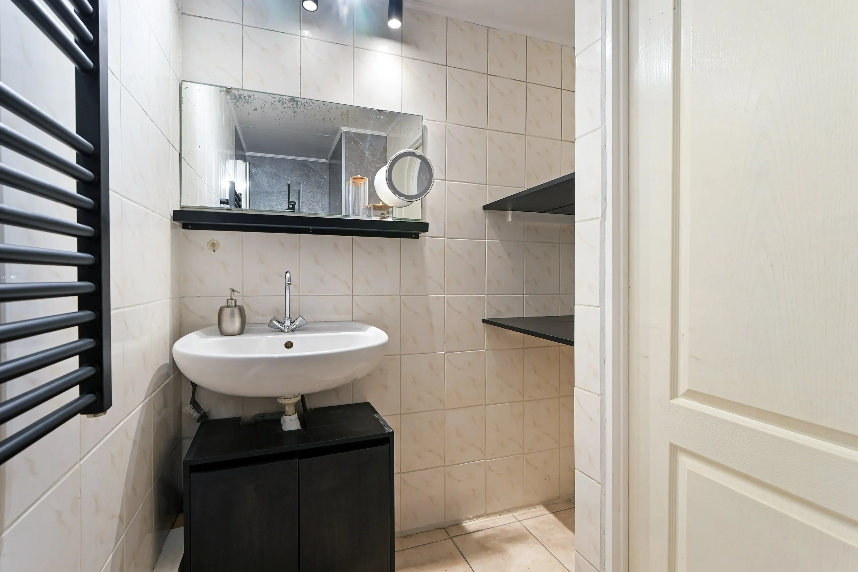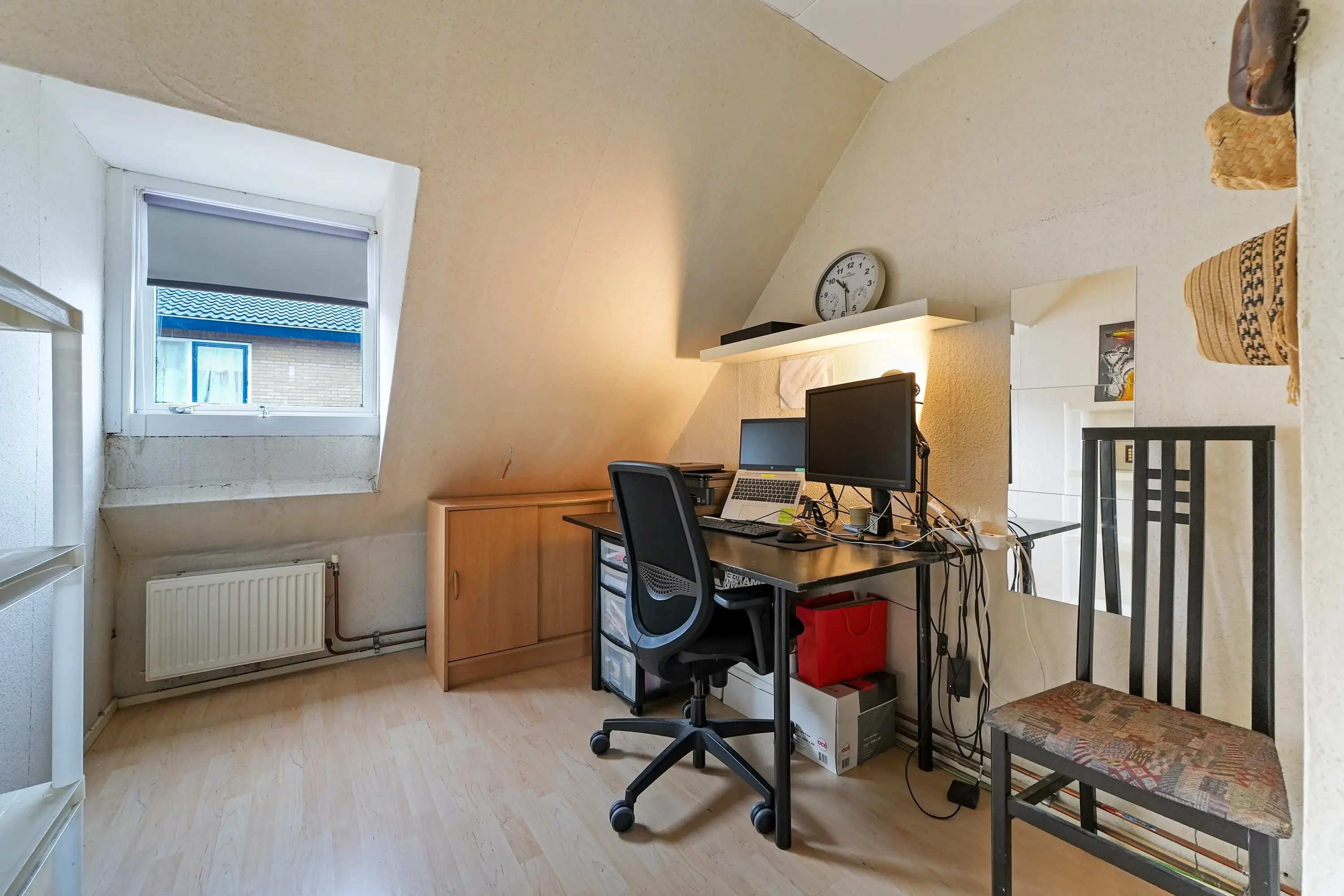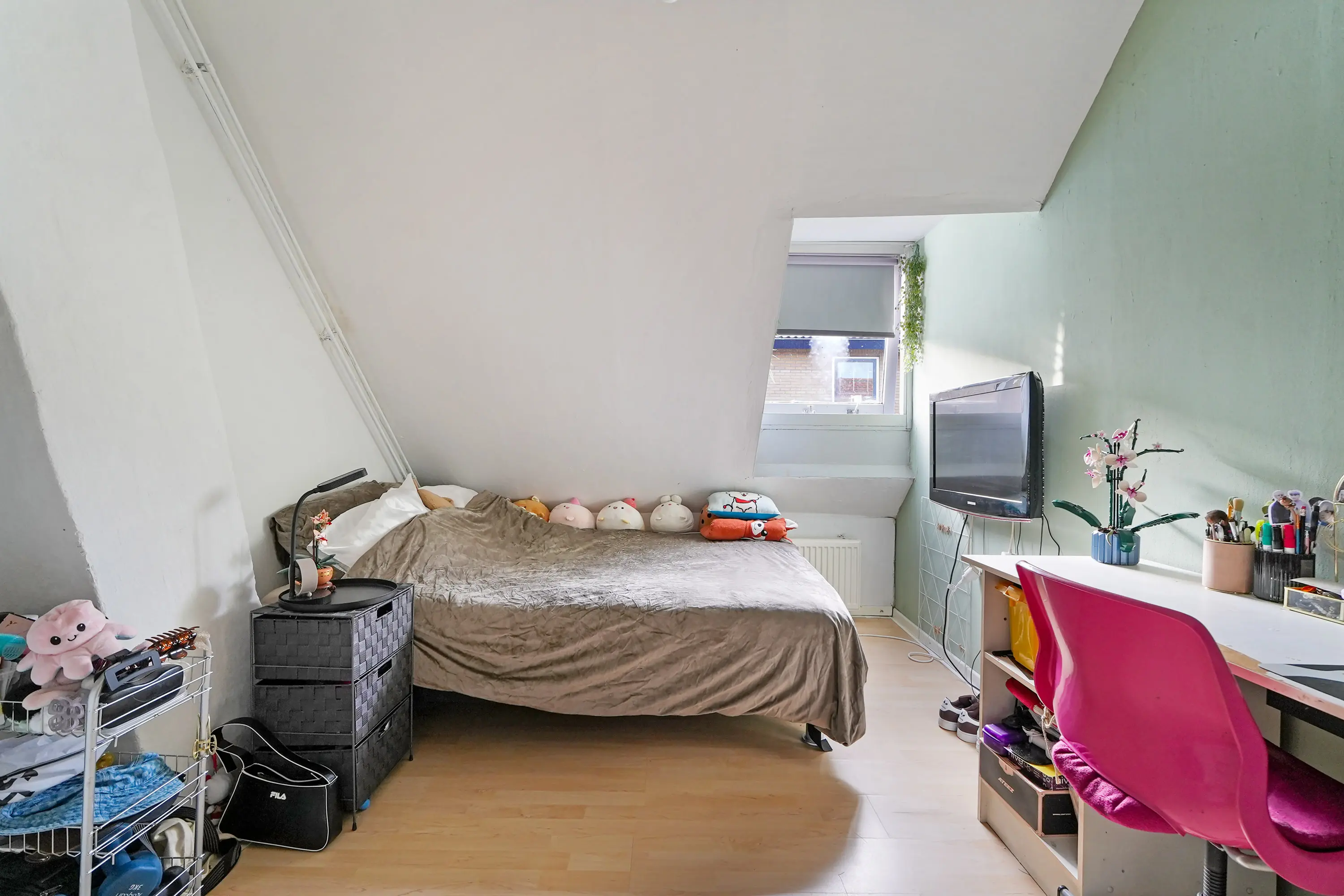 De overloop verleent toegang tot drie ruime slaapkamers, waaronder de royale ouderslaapkamer aan de tuinzijde. Dankzij de dakopbouw geniet u hier van een bijzonder aangename ruimtebeleving. De twee slaapkamers aan de voorzijde profiteren beide van de dakkapel. De verzorgde badkamer, eveneens bereikbaar via de overloop, is ingericht met een douche, wastafel met meubel en een opberghoek met legplanken.