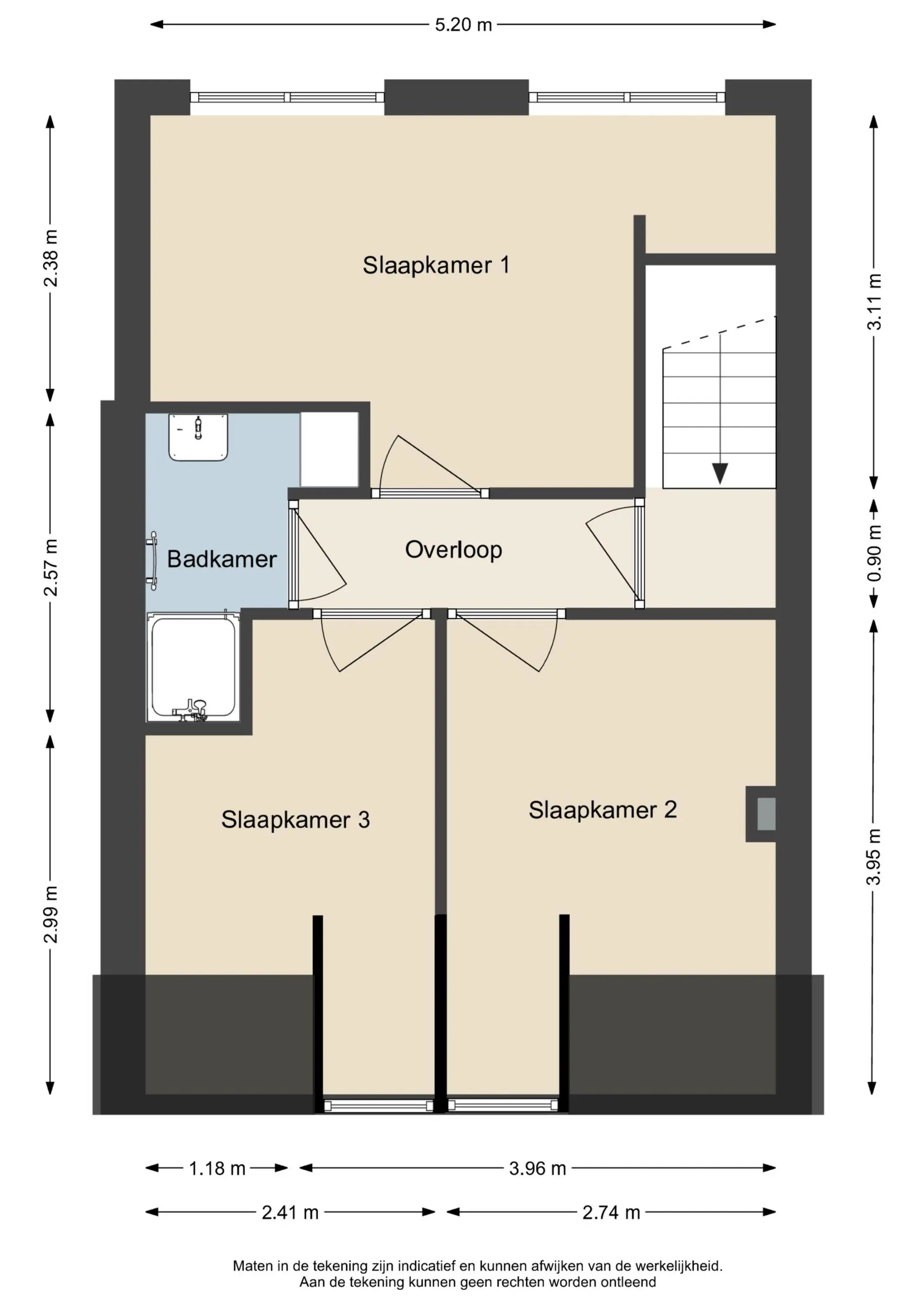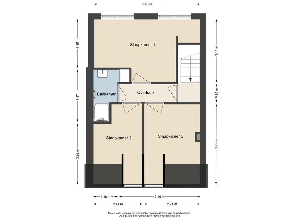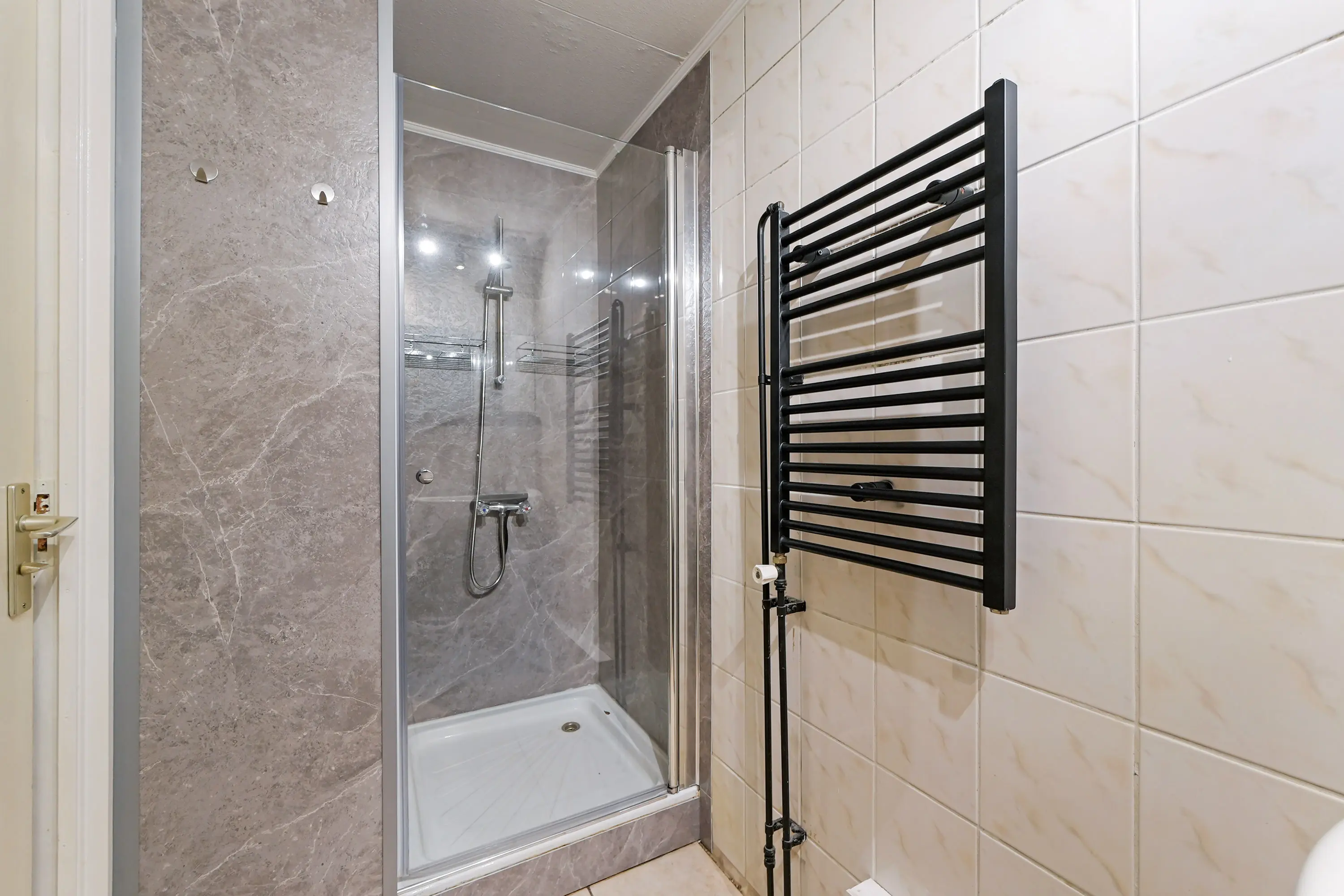 De overloop verleent toegang tot drie ruime slaapkamers, waaronder de royale ouderslaapkamer aan de tuinzijde. Dankzij de dakopbouw geniet u hier van een bijzonder aangename ruimtebeleving. De twee slaapkamers aan de voorzijde profiteren beide van de dakkapel. De verzorgde badkamer, eveneens bereikbaar via de overloop, is ingericht met een douche, wastafel met meubel en een opberghoek met legplanken.