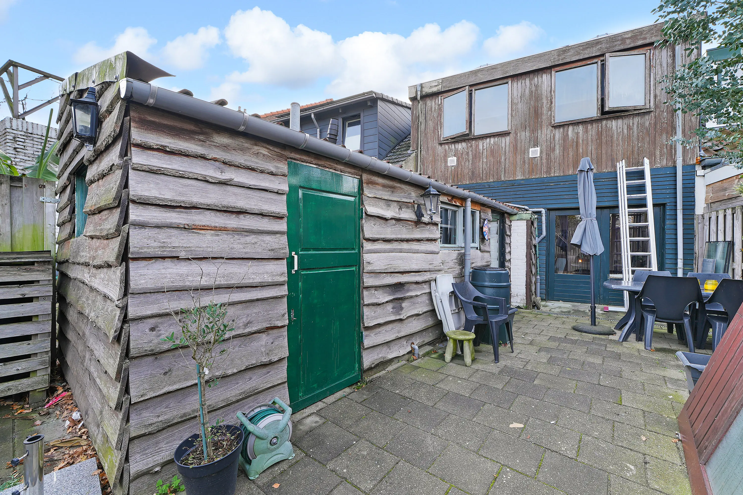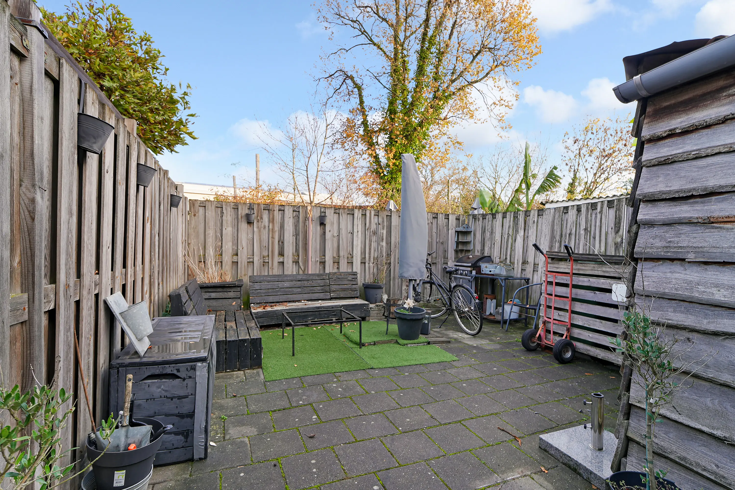 De besloten tuin is onderhoudsvriendelijk aangelegd met sierbestrating en biedt veel privacy. Direct achter de aangebouwde keuken bevindt zich de berging.