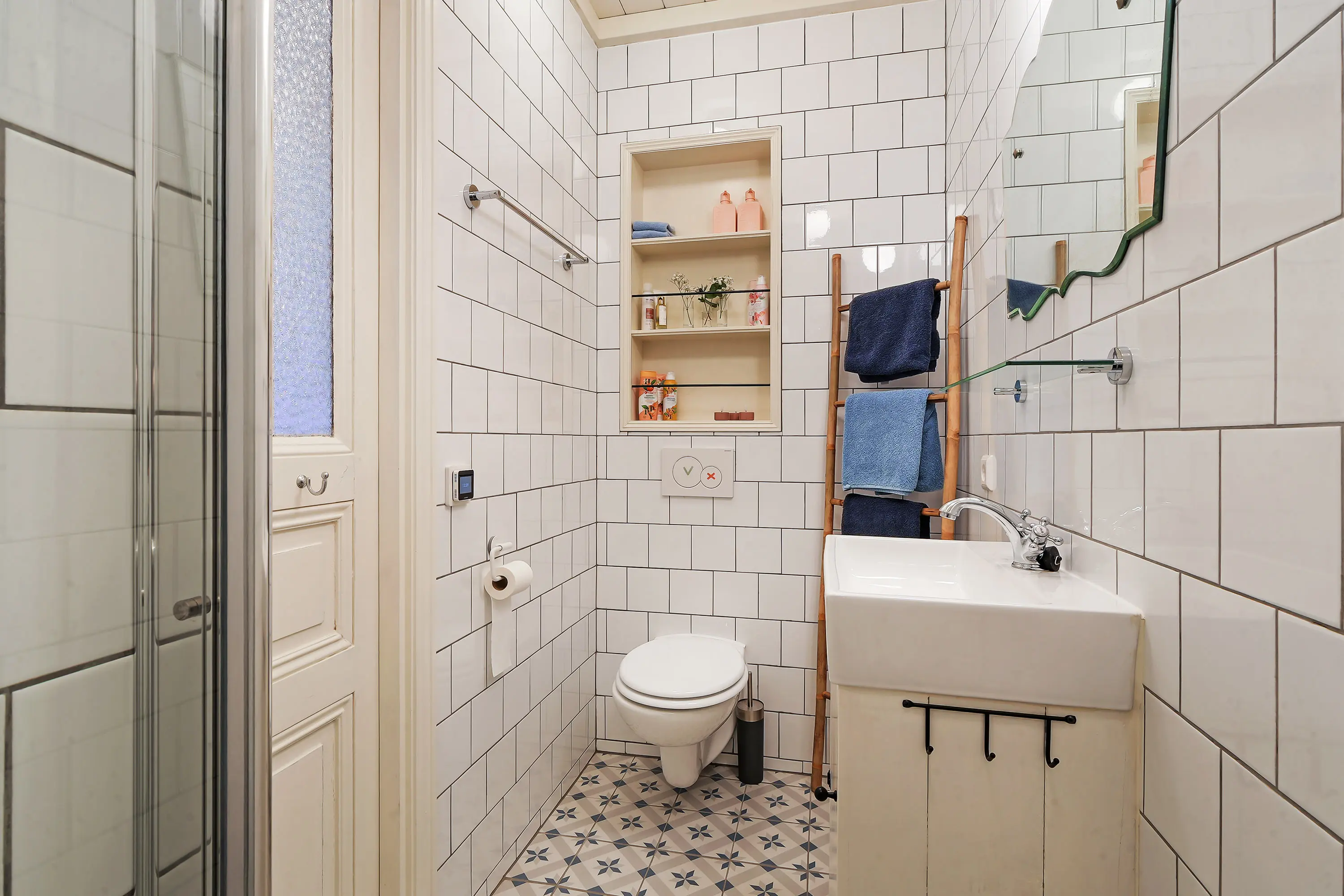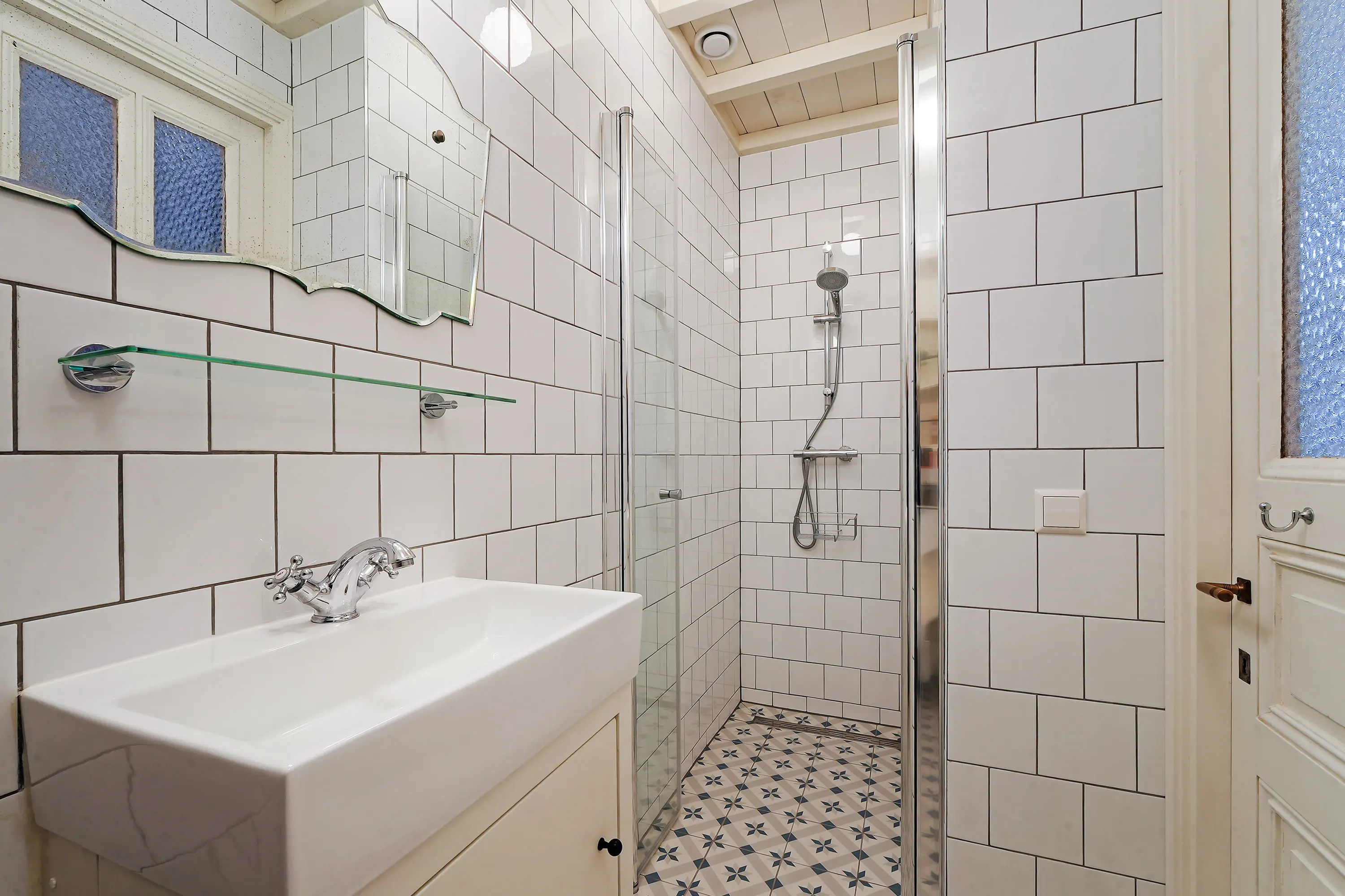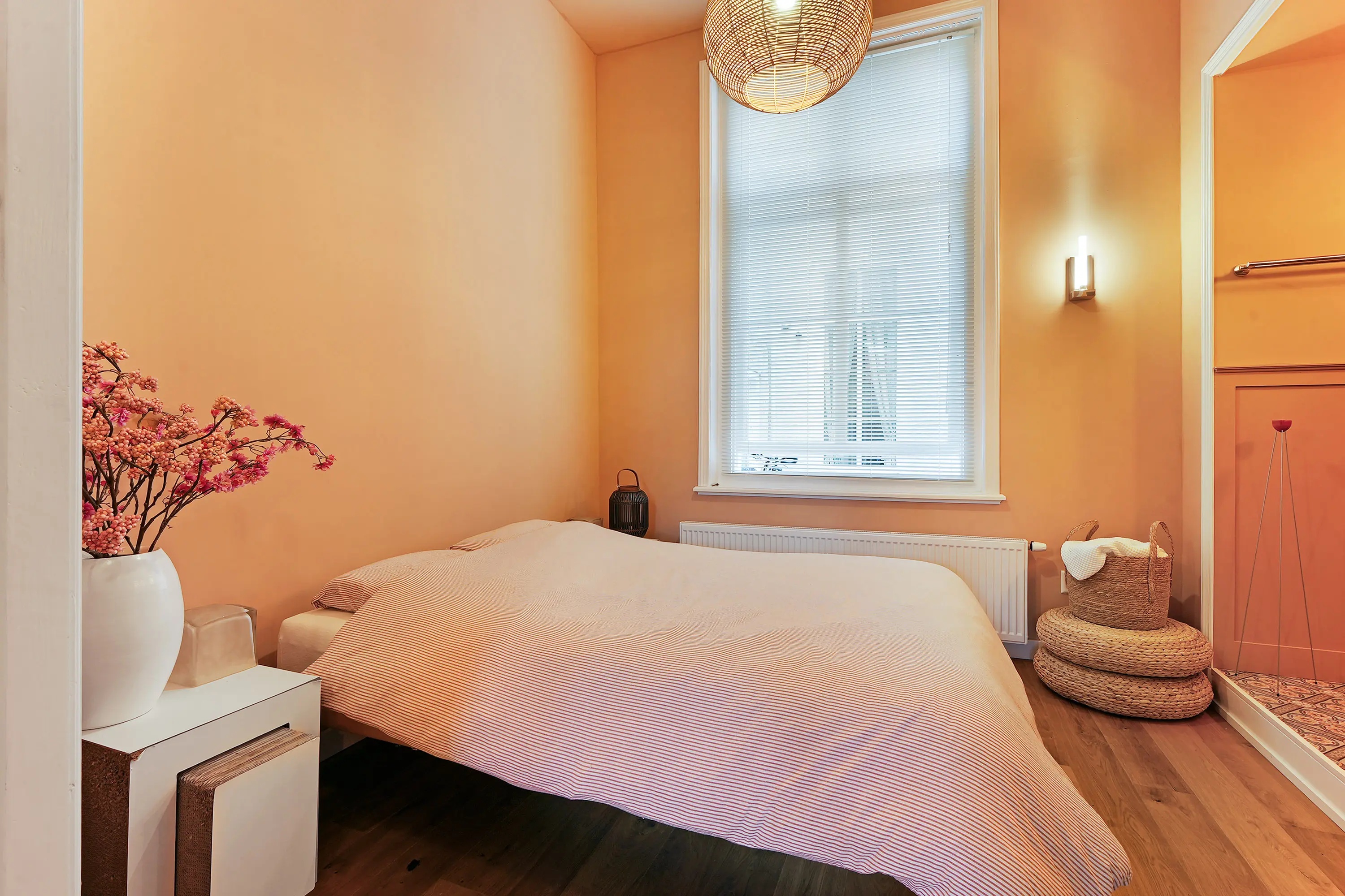 Via fraaie openslaande deuren bereikt u de comfortabele slaapkamer. Ook hier zorgen grote ramen voor een prettige lichtinval en uitzicht op de binnenplaats. Aansluitend bevindt zich de nette badkamer met douche, wastafel en toilet.