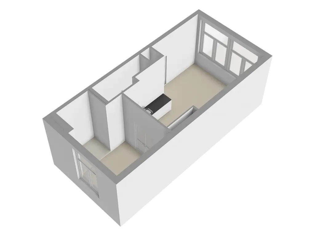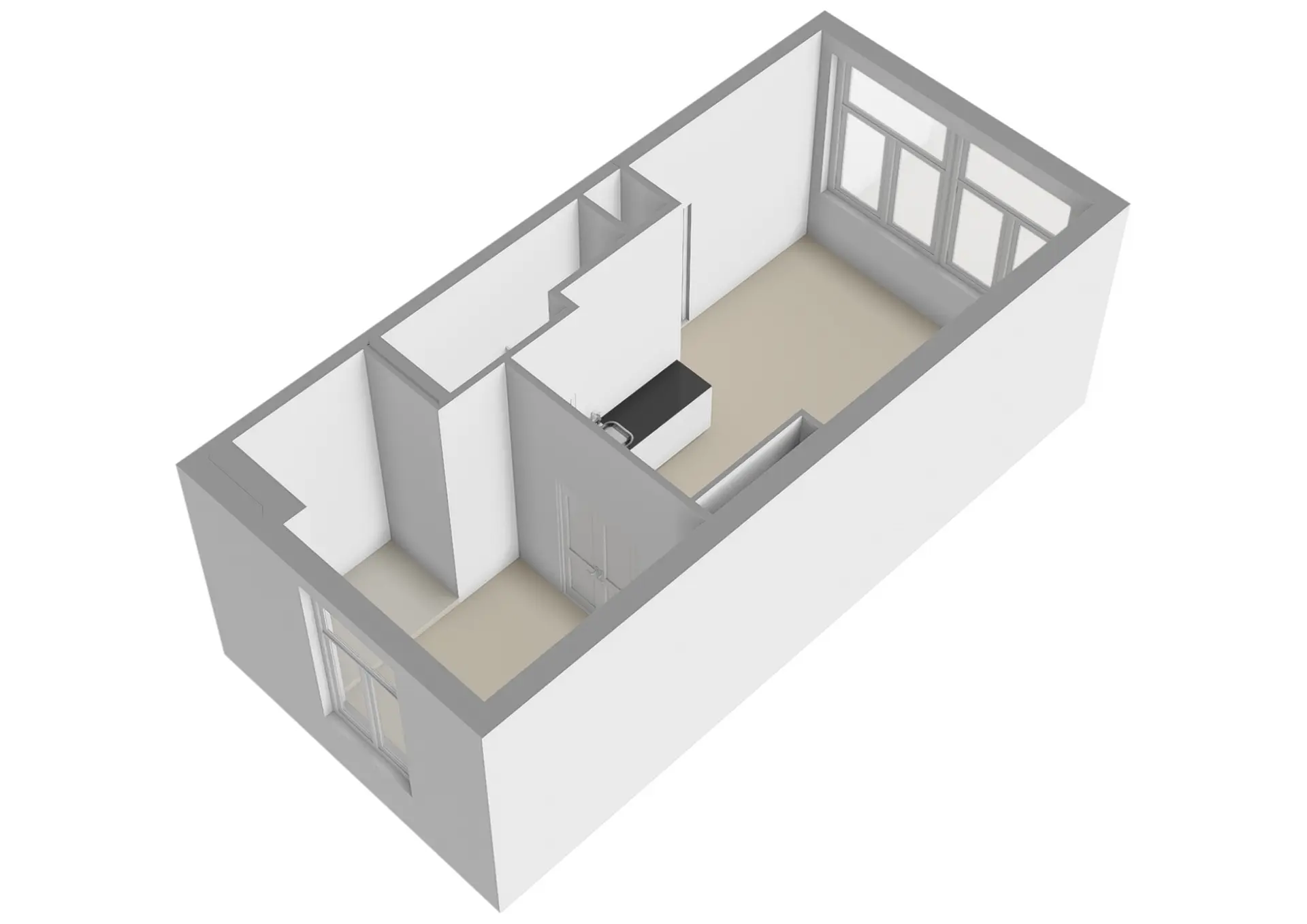 Bij binnenkomst komt u in de aangename leefruimte, waar een vaste kast aanwezig is. Dankzij de royale ramen geniet u hier van veel lichtinval en zicht op de tuin. De open keuken is praktisch ingericht en uitgerust met onder andere een kookvoorziening, koelkast en magnetron.