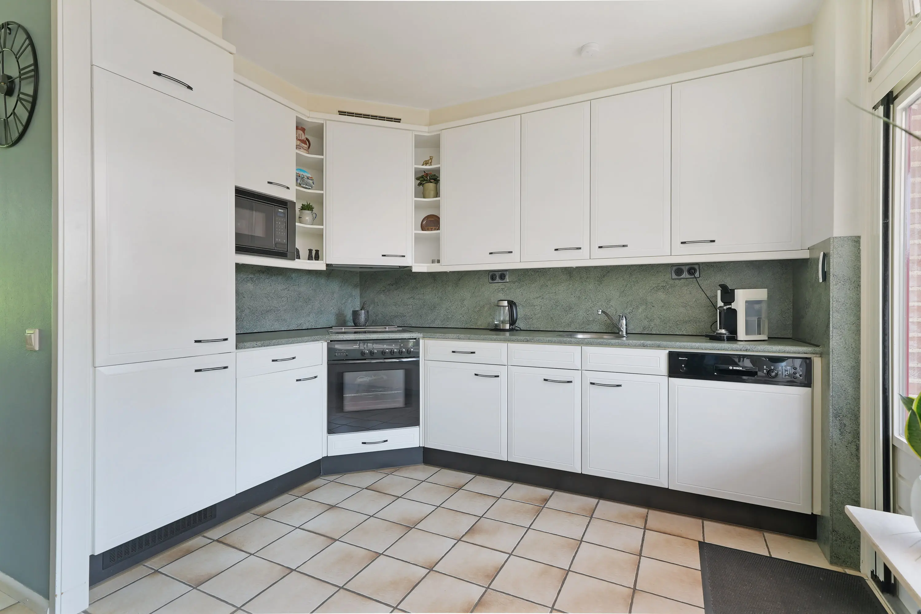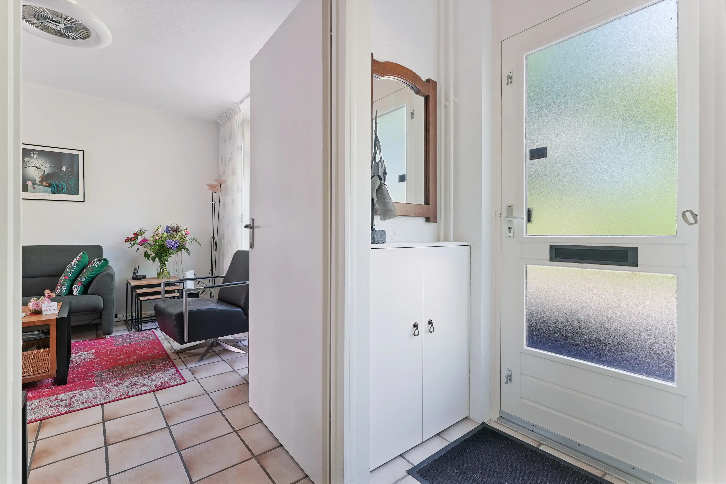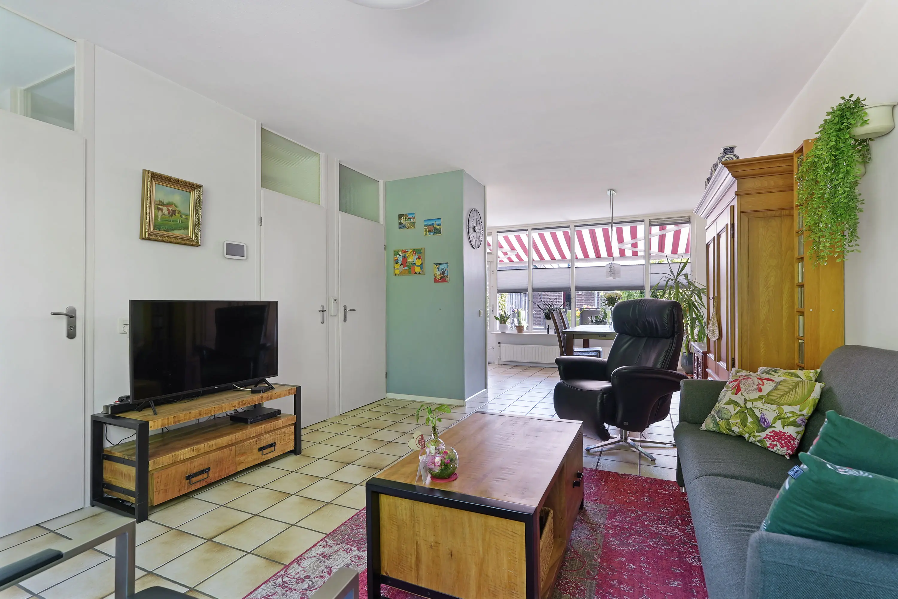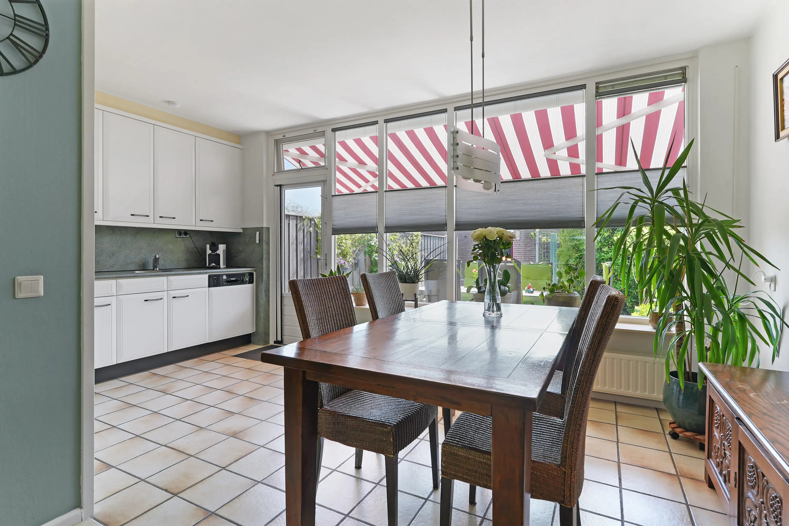 Via de hal met meterkast en toilet bereikt u de lichte woonkamer. Dankzij het grote raam aan de tuinzijde valt hier veel daglicht binnen. De woonkamer staat in open verbinding met de ruime hoekkeuken, voorzien van het benodigd inbouwapparatuur. De keuken biedt uitzicht op de tuin en heeft een deur naar het terras, waardoor binnen en buiten mooi in elkaar overlopen. Onder de trap bevindt zich een praktische bergkast.