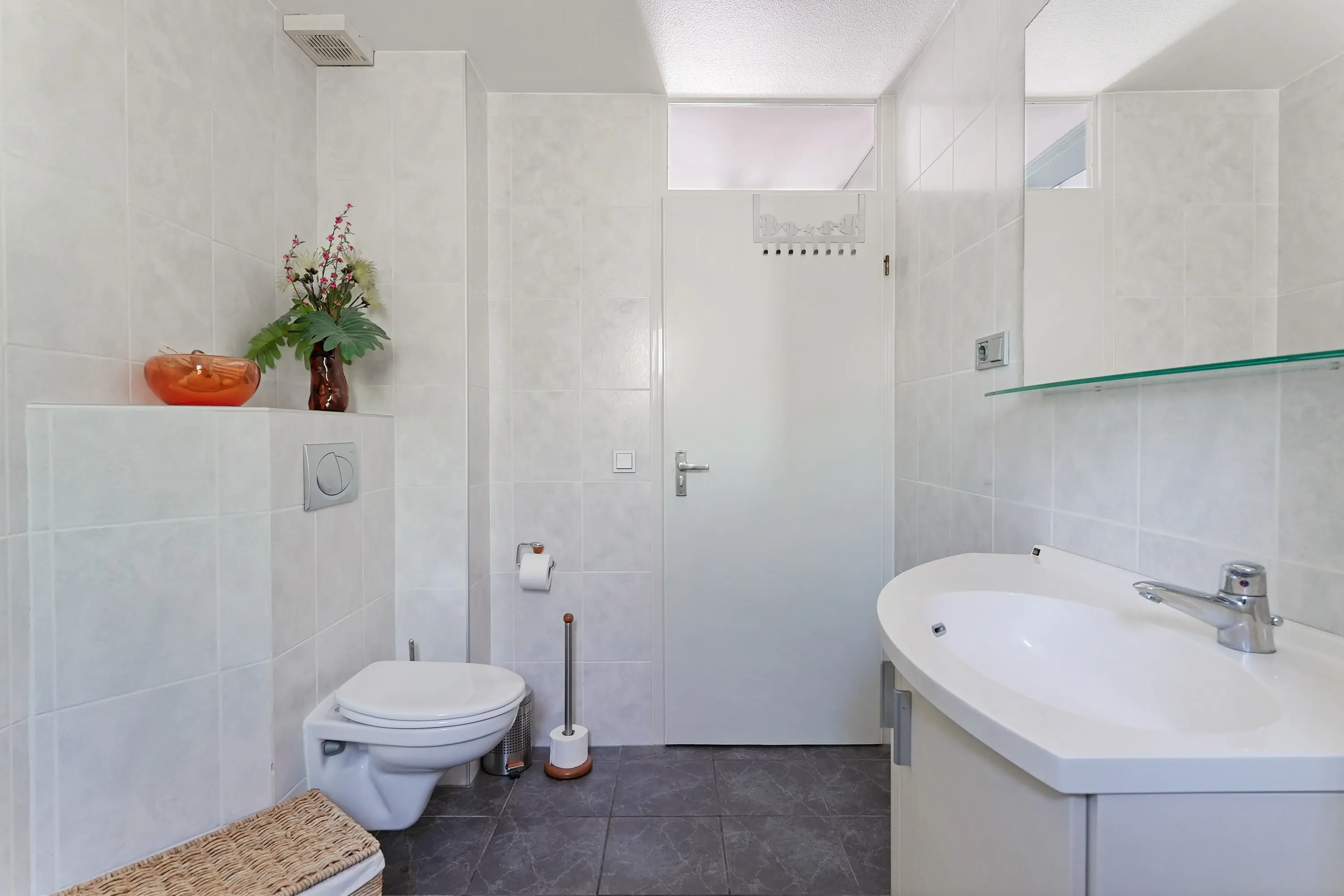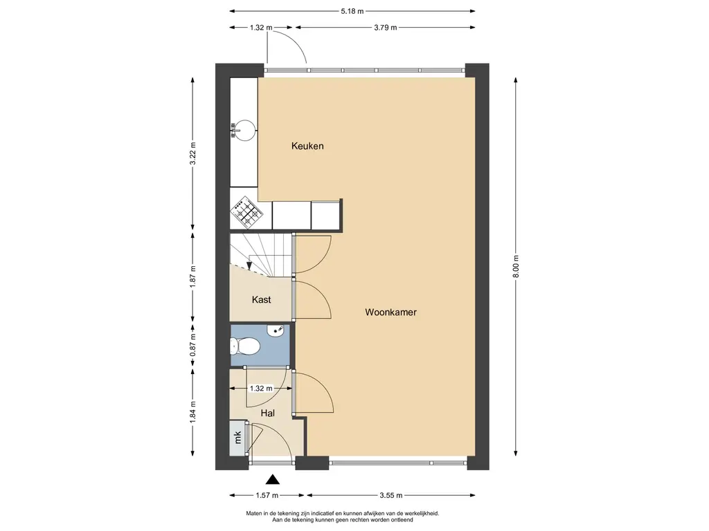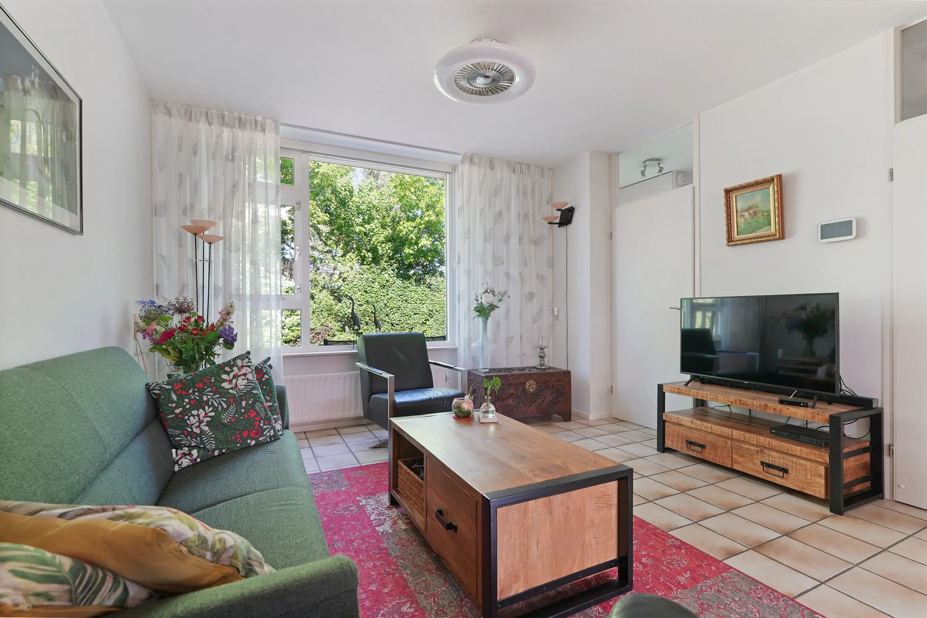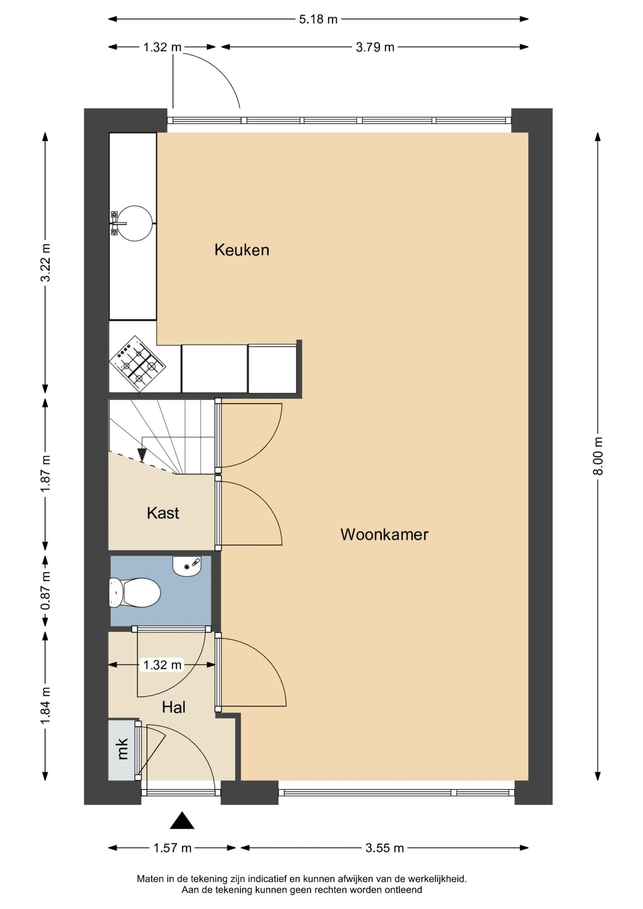 Via de hal met meterkast en toilet bereikt u de lichte woonkamer. Dankzij het grote raam aan de tuinzijde valt hier veel daglicht binnen. De woonkamer staat in open verbinding met de ruime hoekkeuken, voorzien van het benodigd inbouwapparatuur. De keuken biedt uitzicht op de tuin en heeft een deur naar het terras, waardoor binnen en buiten mooi in elkaar overlopen. Onder de trap bevindt zich een praktische bergkast.