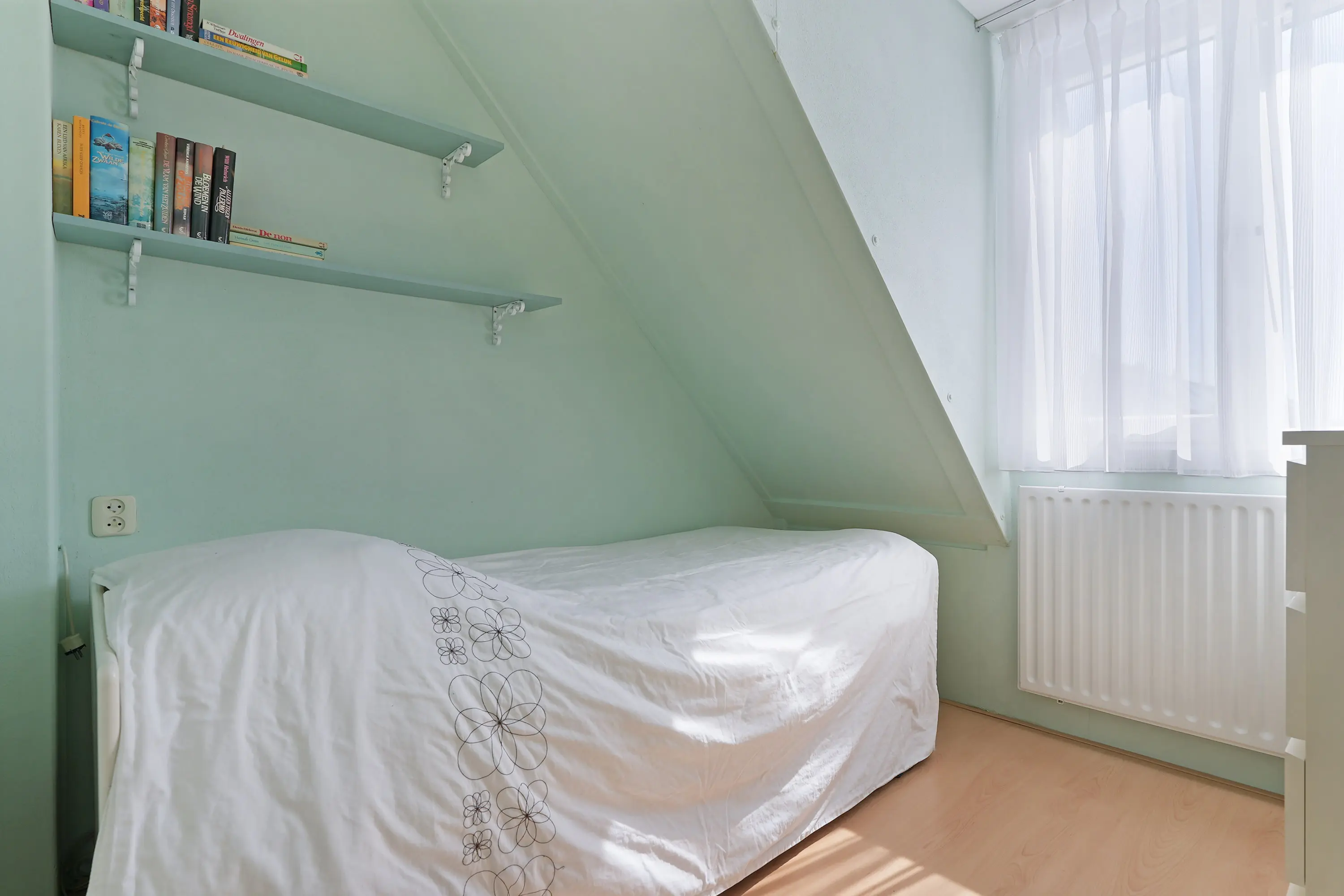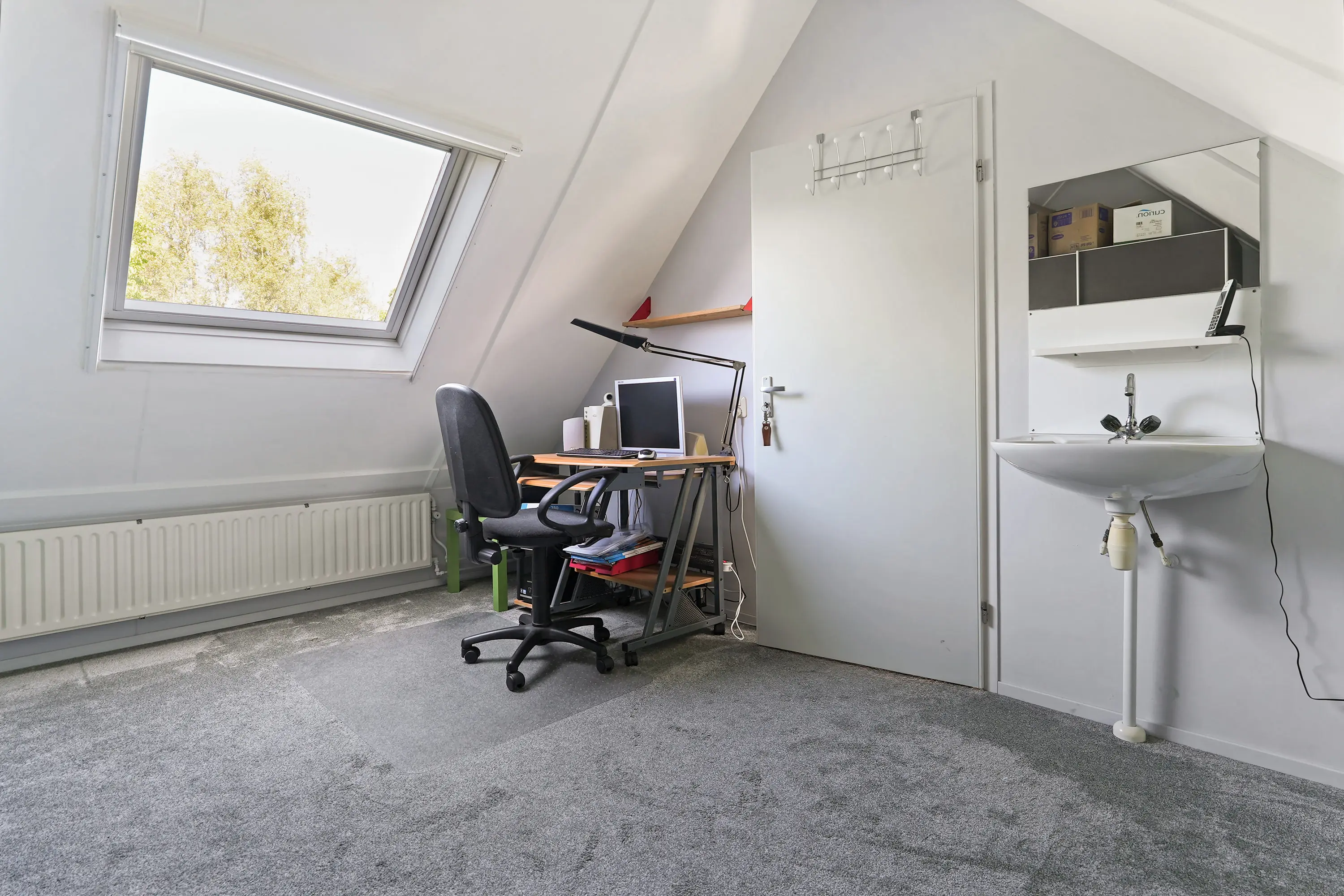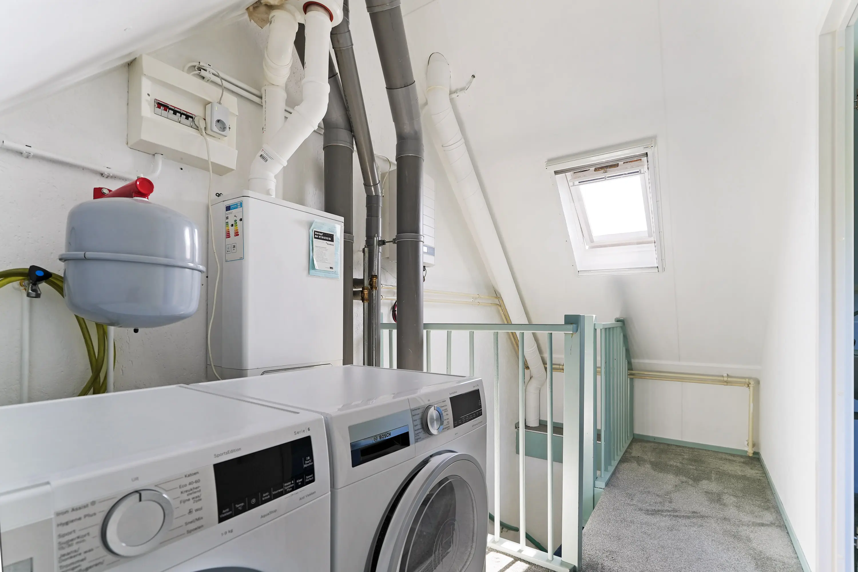 Via een vaste trap bereikt u de vierde slaapkamer. Deze royale zolderkamer beschikt over een groot dakraam en biedt veel ruimte voor slapen, werken of hobby. Op de overloop bevindt zich de wasmachine- en drogeraansluiting.