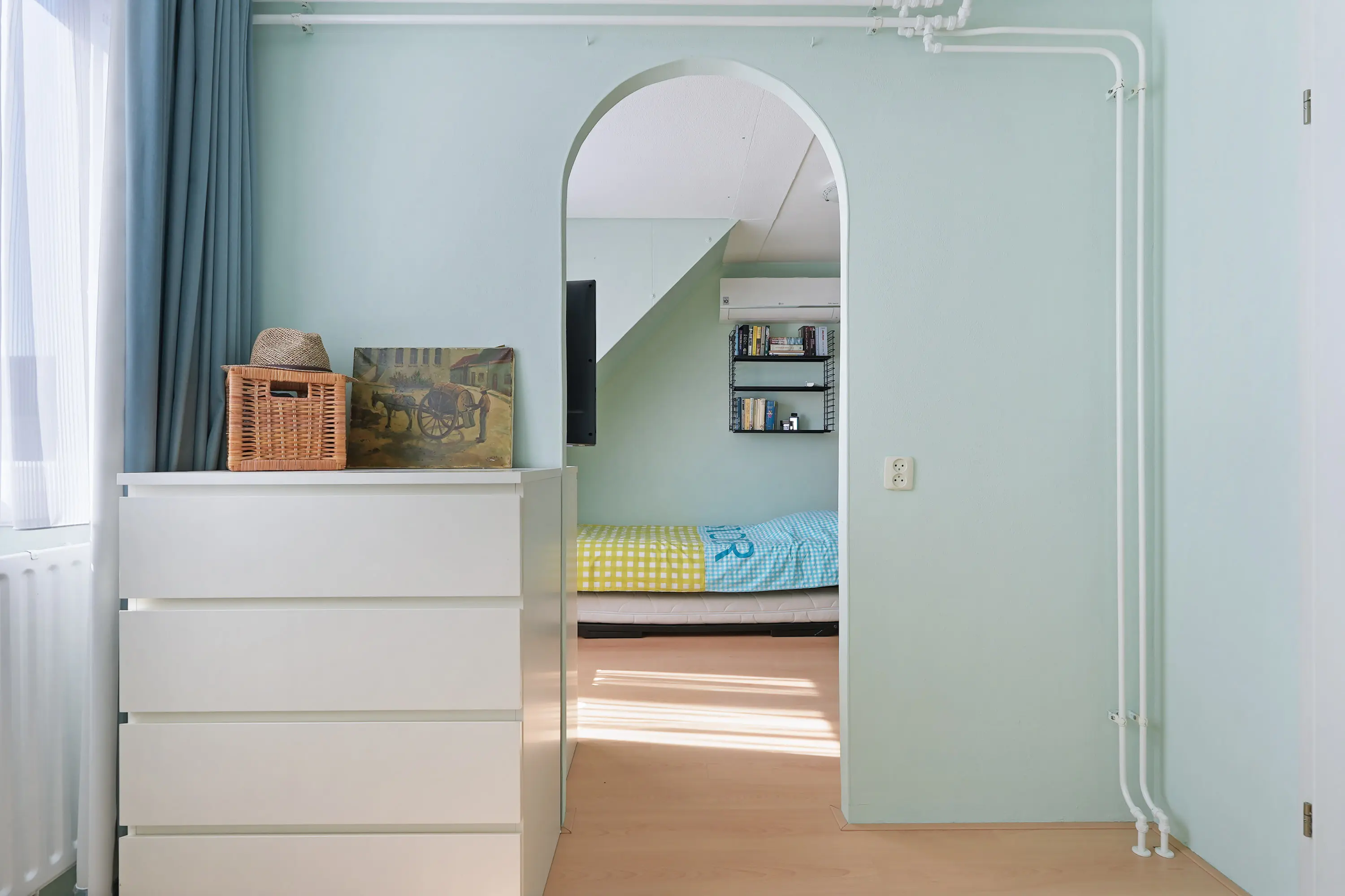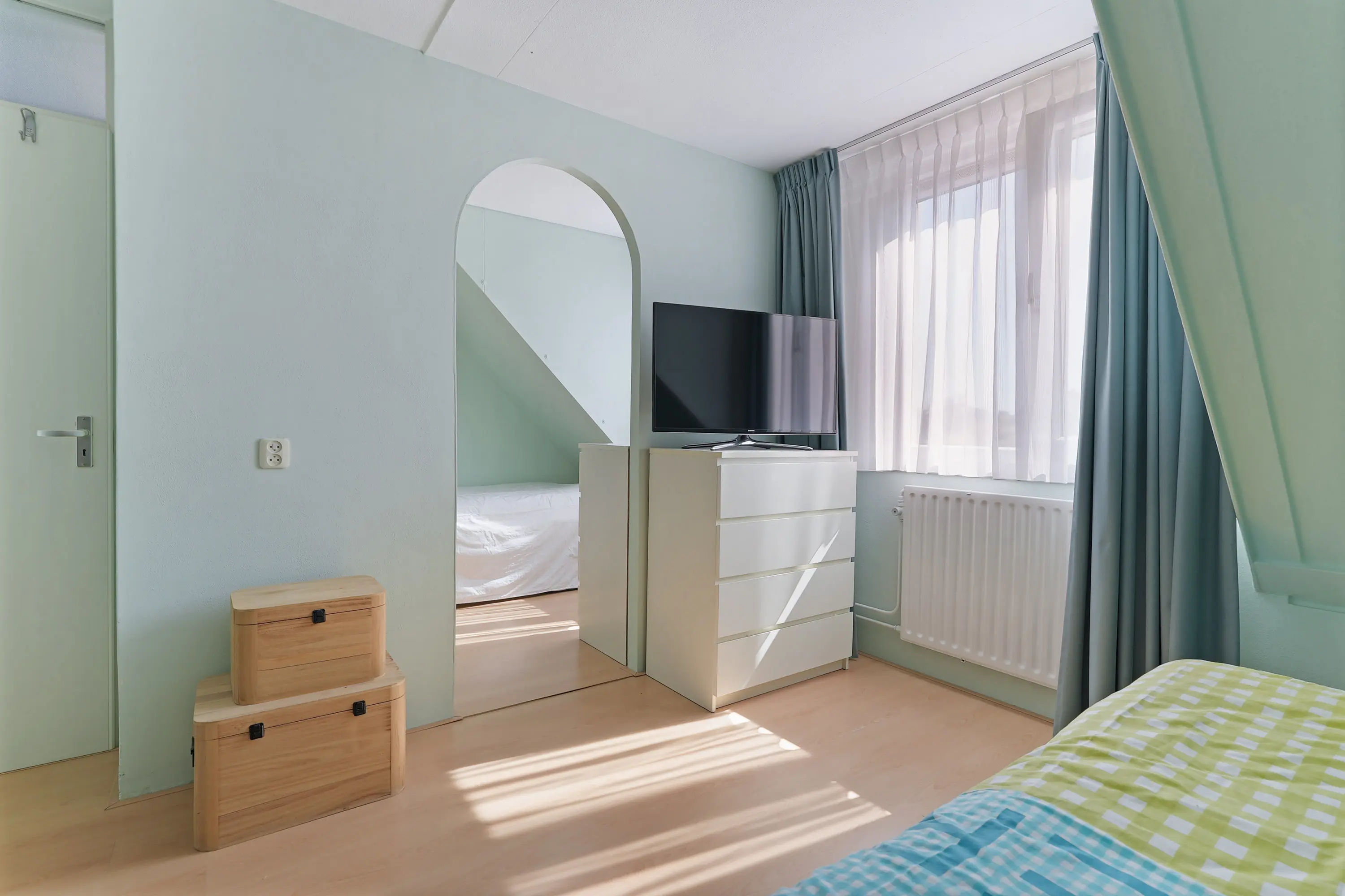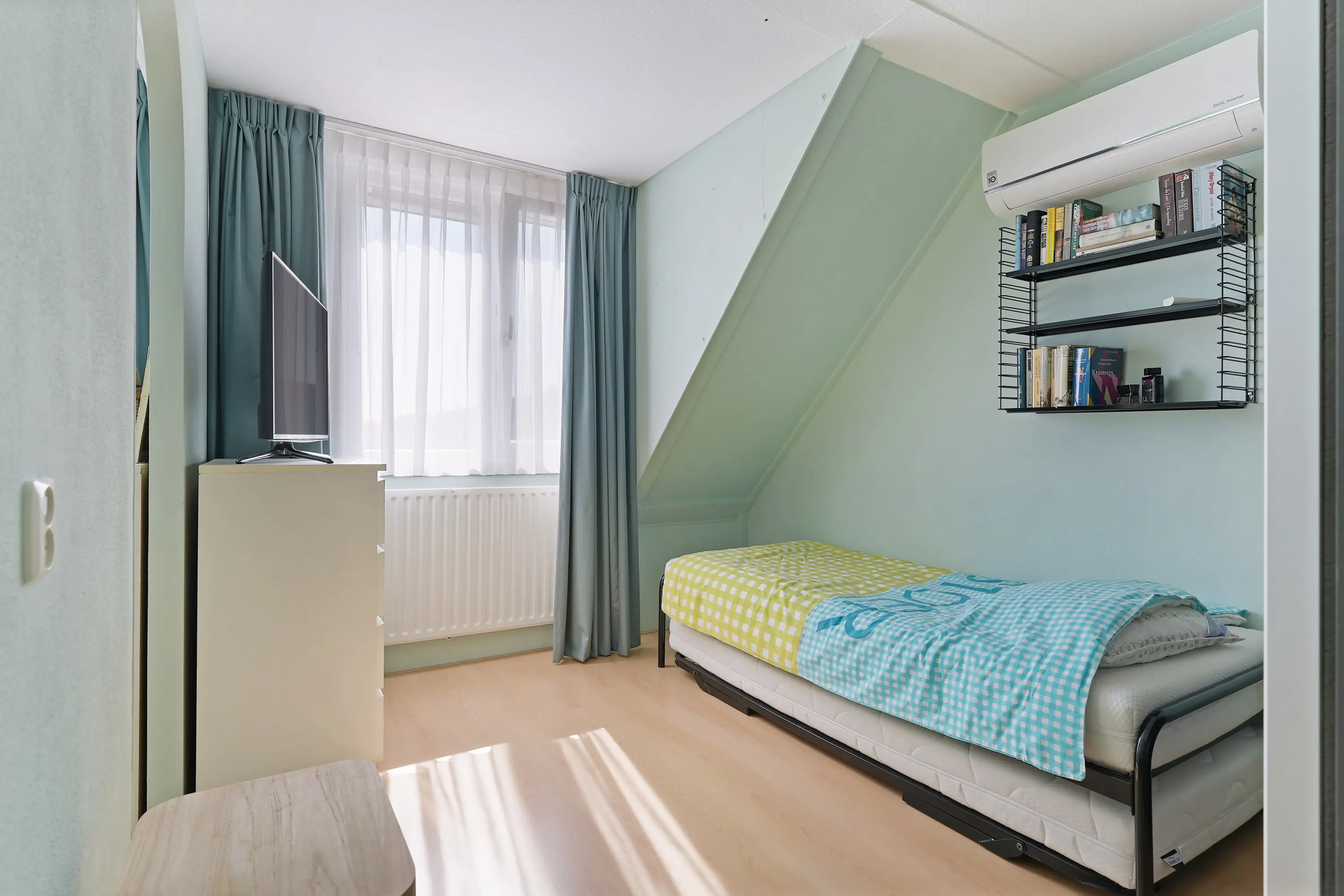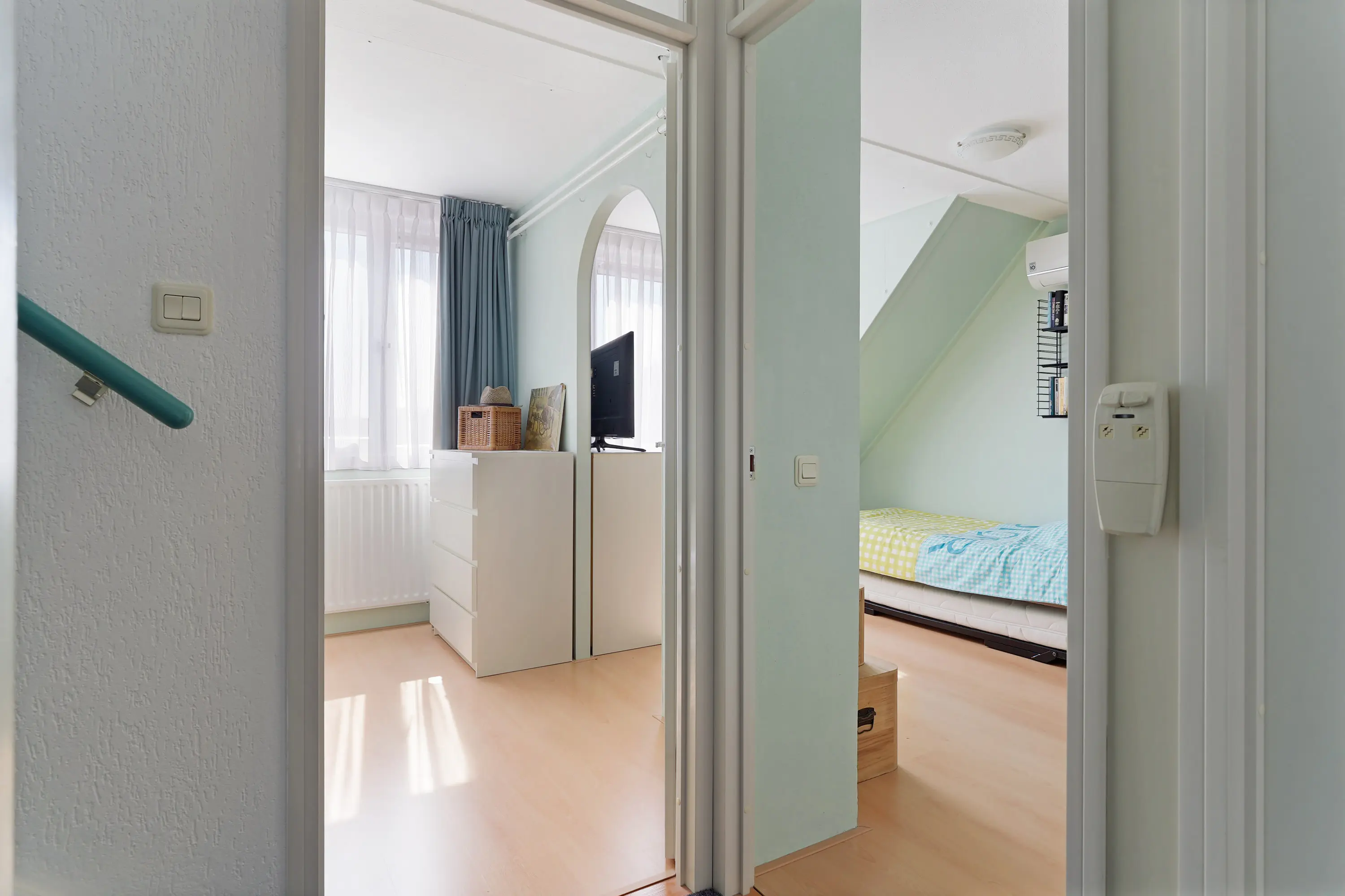 Via een vaste trap bereikt u de vierde slaapkamer. Deze royale zolderkamer beschikt over een groot dakraam en biedt veel ruimte voor slapen, werken of hobby. Op de overloop bevindt zich de wasmachine- en drogeraansluiting.