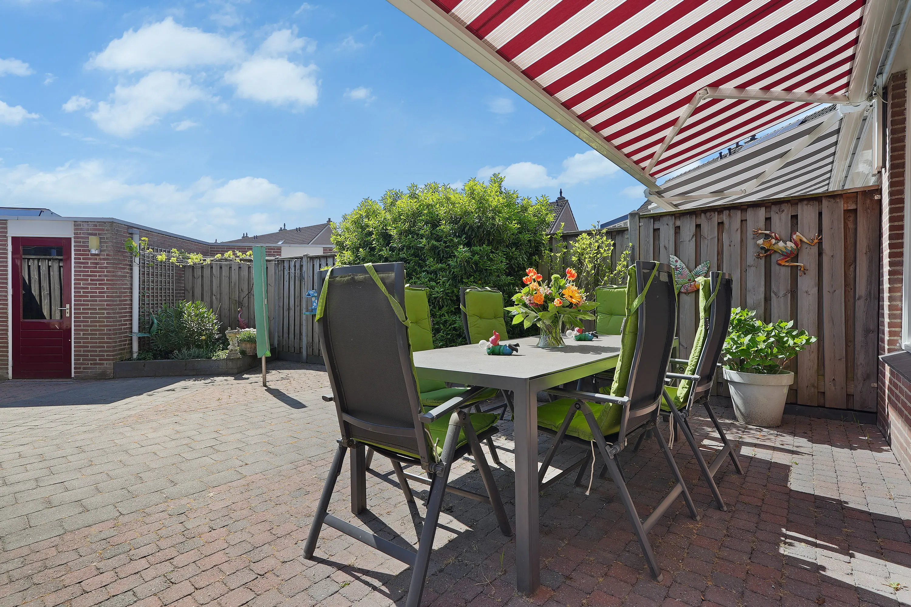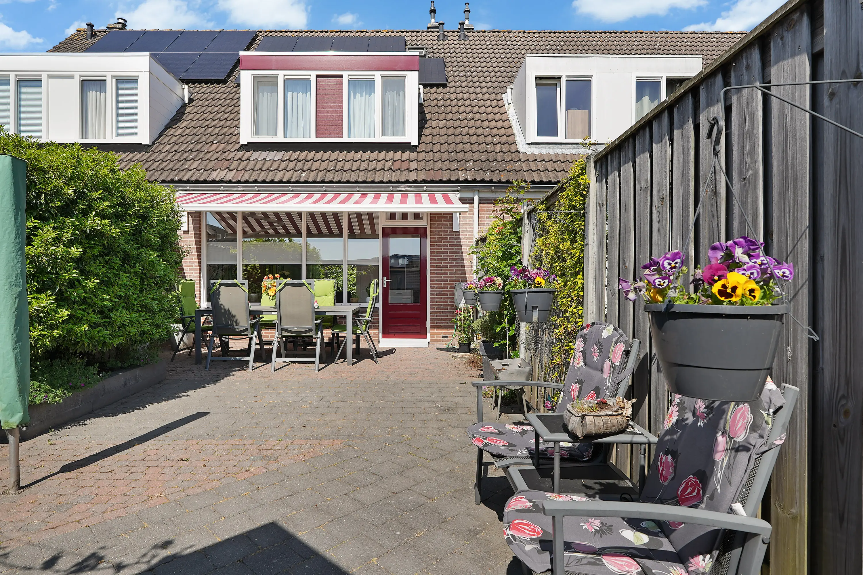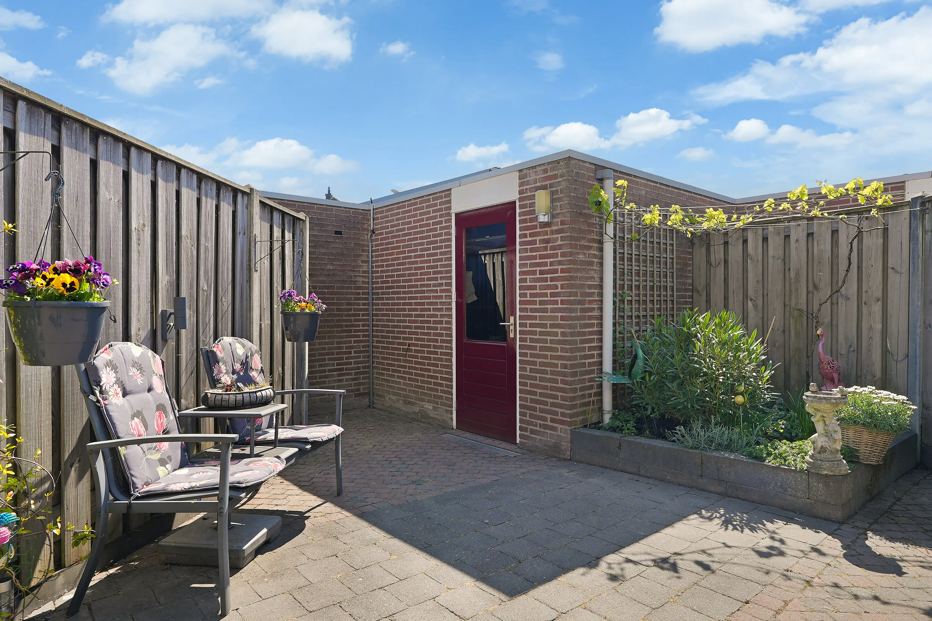 De achtertuin is verzorgd aangelegd, biedt veel privacy en ligt gunstig op het zuidoosten. Hier geniet u vrijwel de hele dag van de zon. Het ruime terras en de buitenzonwering maken het een fijne plek om te ontspannen of te tafelen. Aan de voorzijde van het huis vindt u een onderhoudsarme voortuin met ruimte voor een zitje.
