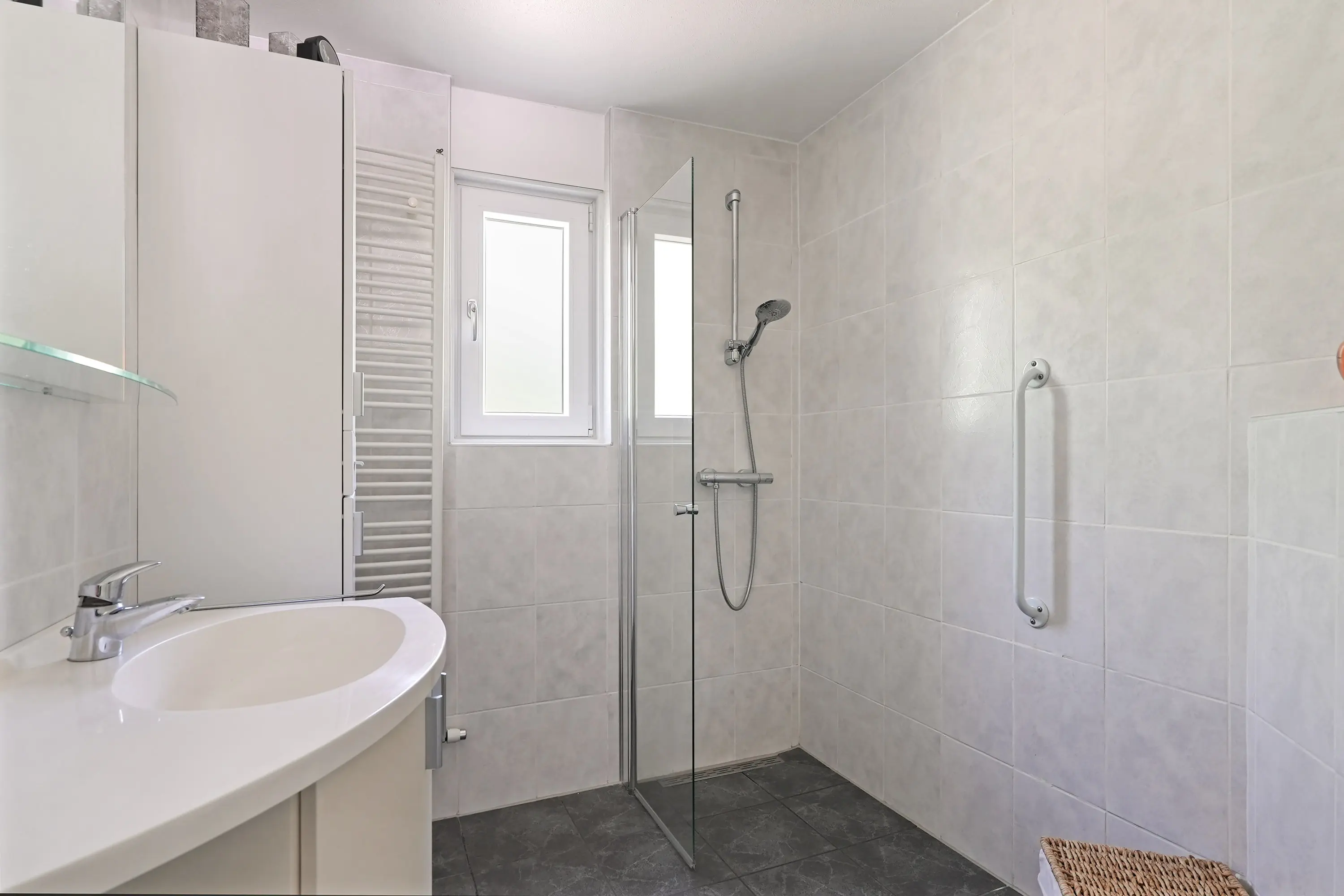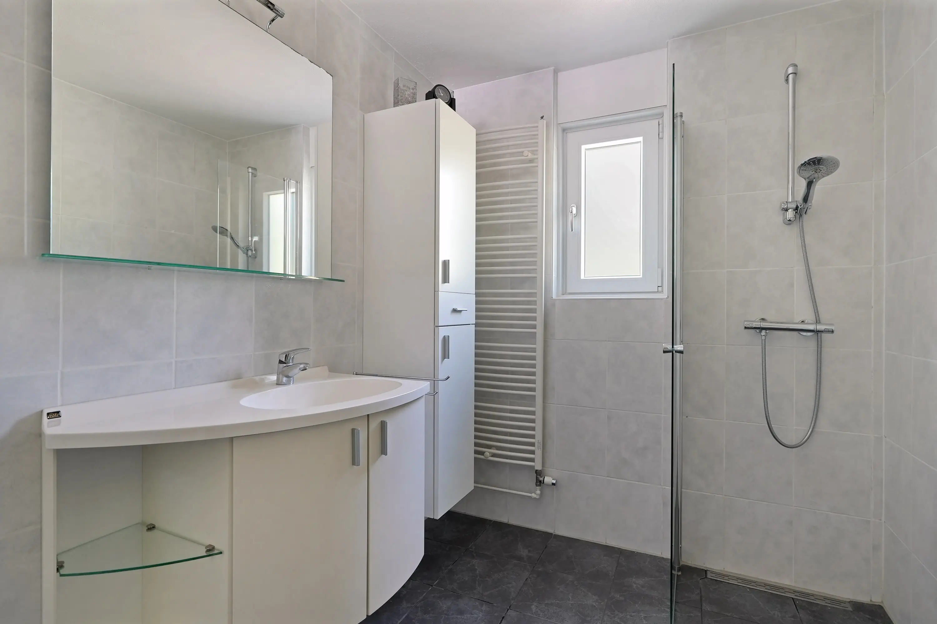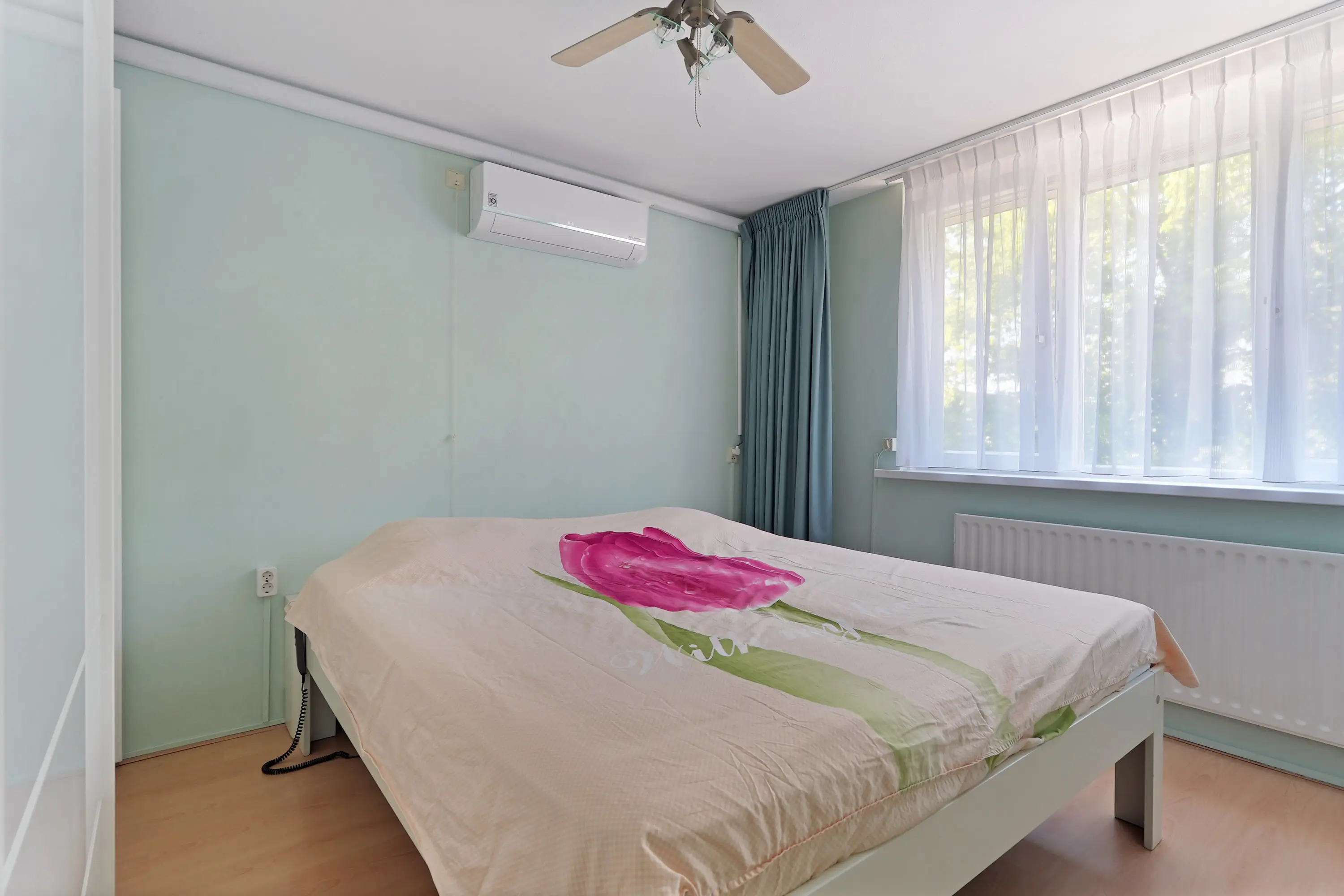 Via de overloop zijn de drie slaapkamers te bereiken, allen goed van formaat en prettig licht door de grote ramen. Tevens zijn de slaapkamers voorzien van airconditioning. De nette badkamer is geheel betegeld en uitgerust met een inloopdouche, wastafelmeubel en toilet.