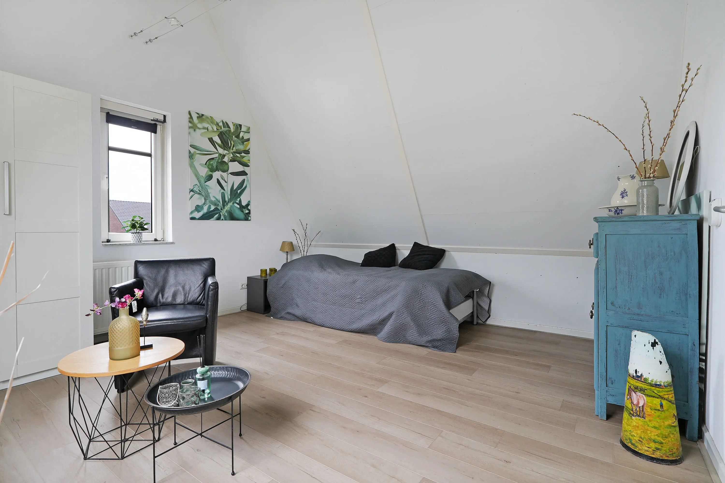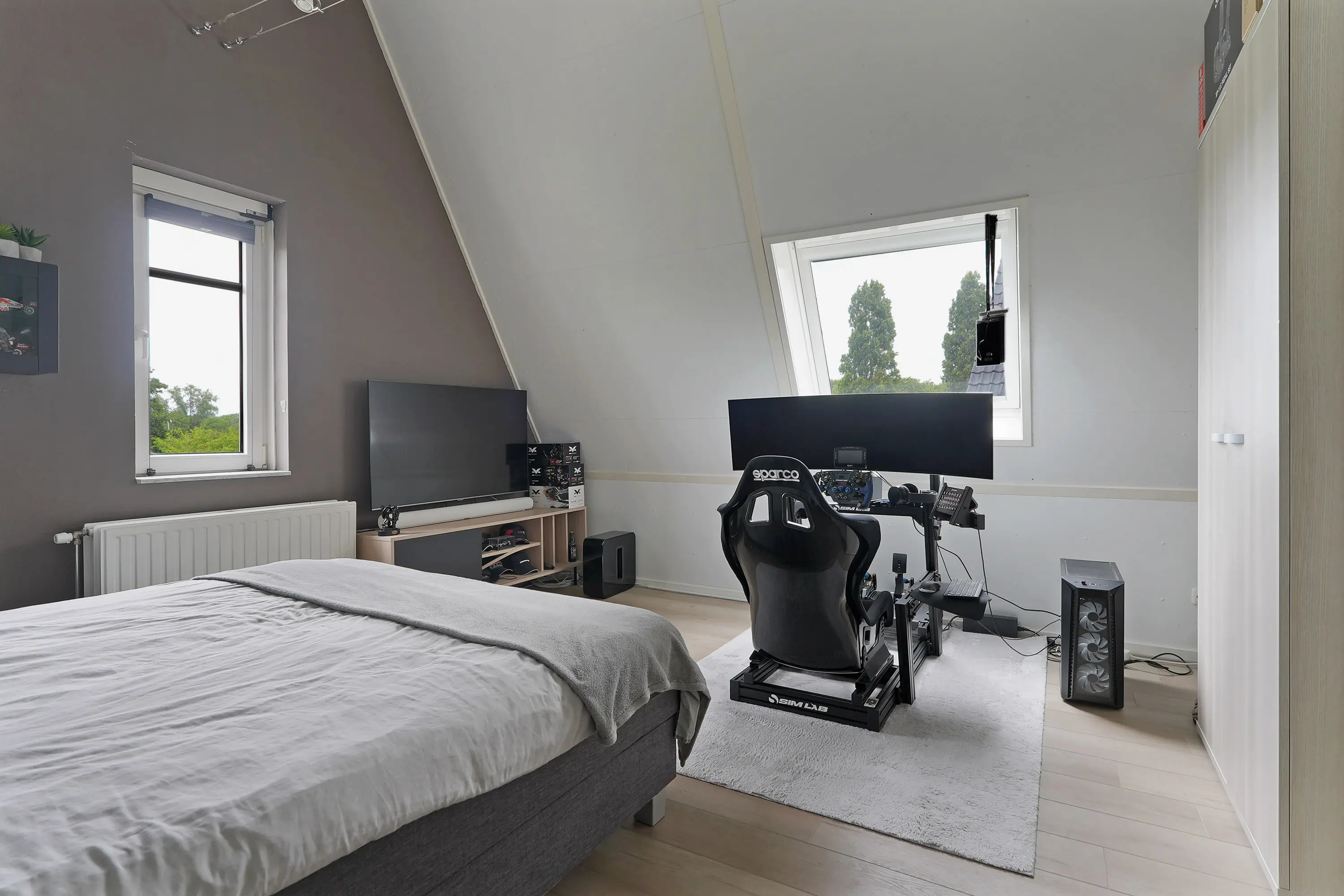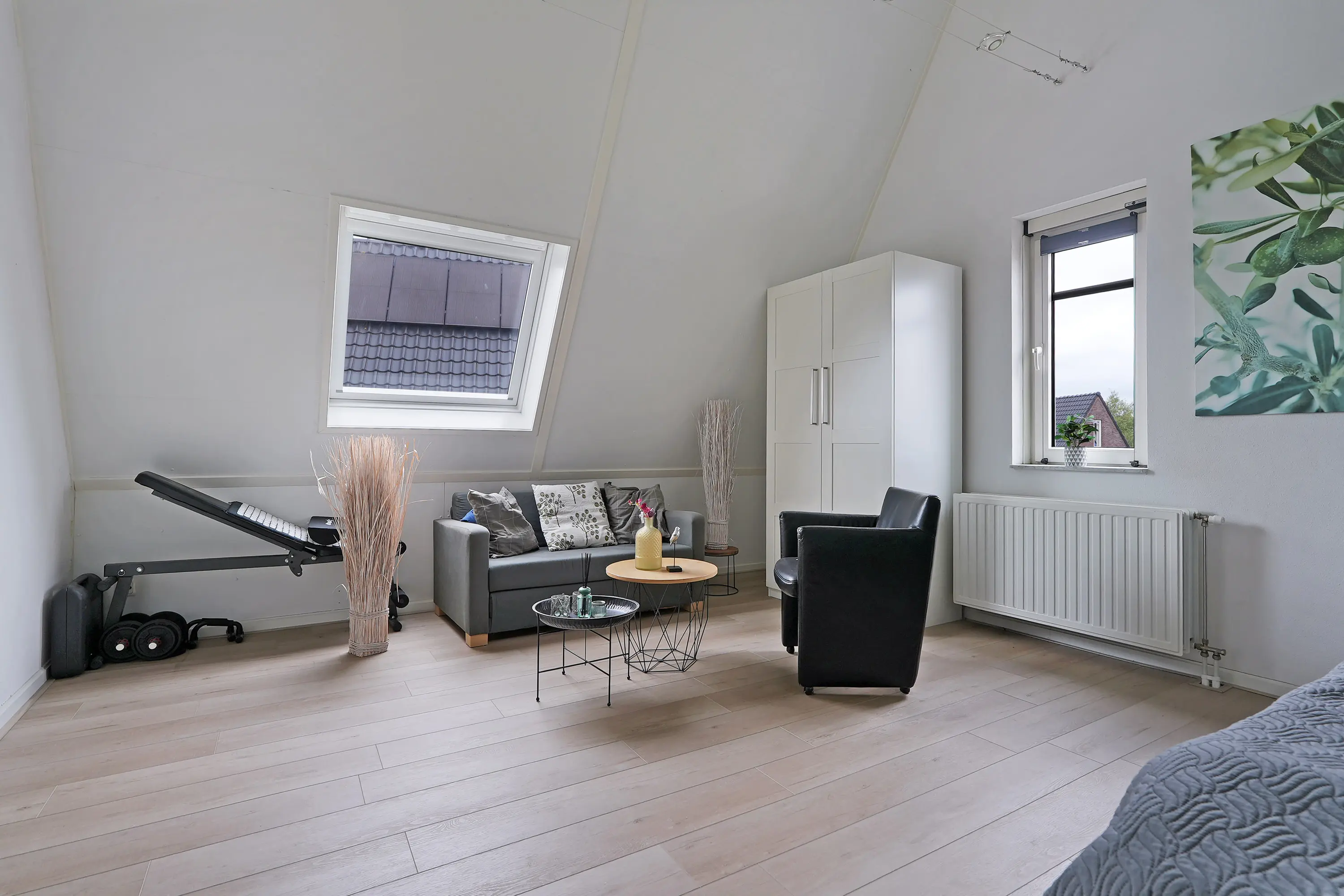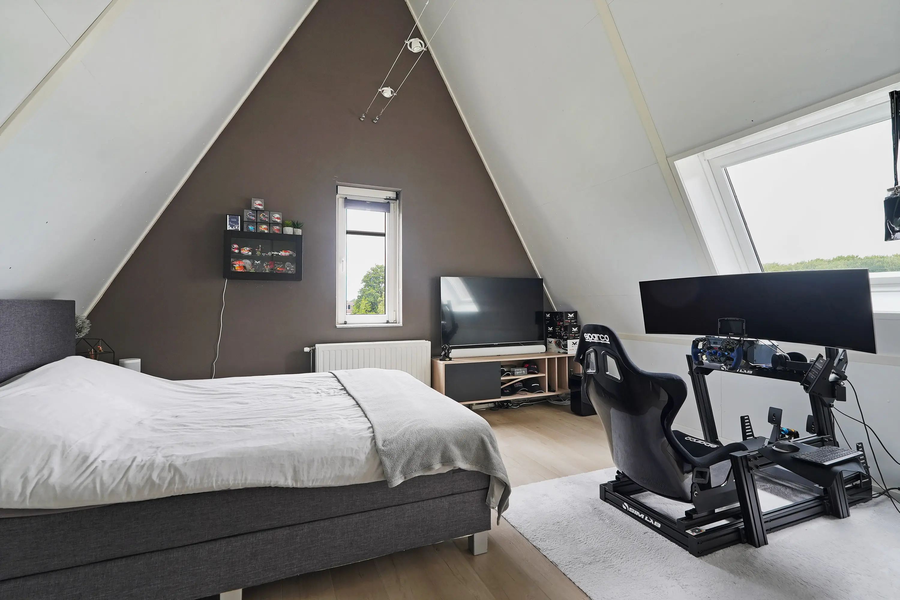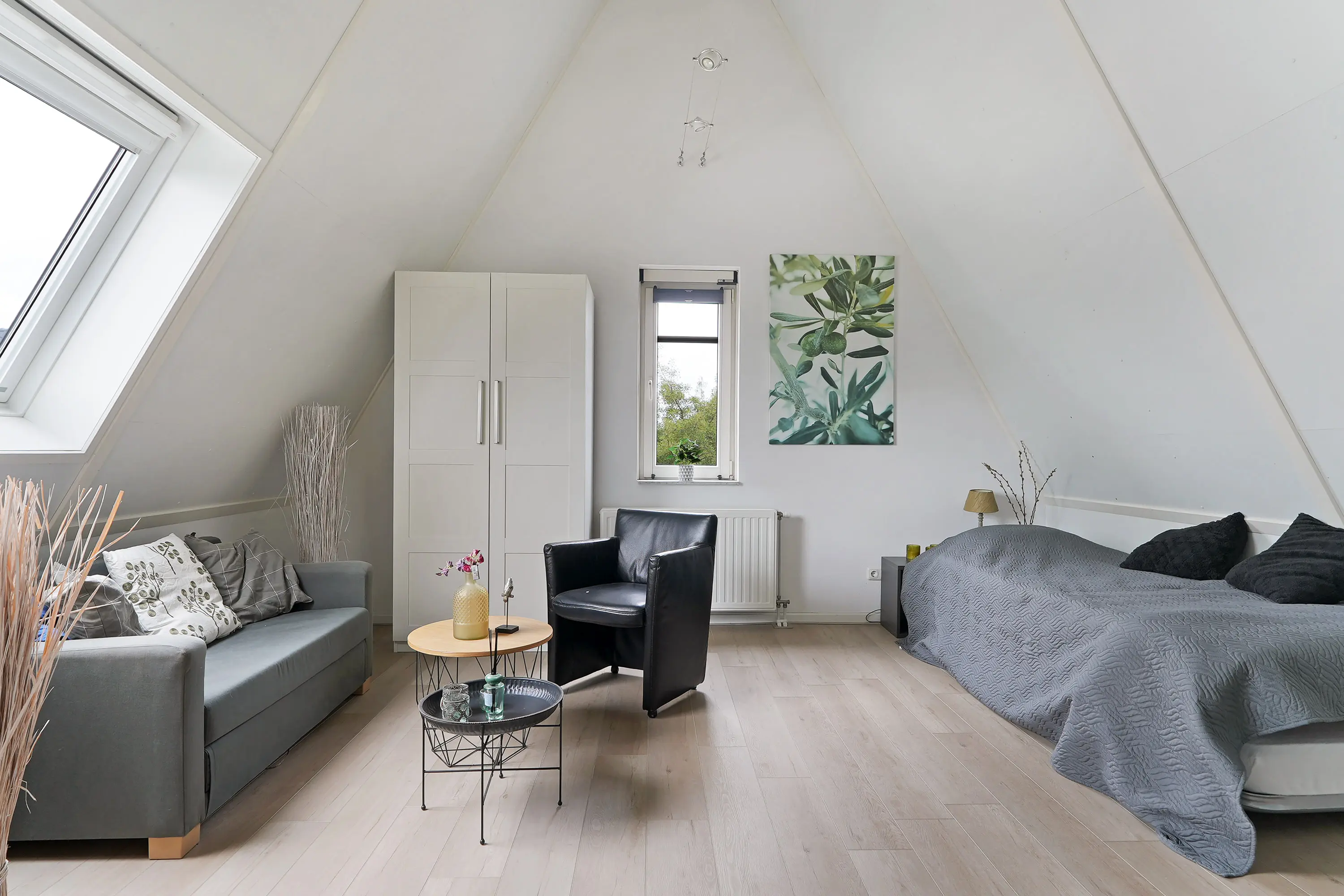 Bereikbaar via de vaste trapopgang bereikt u een meer dan volwaardige verdieping met een bijzonder hoge nok. De overloop biedt toegang tot nog eens 2 zeer ruime slaapkamers met grote dakramen en raampartijen in de kopgevels. Op de overloop treft u verder vaste kasten en een ruimte met daar de hybride warmtepomp. Via de vlizotrap bereikt u de opbergzolder.