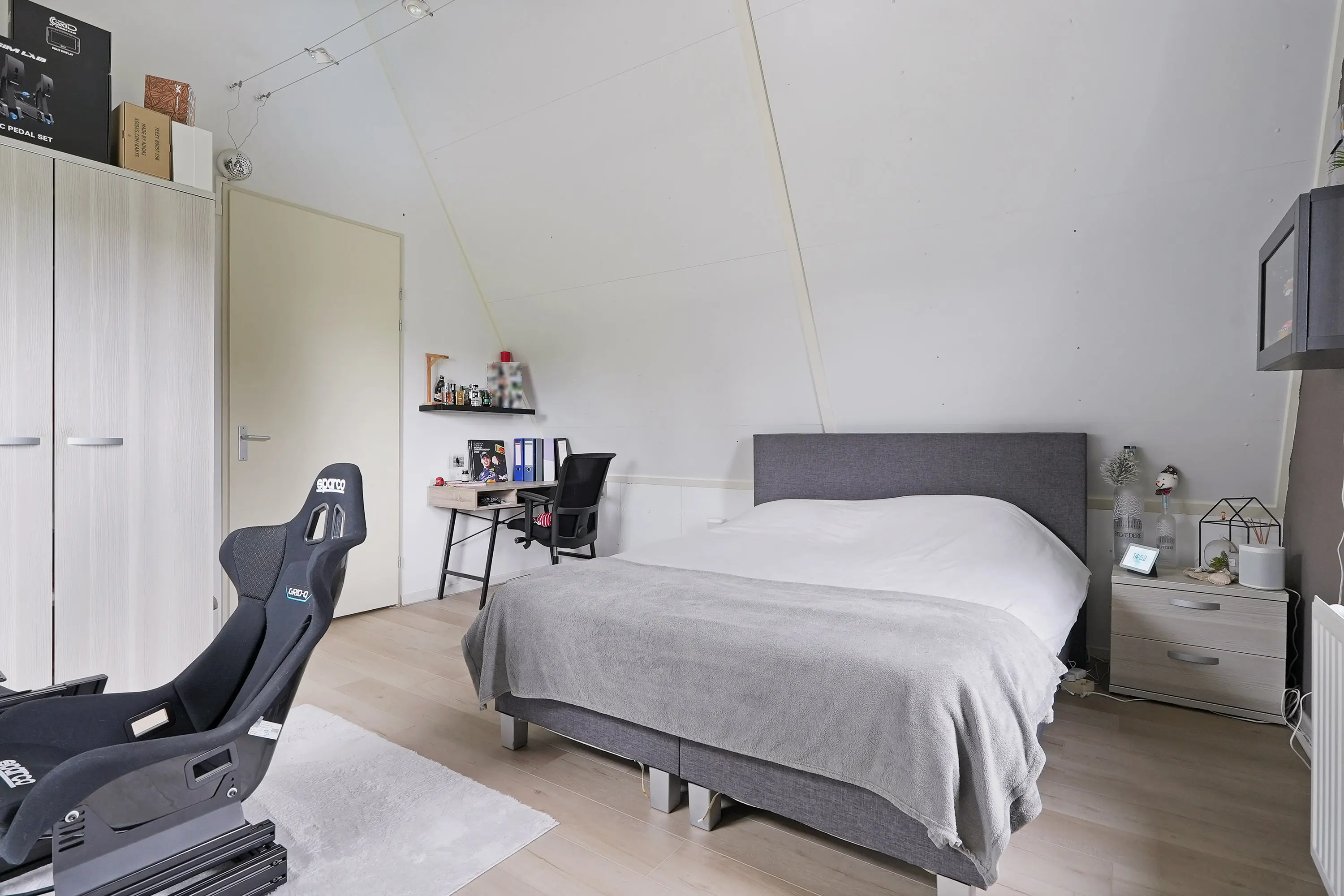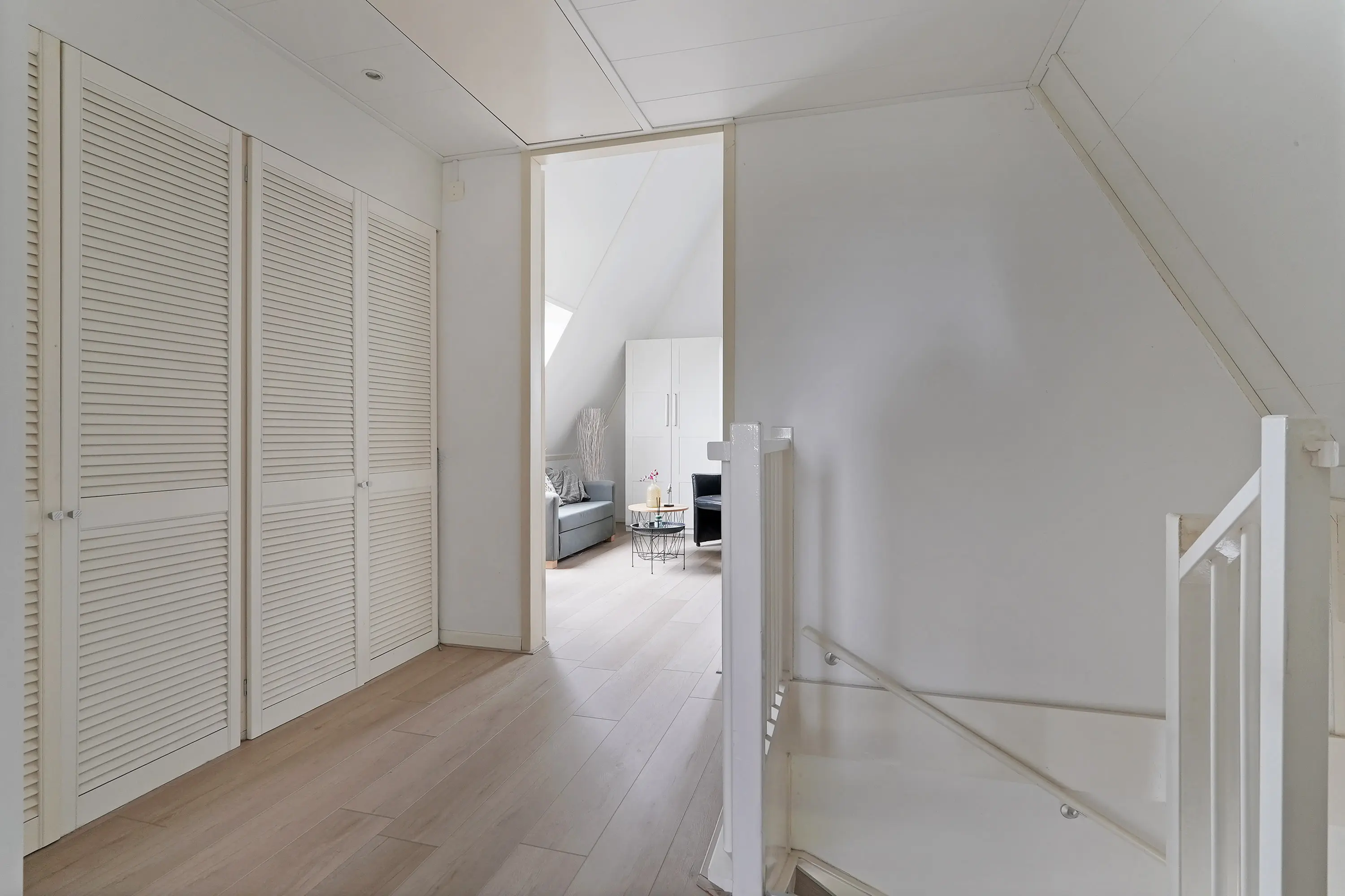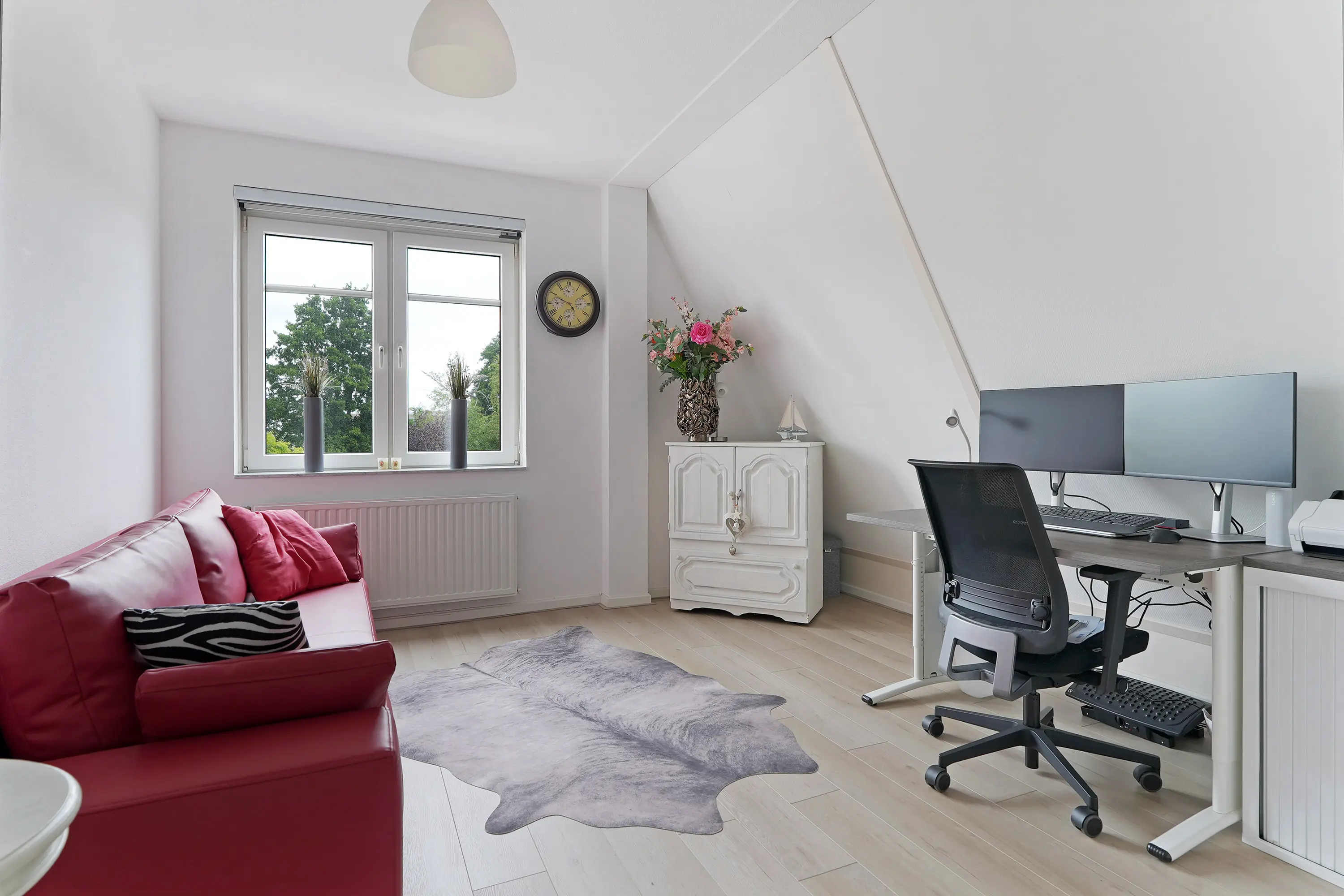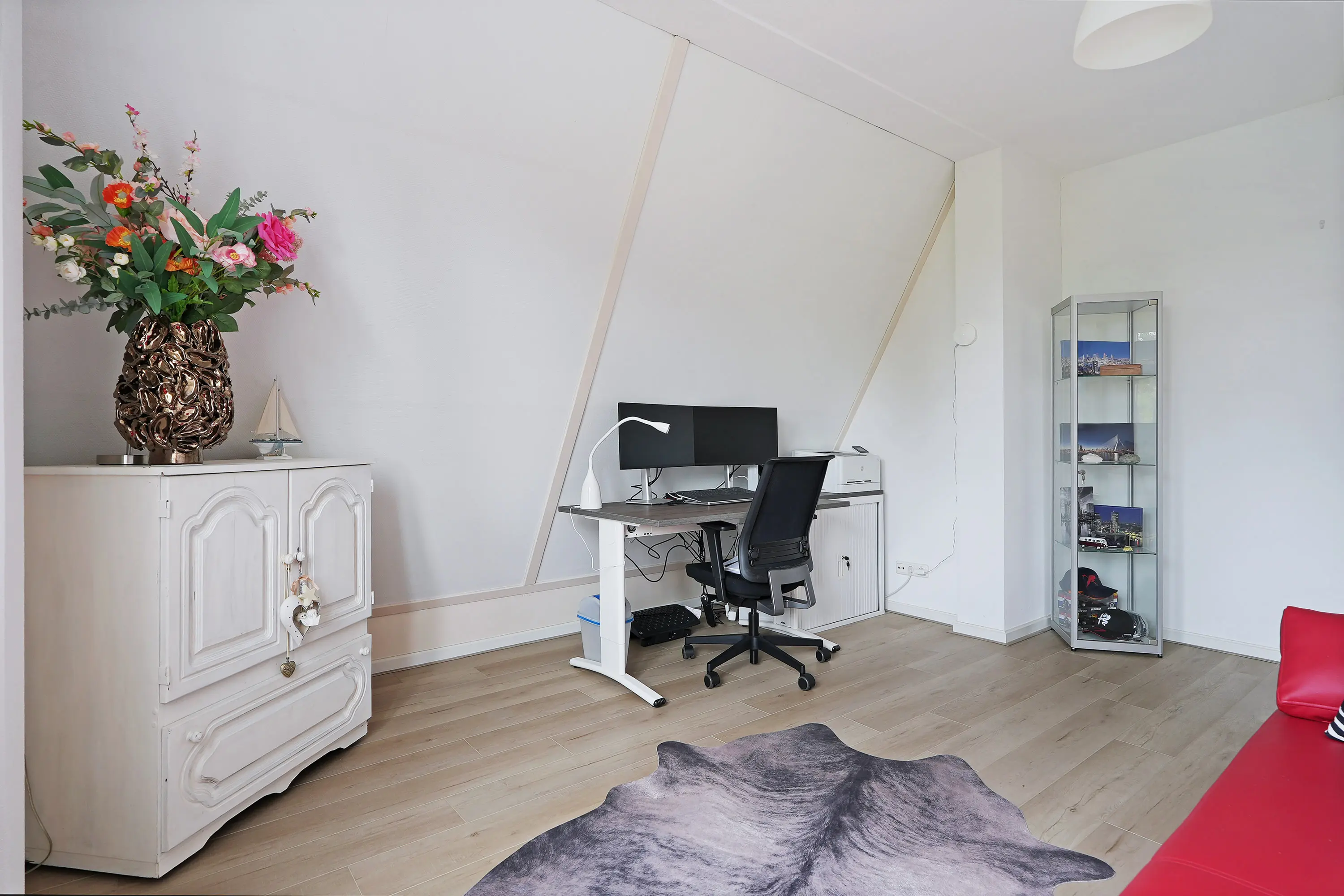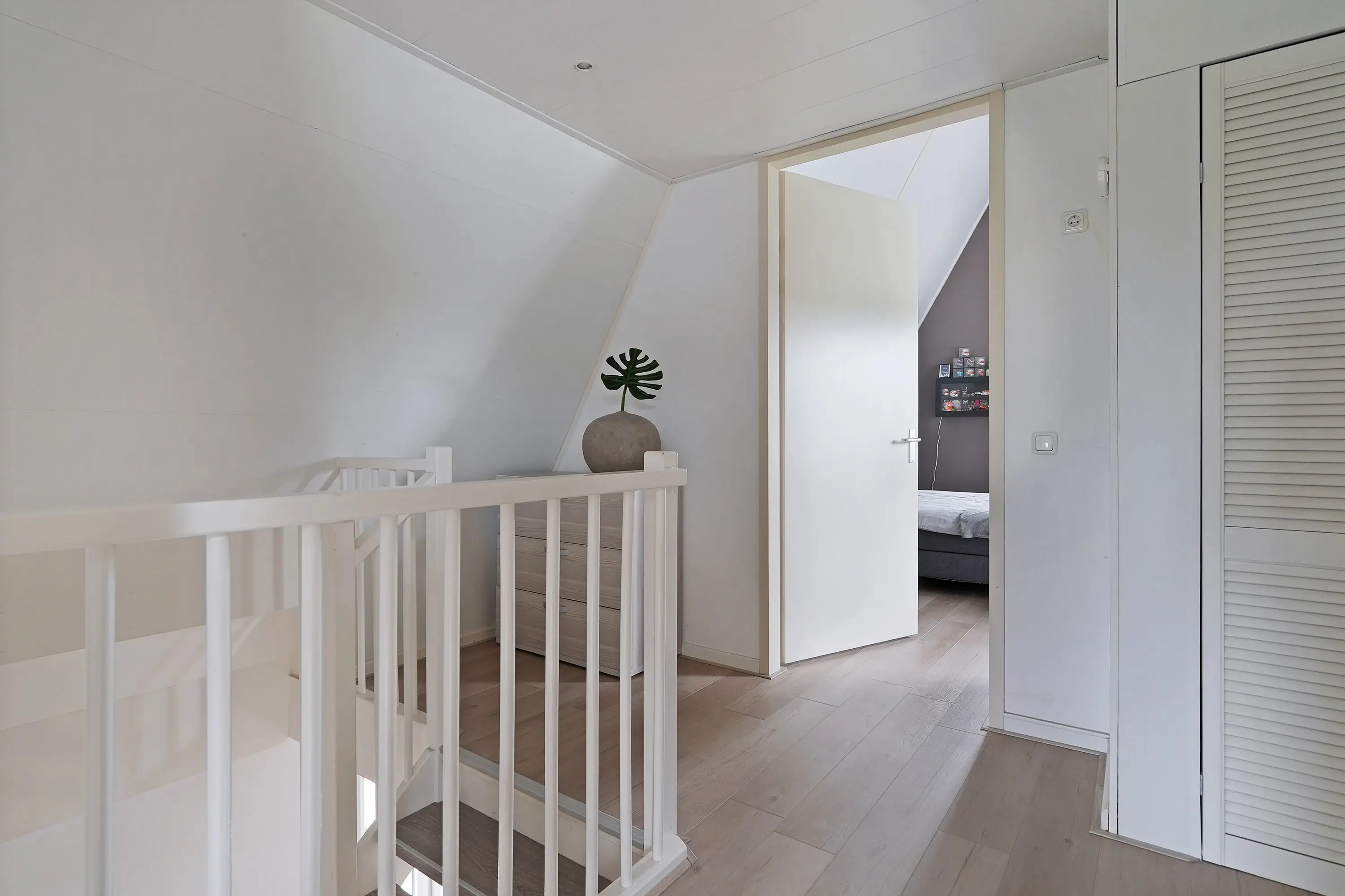 Bereikbaar via de vaste trapopgang bereikt u een meer dan volwaardige verdieping met een bijzonder hoge nok. De overloop biedt toegang tot nog eens 2 zeer ruime slaapkamers met grote dakramen en raampartijen in de kopgevels. Op de overloop treft u verder vaste kasten en een ruimte met daar de hybride warmtepomp. Via de vlizotrap bereikt u de opbergzolder.